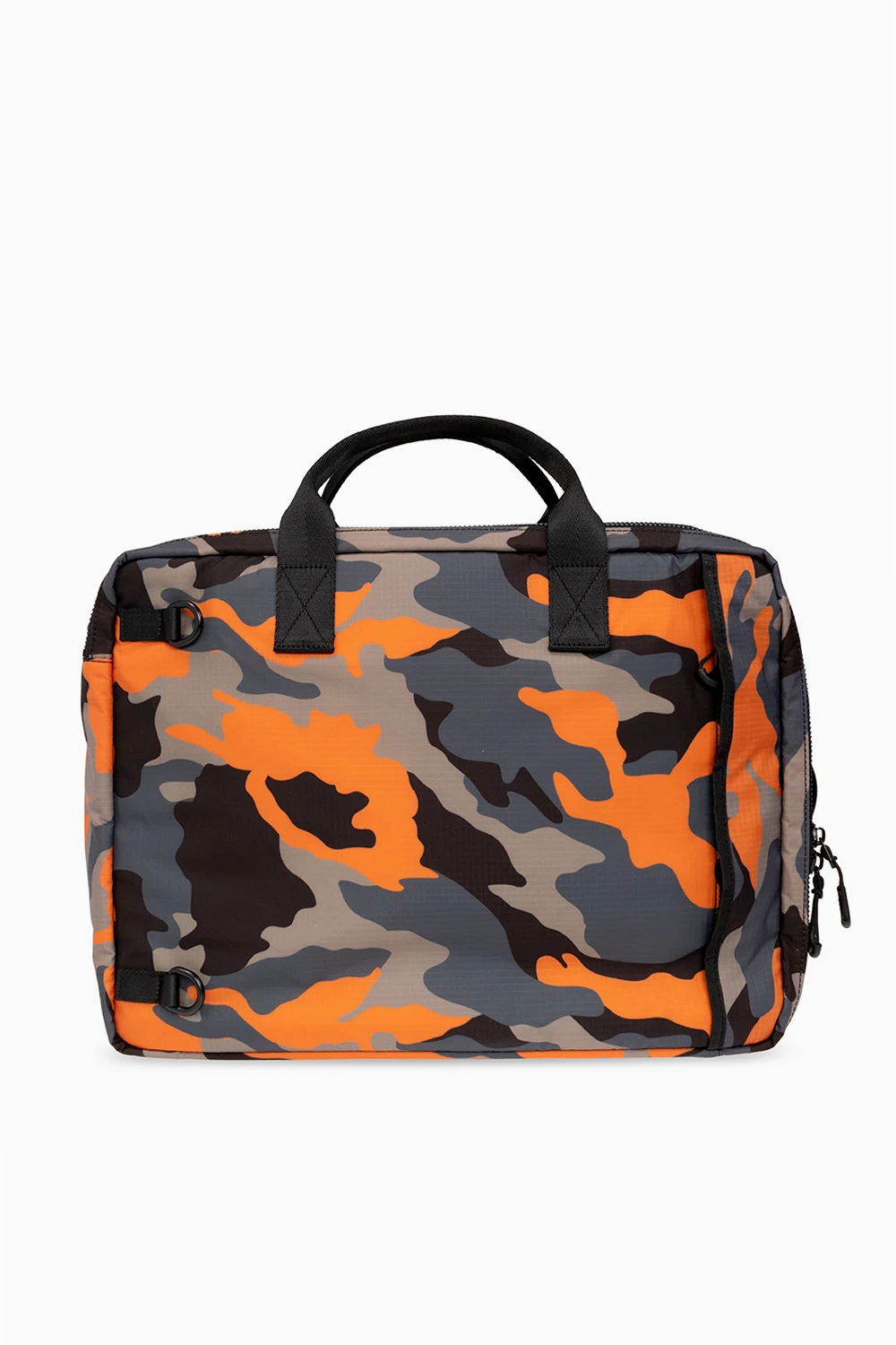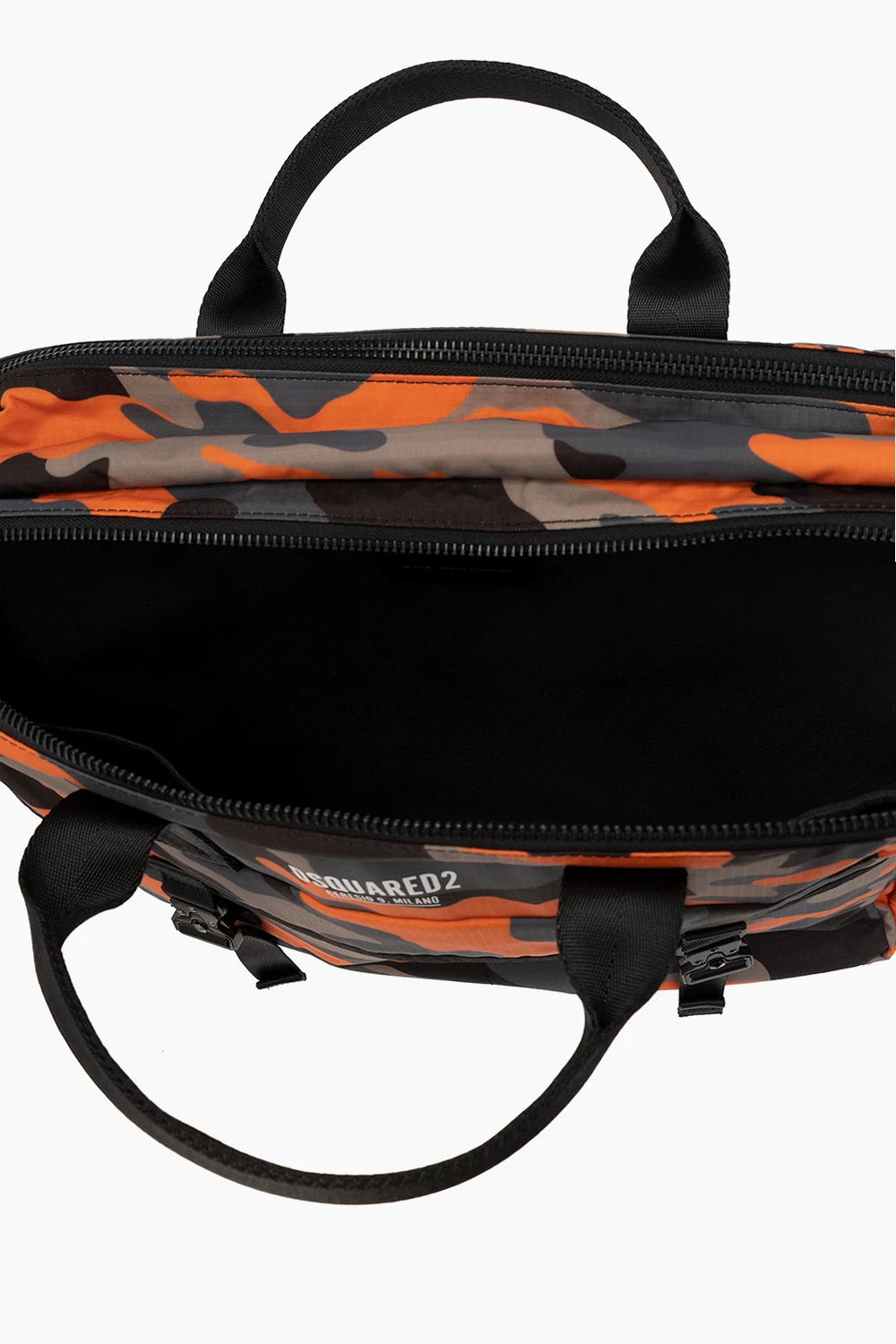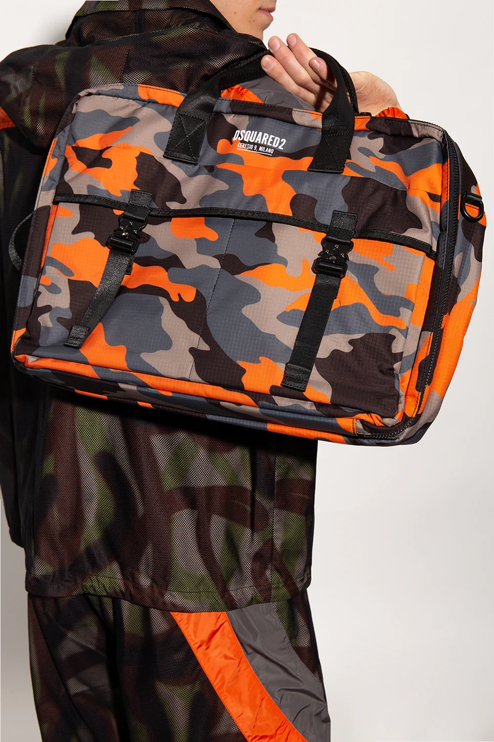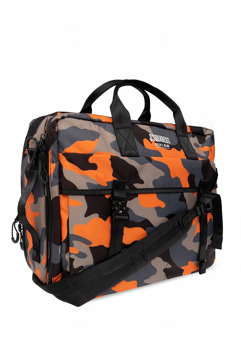 Kolorowa torba na ramię, model ‘Ceresio 9’ Dsquared2. Wykonana z lekkiego, wodoodpornego materiału ‘Ripstop’. Zamykana na dwubiegunowy zamek. Ozdobiona wzorem ‘moro’. Z przodu nadrukowane logo w kolorze białym oraz dwie kieszenie z patkami na pasek z klamrą. Z tyłu kieszeń zamykana na zamek. Dwie półokrągłe rączki oraz odpinany pas na ramię z możliwością regulacji długości. Z tyłu dodatkowe uchwyty pozwalające zapiąć pas jako szelki – możliwość noszenia torby jako plecak. Dwie oddzielne komory z czterema kieszeniami: dwiema wsuwanymi, kieszenią na rzep oraz zamek.