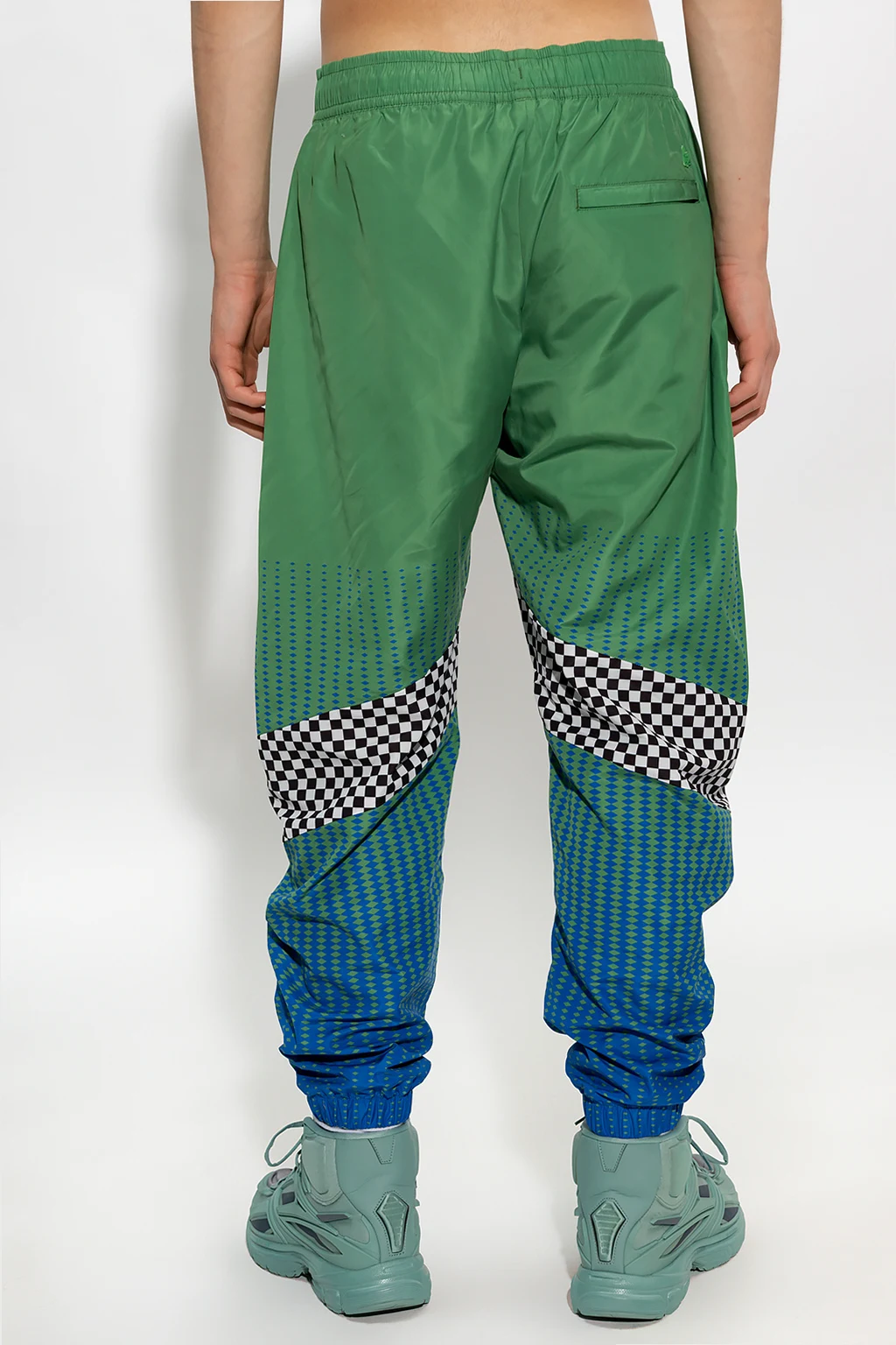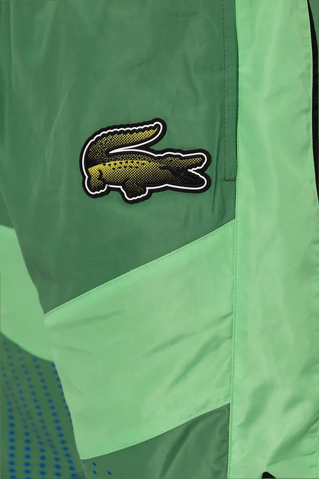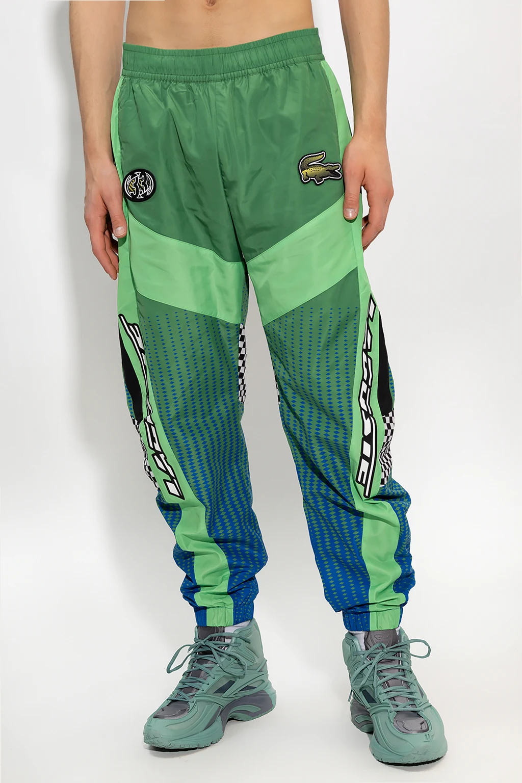 Kolorowe spodnie ortalionowe Lacoste. Wykonane z hydrofobowego materiału. W pasie wszyta guma ściągana trokami. Ozdobione naszywką i nadrukiem z logo oraz wzorem. Trzy kieszenie zapinane na zamek. Długie nogawki zakończone ściągaczem.