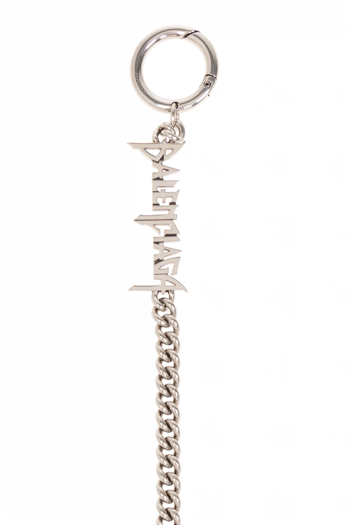 Na jednym końcu tego wyjątkowego akcesorium znajduje się duże, okrągłe ogniwo, idealne do przypięcia do paska lub szlufki, a na drugim - funkcjonalny karabińczyk, umożliwiający łatwe mocowanie do elementów odzieży. Centralną część łańcucha zdobi ozdobny element z napisem , który jest charakterystyczną cechą marki Balenciaga, dodającą ekskluzywności i podkreślającą przynależność do elitarnego świata mody.
