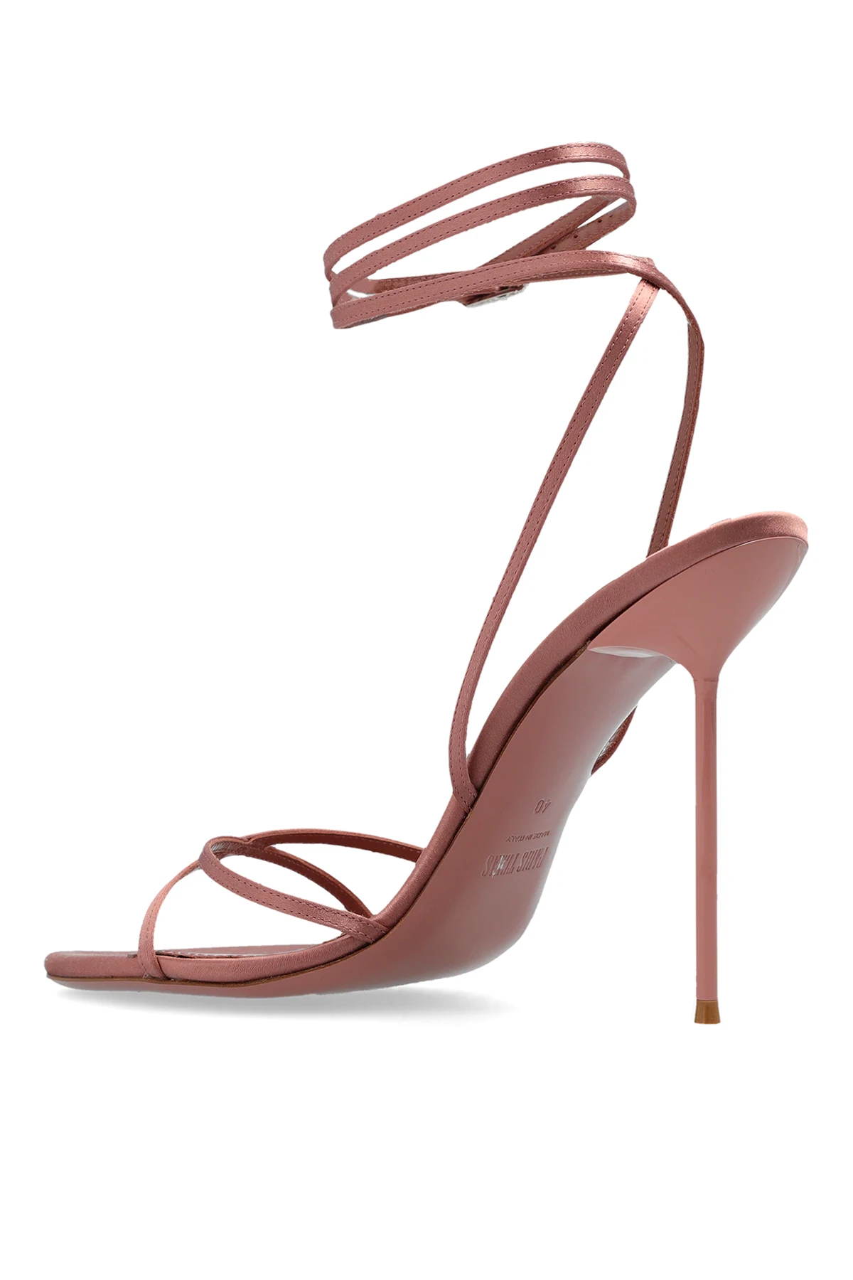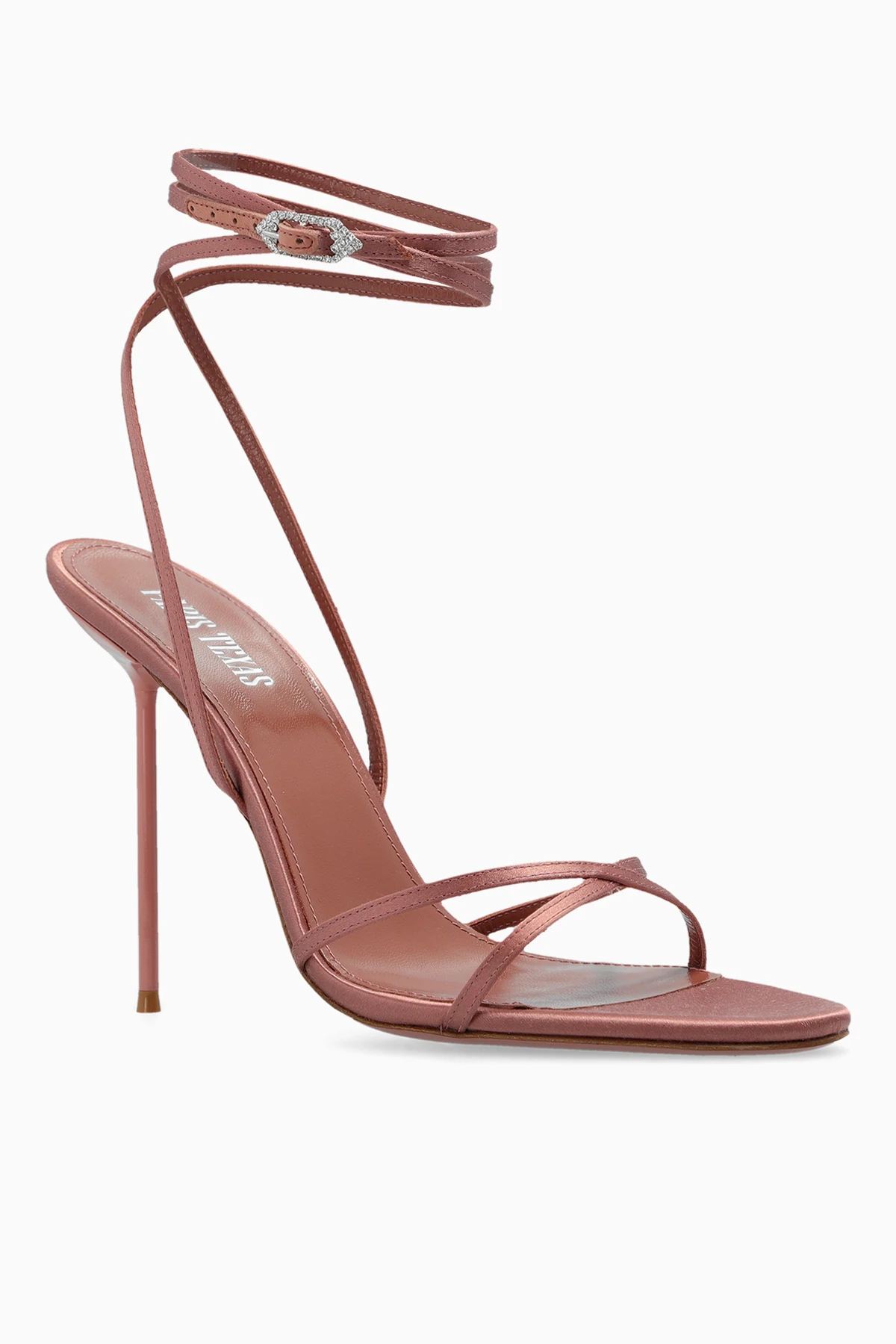 Różowe, satynowe sandały na szpilce, model ‘Liz’ Paris Texas. Zapinane z boku na klamrę na pasku biegnący dookoła kostki. Metalowa klamra wysadzana kryształami w kolorze srebrnym. Różowa podeszwa wykonana z lakierowanej skóry.