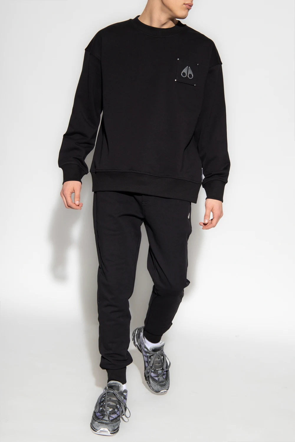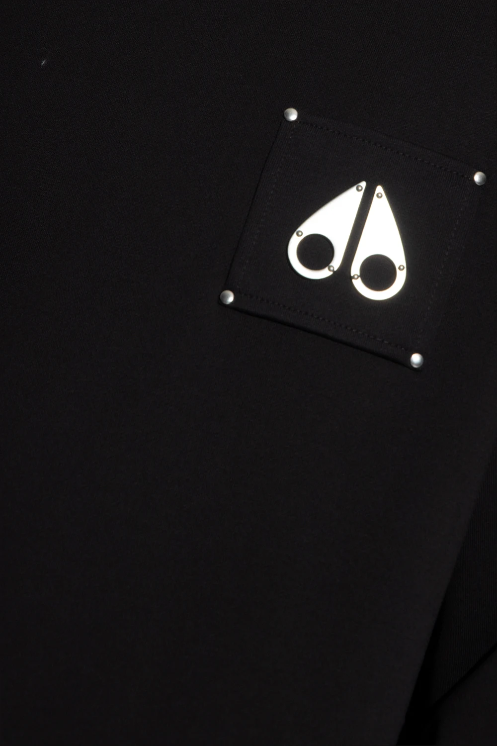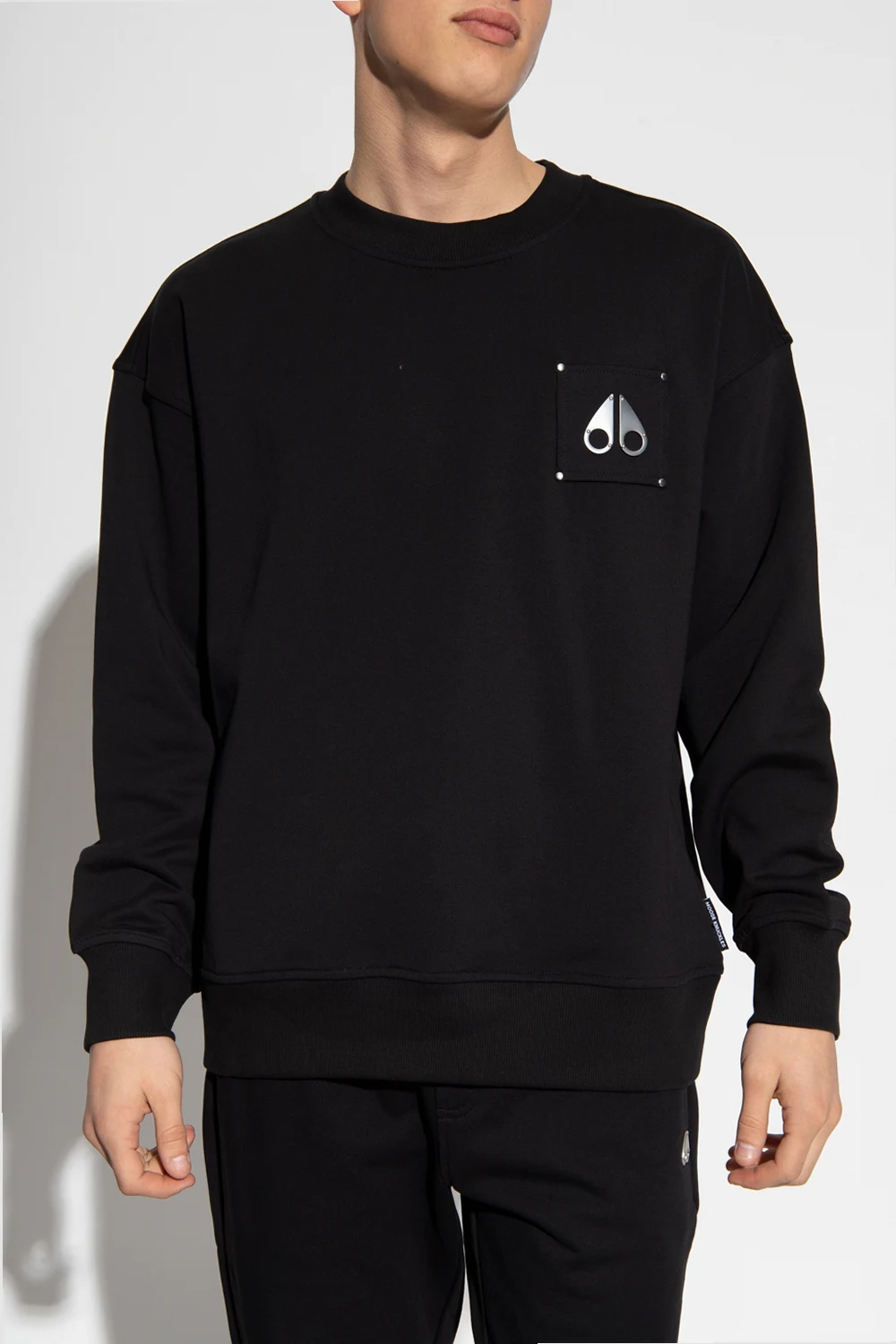 Czarna bluza Moose Knuckles. Wykonana z bawełny. Aplikacja w kształcie logo w kolorze srebrnym. Okrągły dekolt. Zakończona ściągaczami.