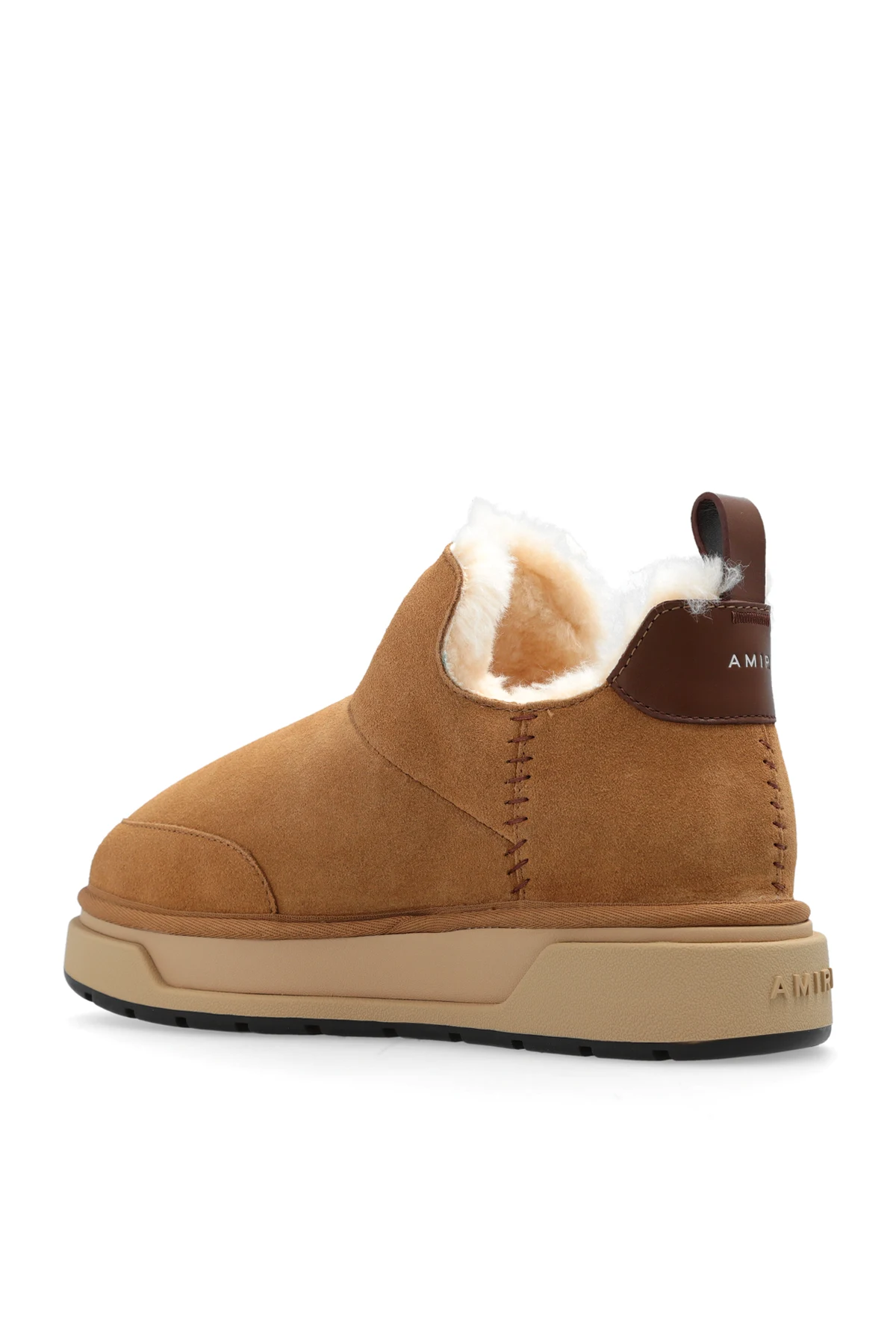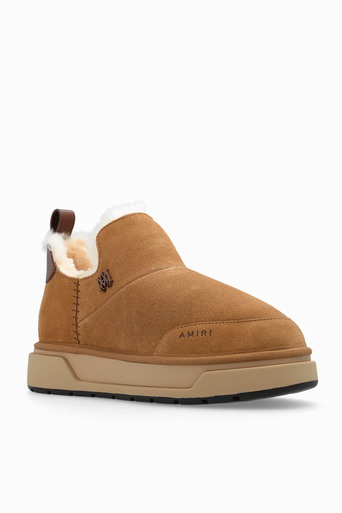 Brązowe, wsuwane buty, model ‘Malibu’ Amiri. Wykonane z zamszu. Ocieplana warstwa wewnętrzna. Ozdobione aplikacją w kształcie monogramu i wytłoczonym logo. Beżowo-czarna, gumowa podeszwa.