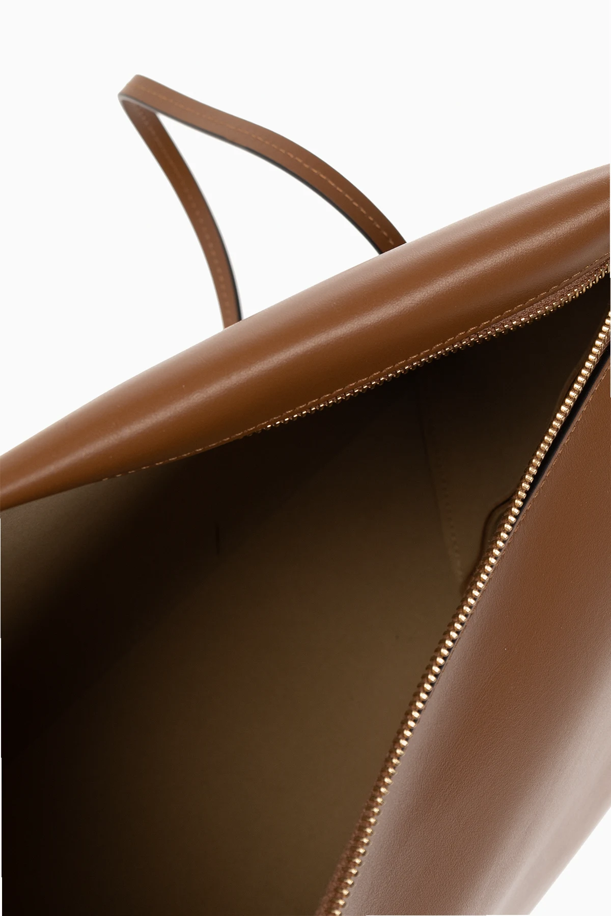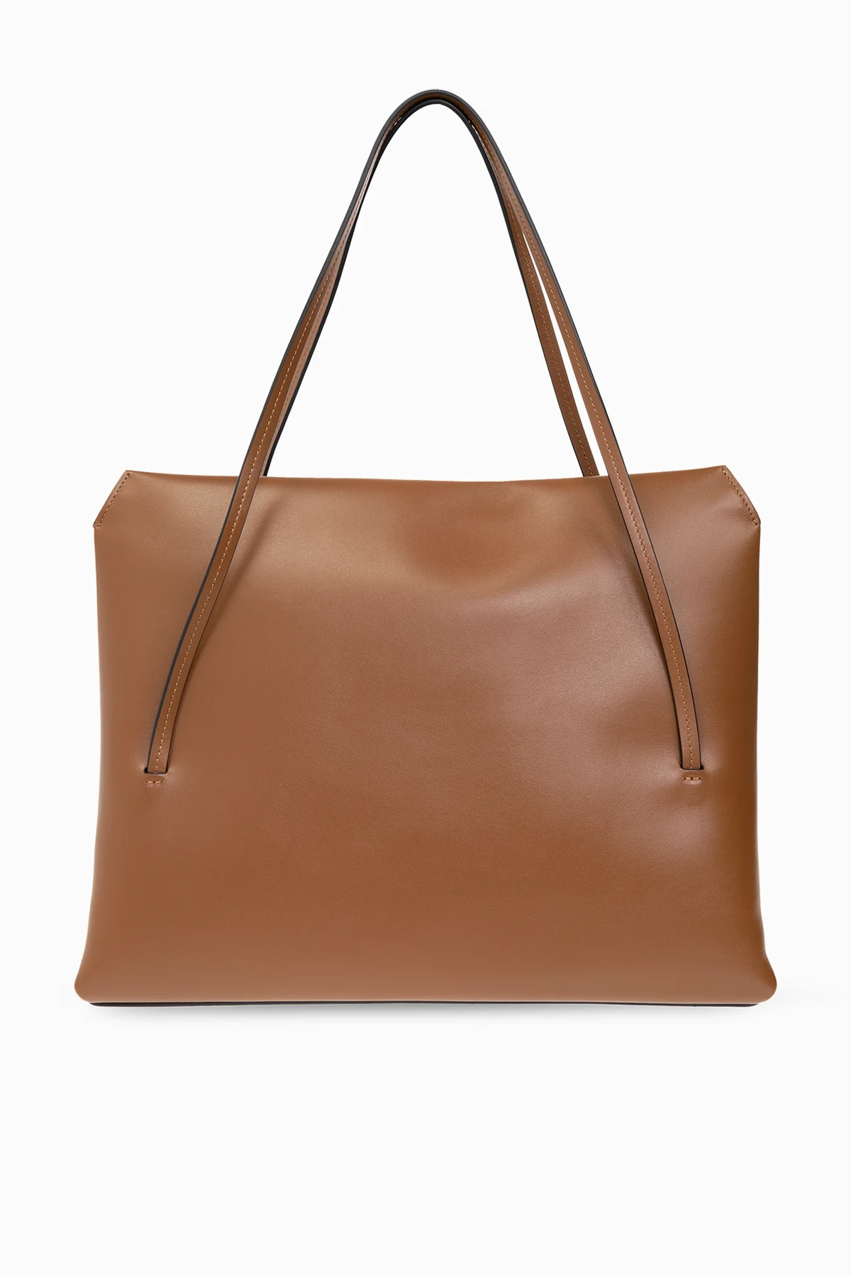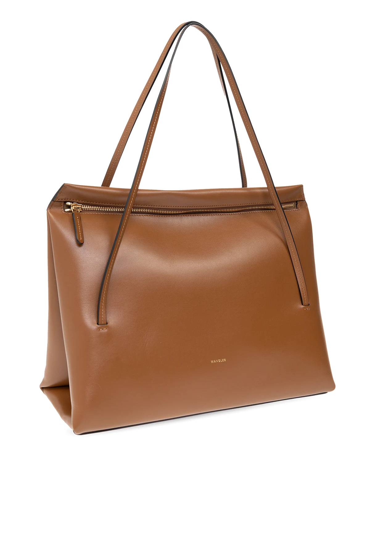 Brązowa torba typu 'shopper', model 'Joanna Big' Wandler. Wykonana ze skóry cielęcej. Zamykana na zamek oraz magnes. Z przodu nadrukowane logo. Dwie półokrągłe rączki. Wewnątrz komora. Metalowe elementy w kolorze złotym.