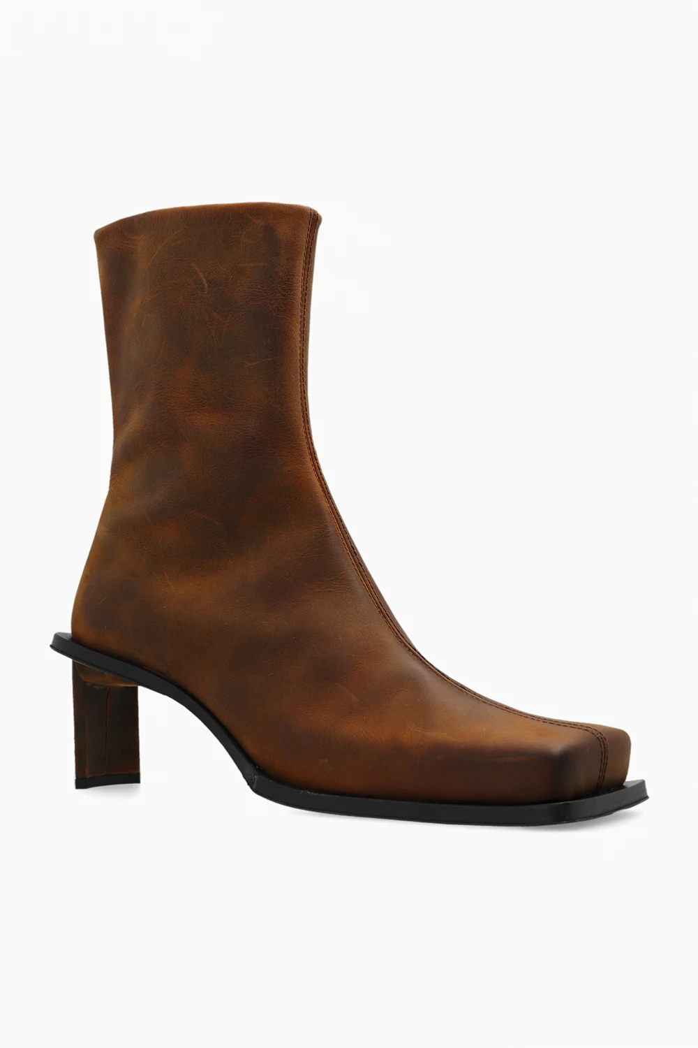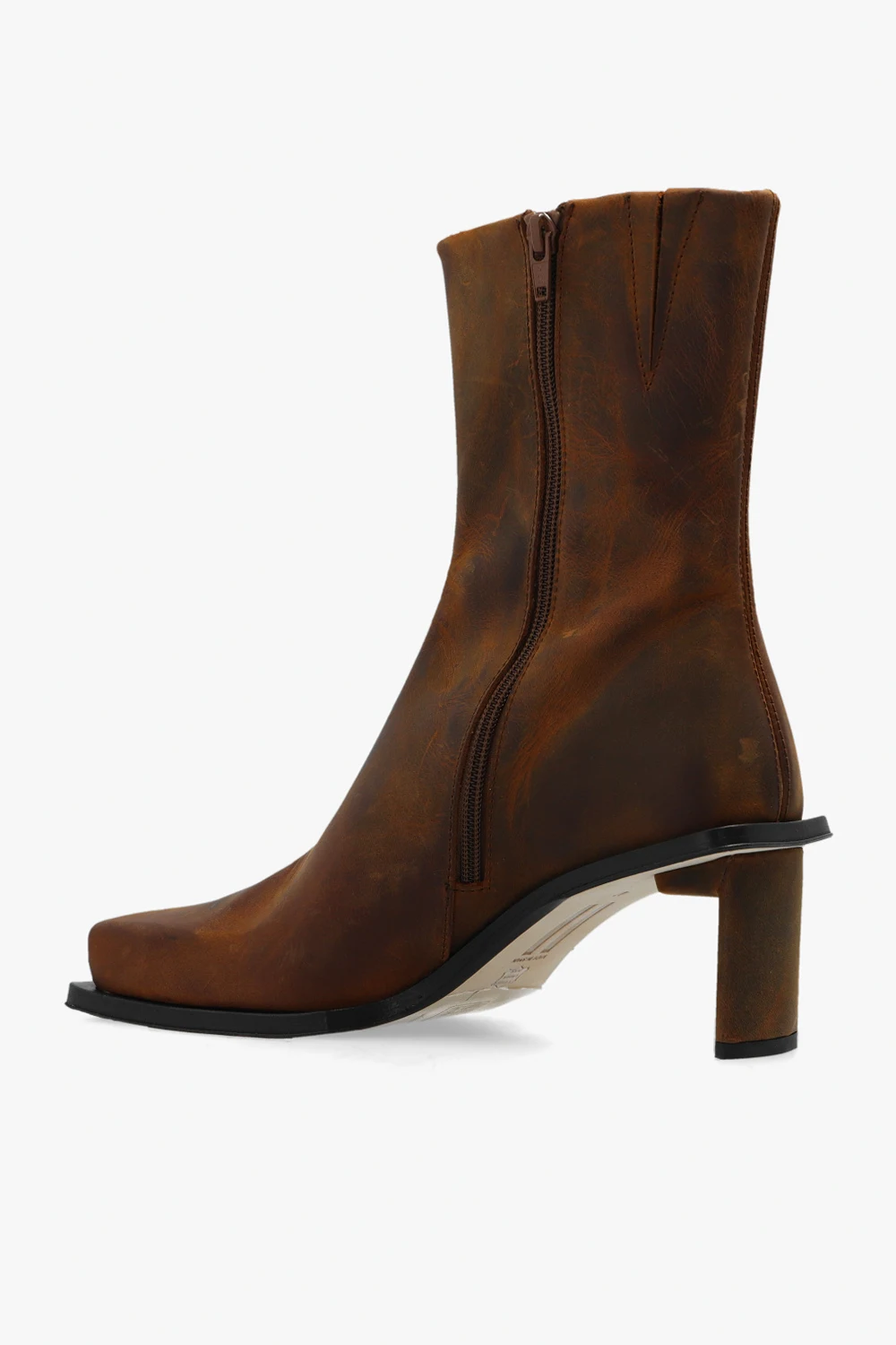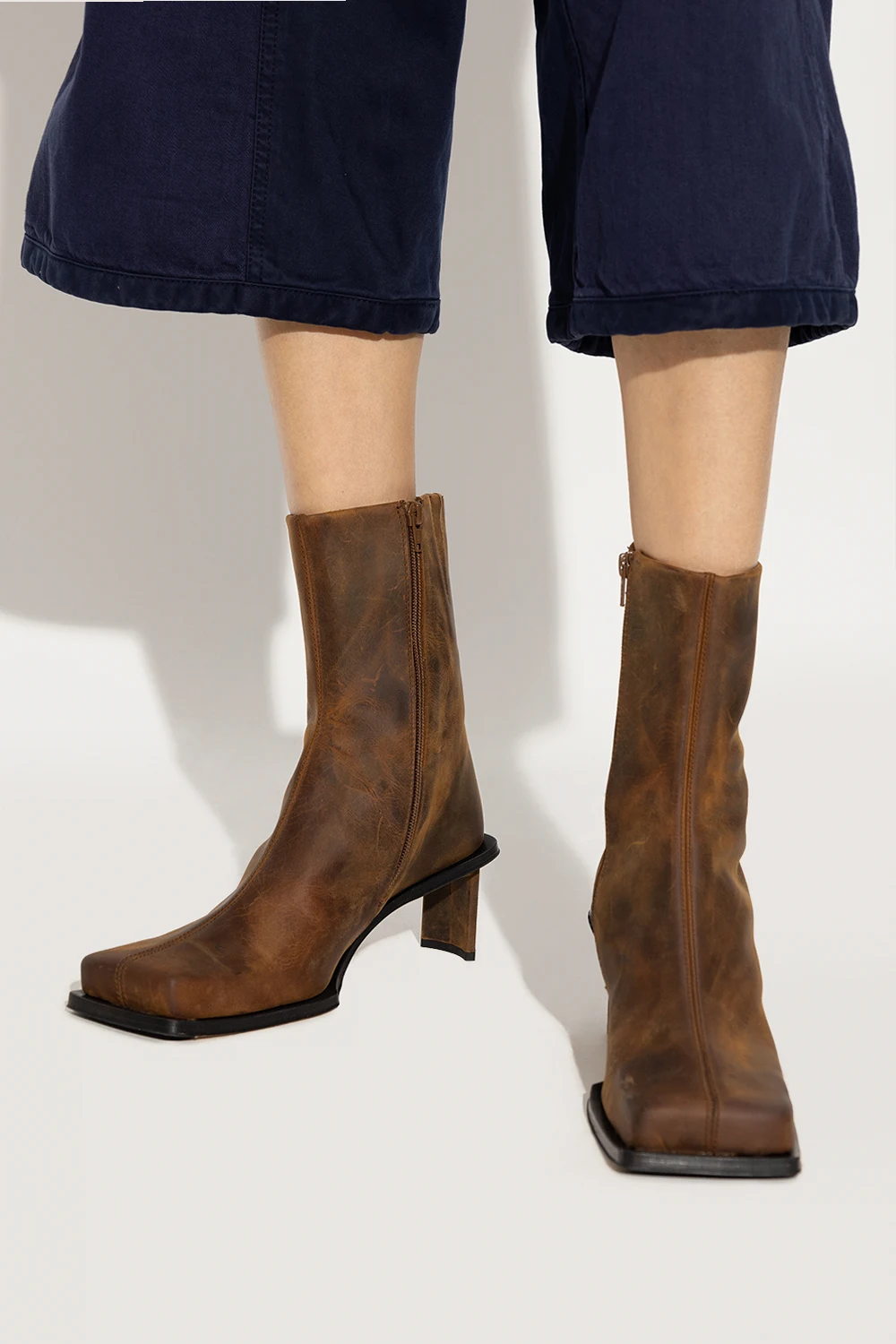 Brązowe botki na obcasie z efektem ‘vintage’, model ‘Brenda’ Miista. Wykonane ze skóry. Z boku zapinane na zamek. Kwadratowy nosek. Kremowa, skórzana podeszwa.
