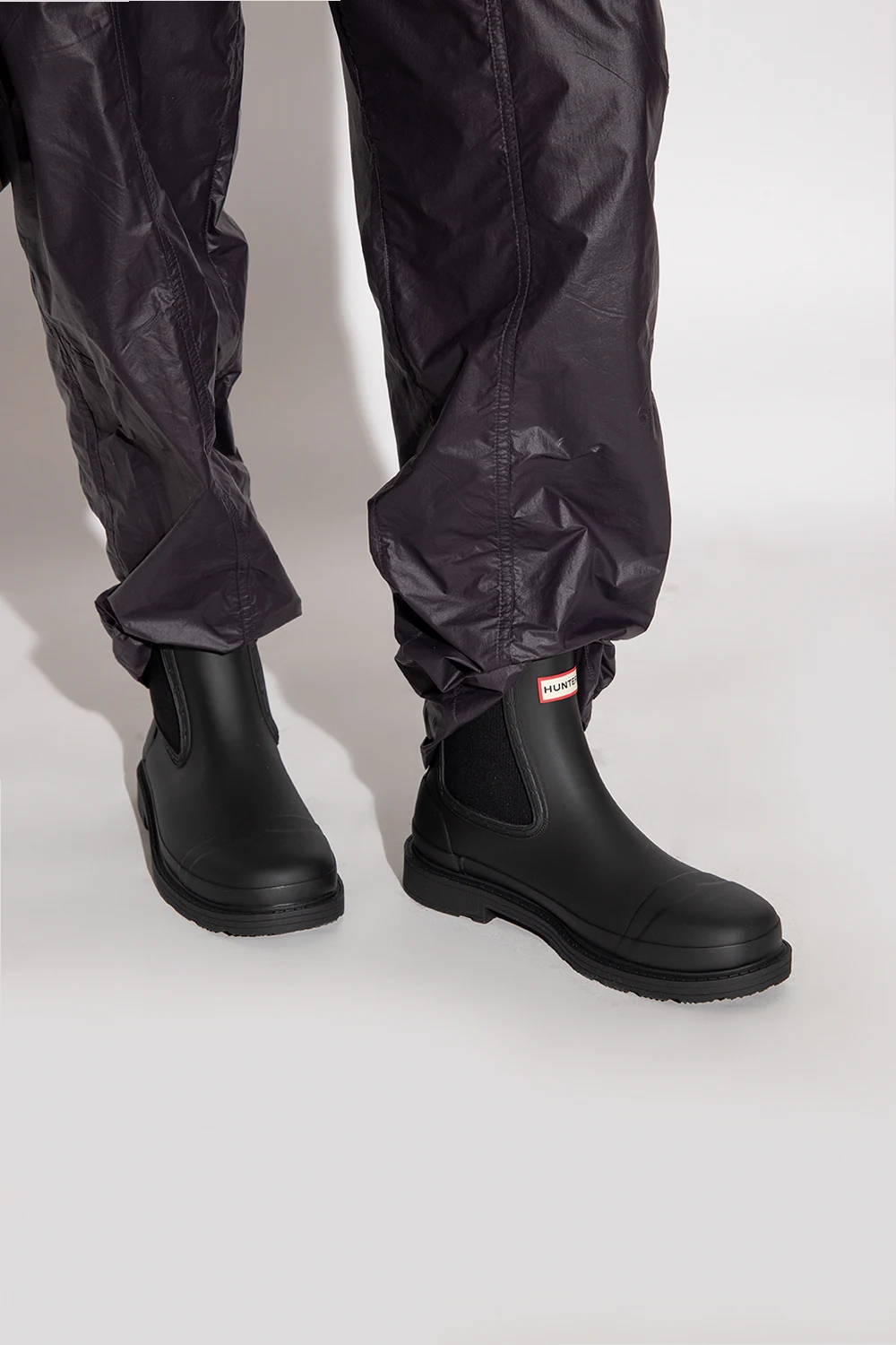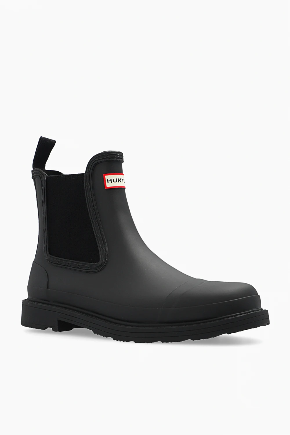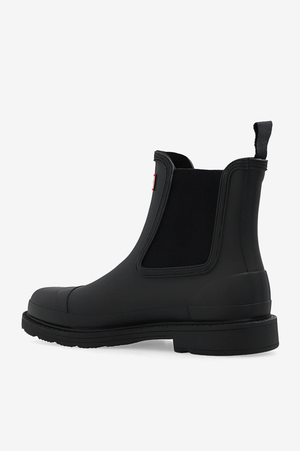 Czarne, matowe kalosze, model ‘Commando Chelsea’ Hunter. Wykonane ręcznie z naturalnego kauczuku z certyfikatem FSC®. Z przodu ozdobione aplikacją z logo. Po bokach wszyta guma. Cholewka z dekoracyjnym wykończeniem. Z tyłu materiałowy uchwyt. Gumowa podeszwa zewnętrzna z charakterystycznym dla marki wzorem bieżnika.