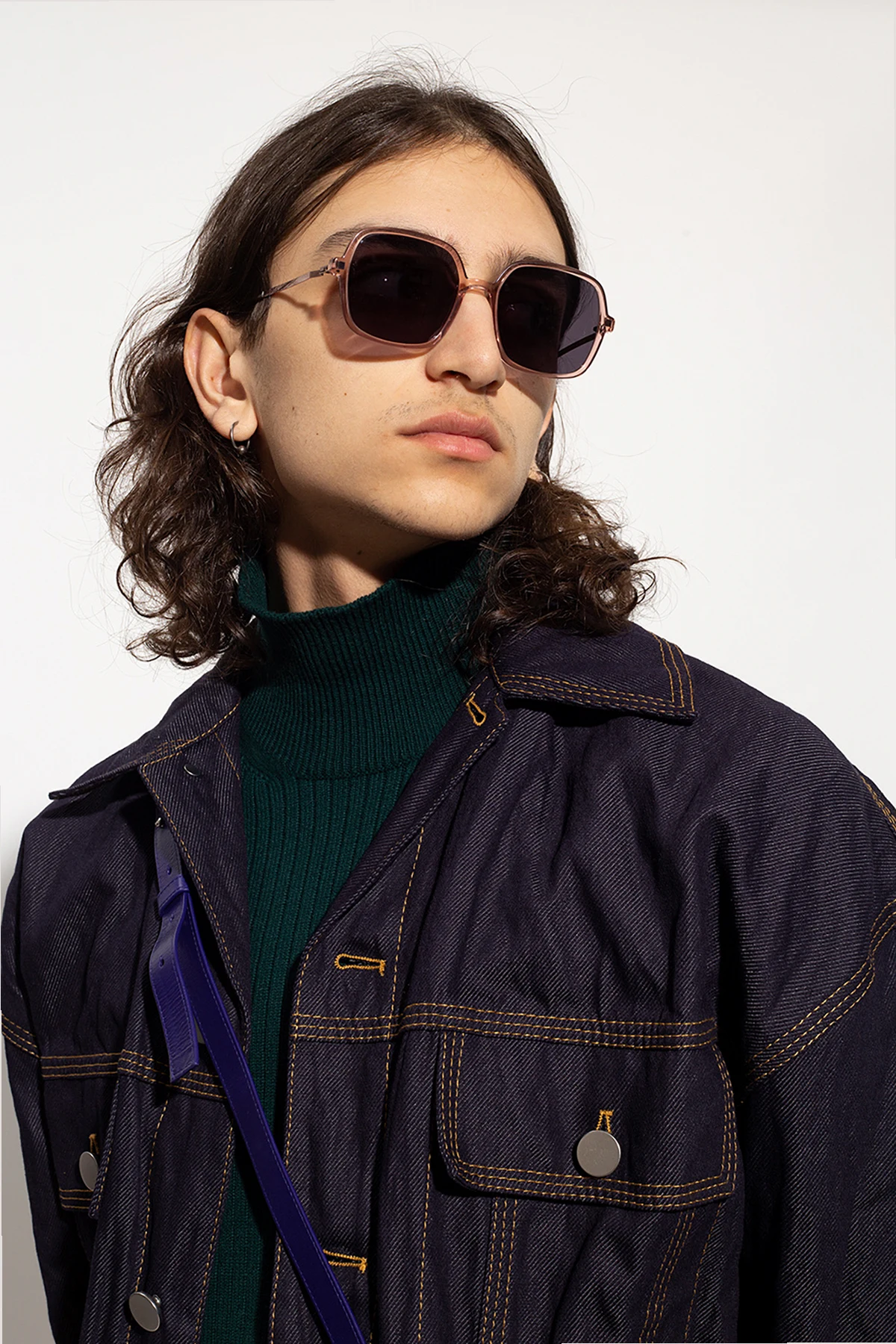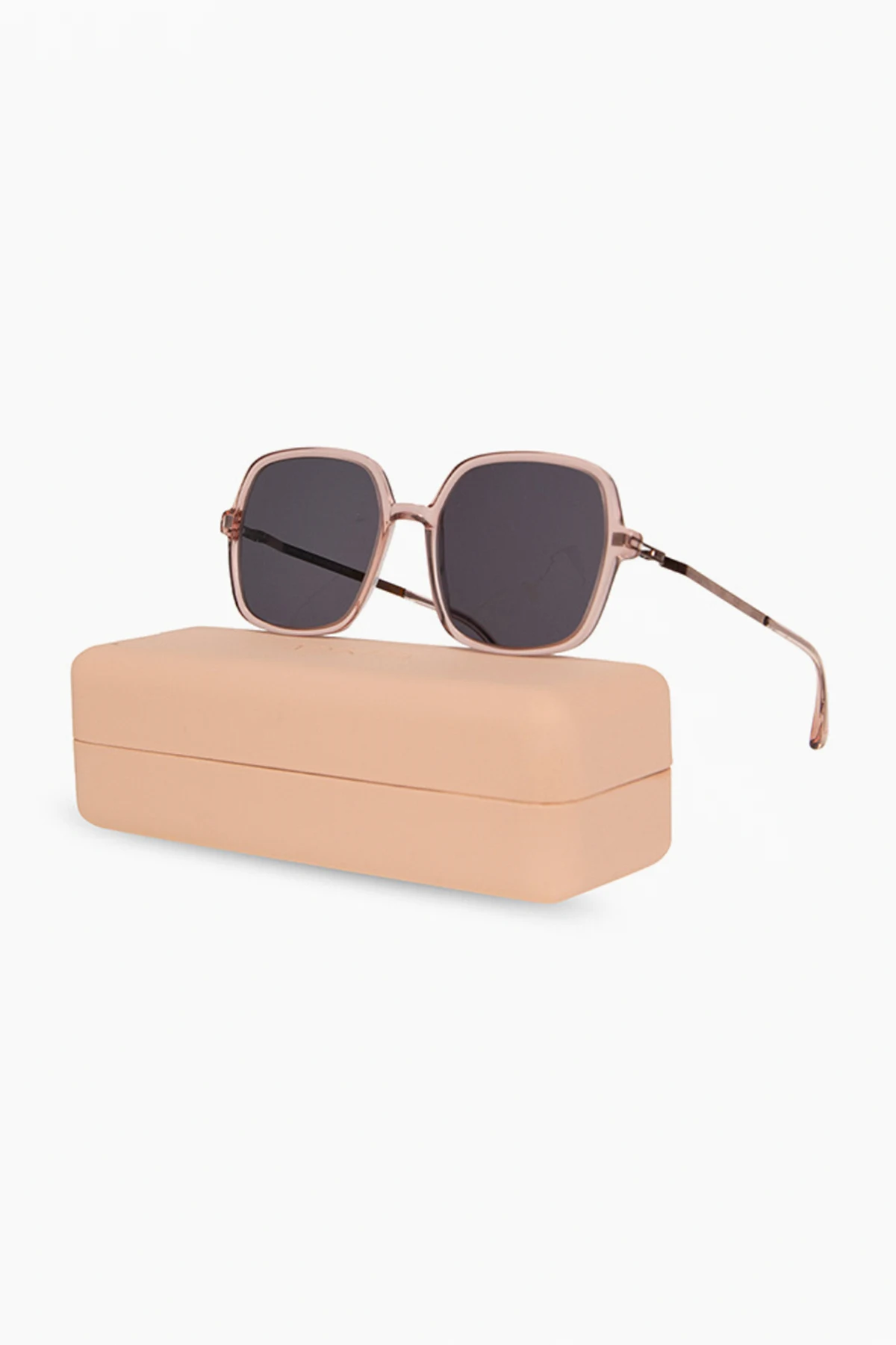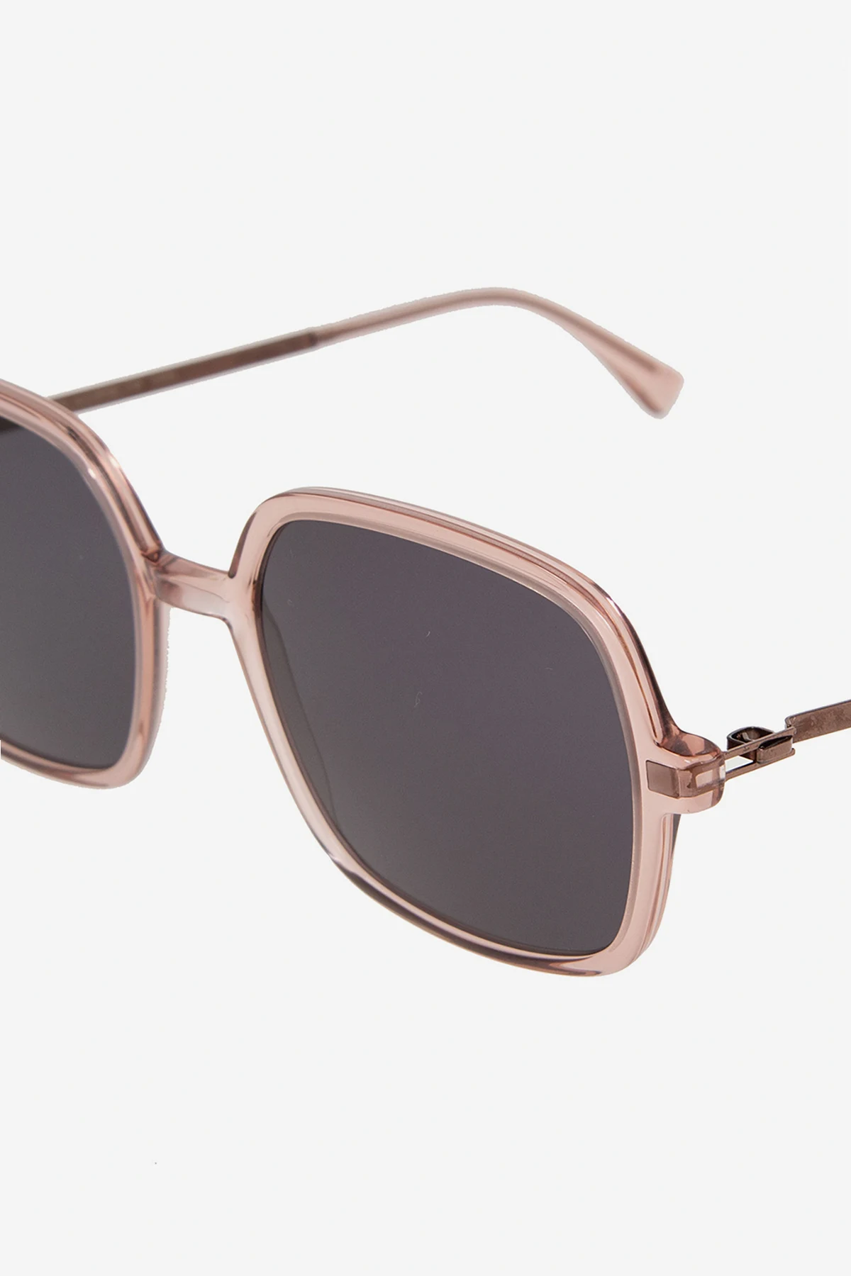 Różowe okulary przeciwsłoneczne, model ‘Saima’ Mykita. Wykonane ze stali nierdzewnej i acetatu. Transparentne, kwadratowe oprawki. Wykończone stalowymi zausznikami w kolorze różowego złota z opatentowanym zawiasem spiralnym. Szarofioletowe, certyfikowane soczewki 100% UVA i UVB. Wykonane ręcznie w Berlinie. Dołączone etui z logo.