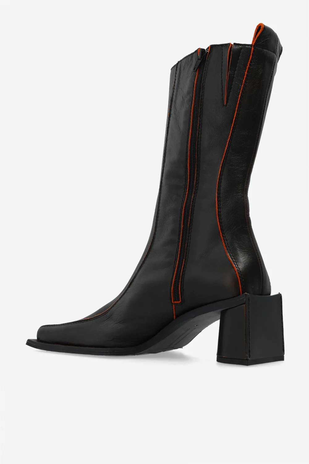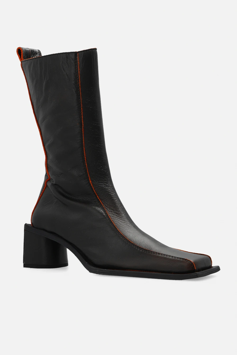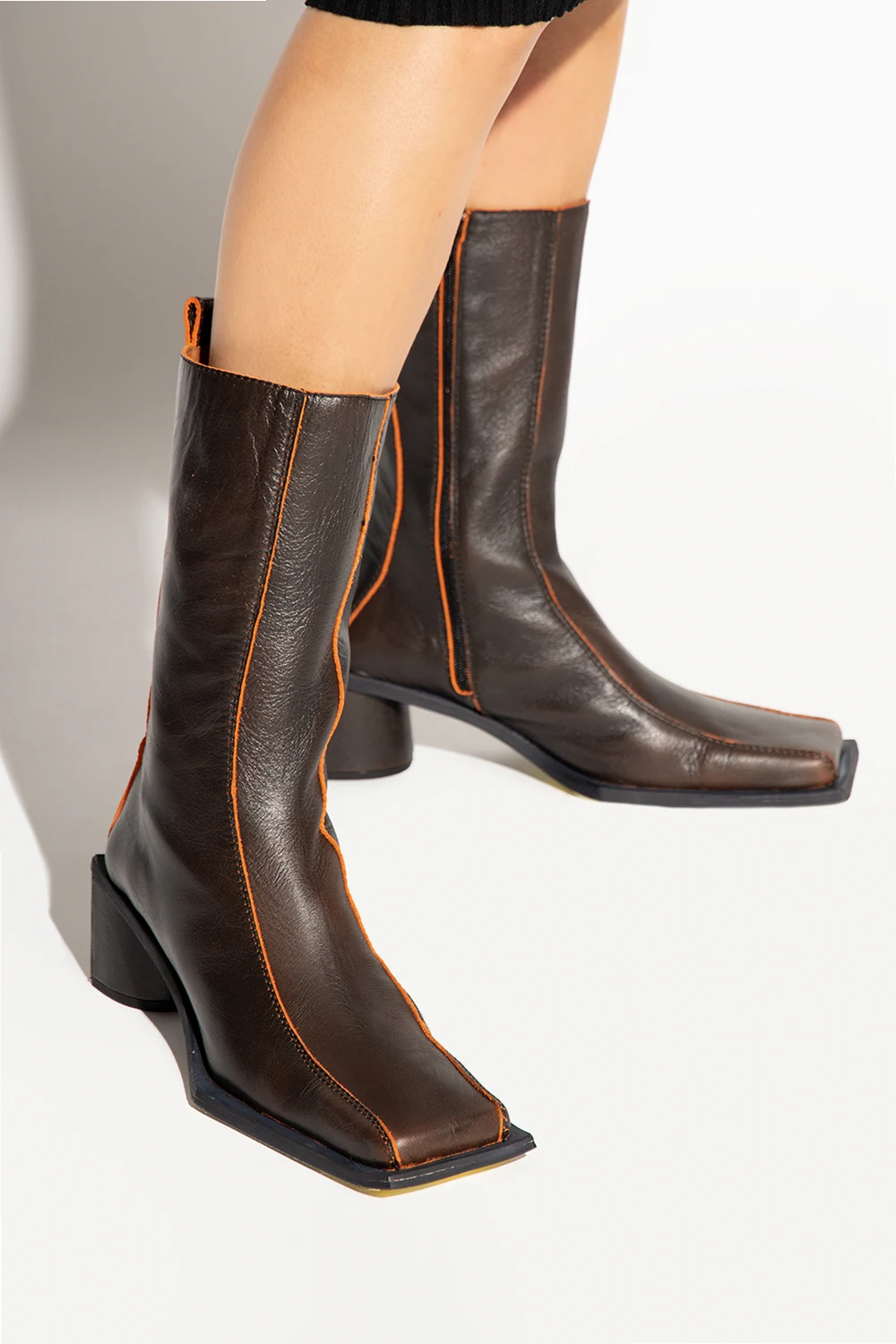 Ciemnobrązowe botki na obcasie, model ‘Bara’ Miista. Wykonane ze skóry. Z boku zapinane na zamek. Wykończenie w kolorze pomarańczowym. Kwadratowy nosek. Ciemnoszara, skórzana podeszwa.