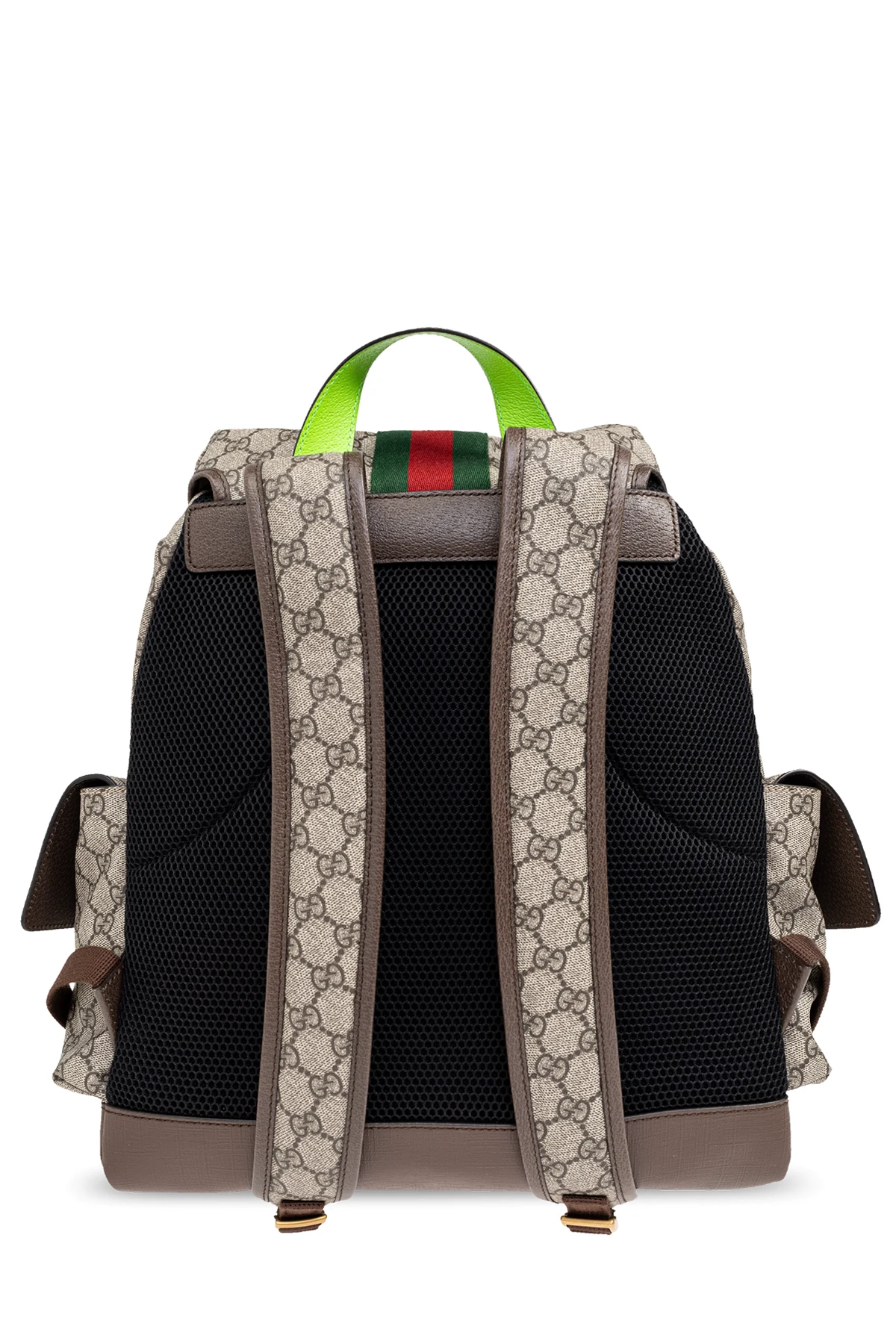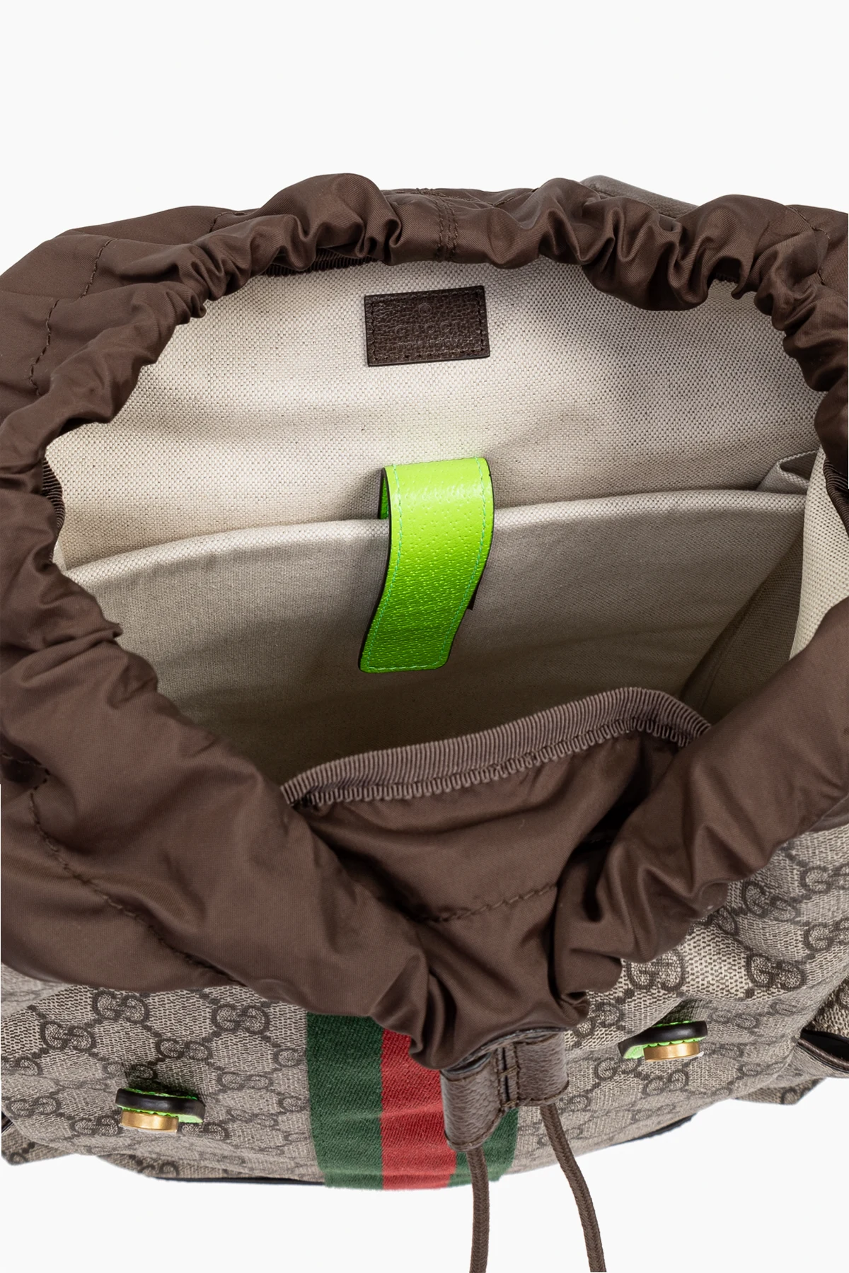 Wykonany z najwyższej jakości materiałów, takich jak płótno 'gg Supreme' i skóra cielęca, plecak ten jest nie tylko elegancki, ale i wytrzymały. Z tyłu plecak posiada wyściełane, regulowane szelki z monogramowym wzorem oraz czarną, siateczkową wyściółkę, co gwarantuje komfort nawet podczas długotrwałego noszenia. Jego wnętrze, wykończone w jasnobrązowym materiale, kryje praktyczne kieszenie, w tym bezpieczną przestrzeń na laptopa, co podnosi jego funkcjonalność.