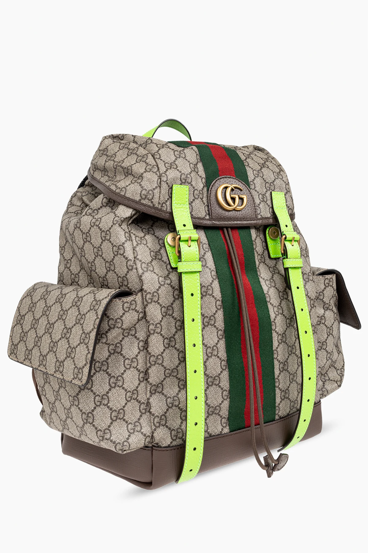 Prezentujemy Państwu plecak z monogramem ‘Ophidia’, dzieło cenionej marki Gucci, który stanowi kwintesencję luksusu i funkcjonalności. Jego dominujący beżowy odcień, ozdobiony charakterystycznym wzorem monogramowym, sprawia, że jest to przedmiot pożądany przez koneserów mody. Szczególną uwagę przyciąga przednia klapa z ikonicznym, zielono-czerwonym paskiem, stanowiącym tło dla złotego logo projektanta - dwóch przecinających się liter "G", które są symbolem luksusu i wyrafinowania.