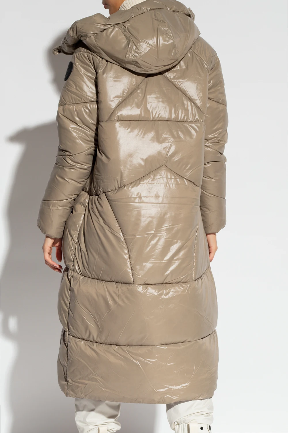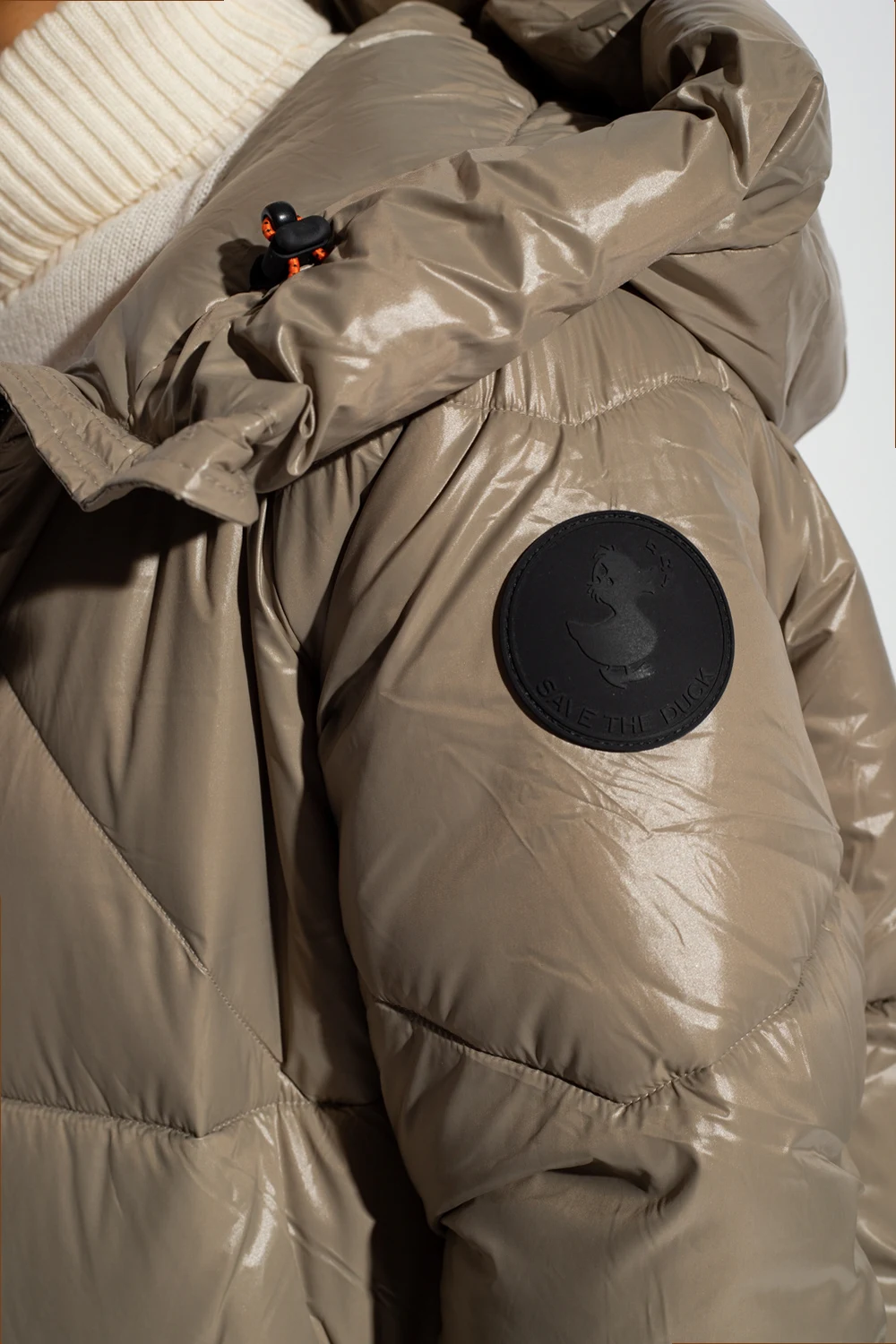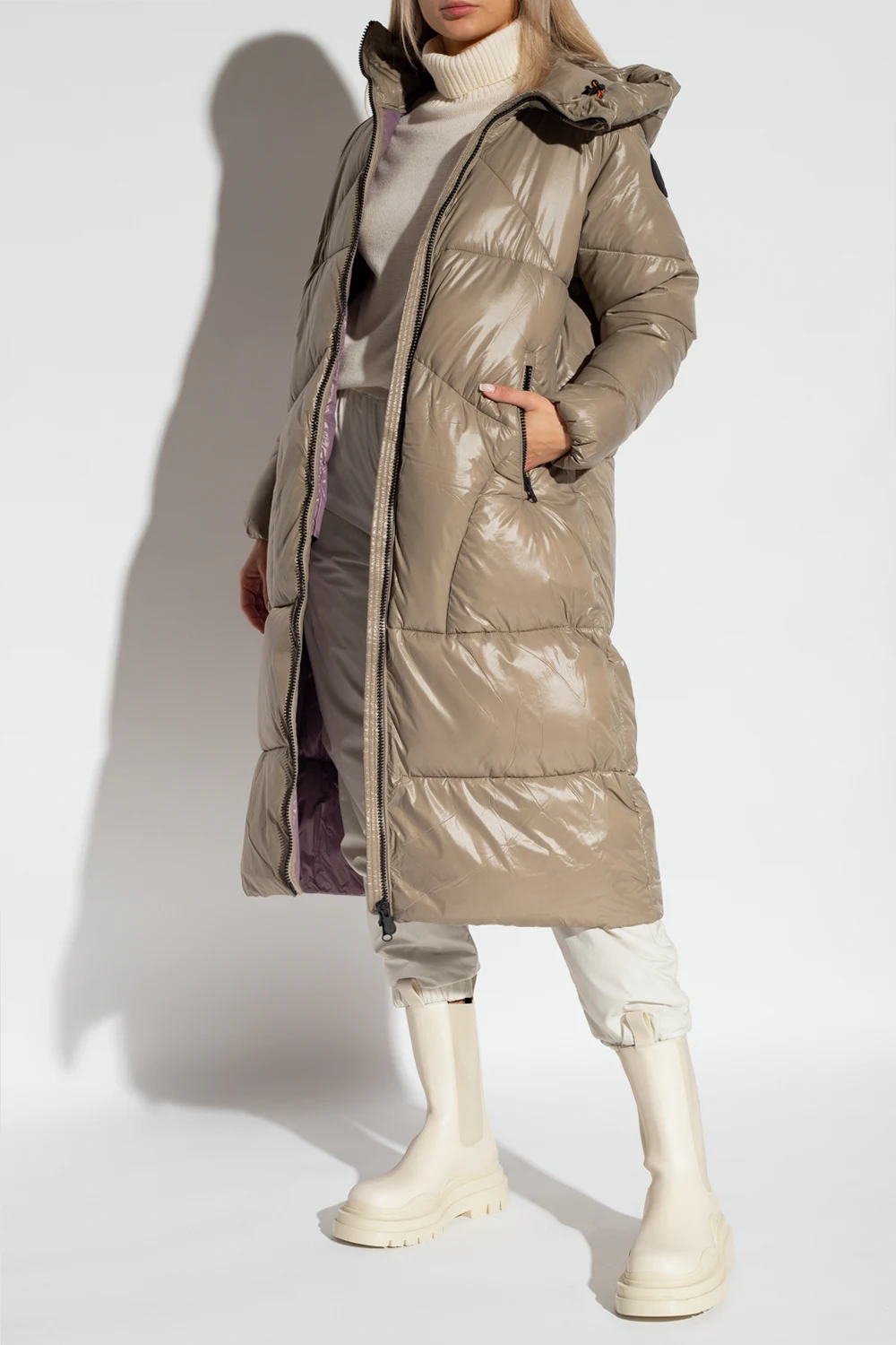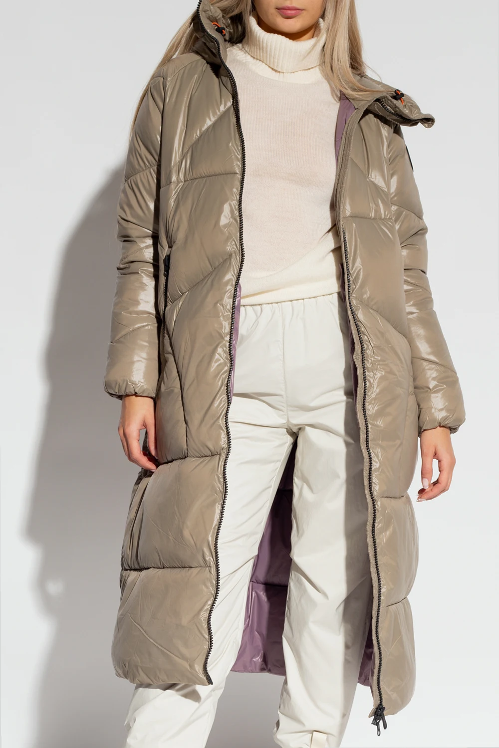 Szarozielona, pikowana, długa kurtka z kapturem, model ‘Hilla’ Save The Duck. Ocieplana syntetycznym puchem Plumtech®. Zapinana na dwubiegunowy zamek. Na rękawie ozdobiona czarną naszywką z logo. Dwie kieszenie zapinane na zamek. Długie rękawy zakończone ściągaczem. Kurtka ma właściwości wodoodporne i chroniące przed wiatrem. Zakres temperatur od -10°C do +5°C.