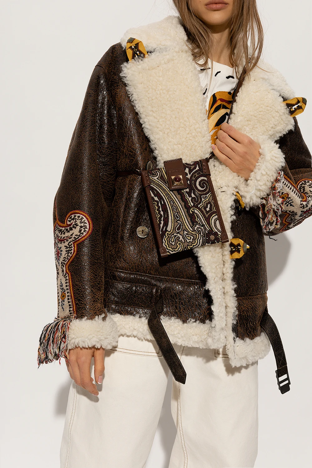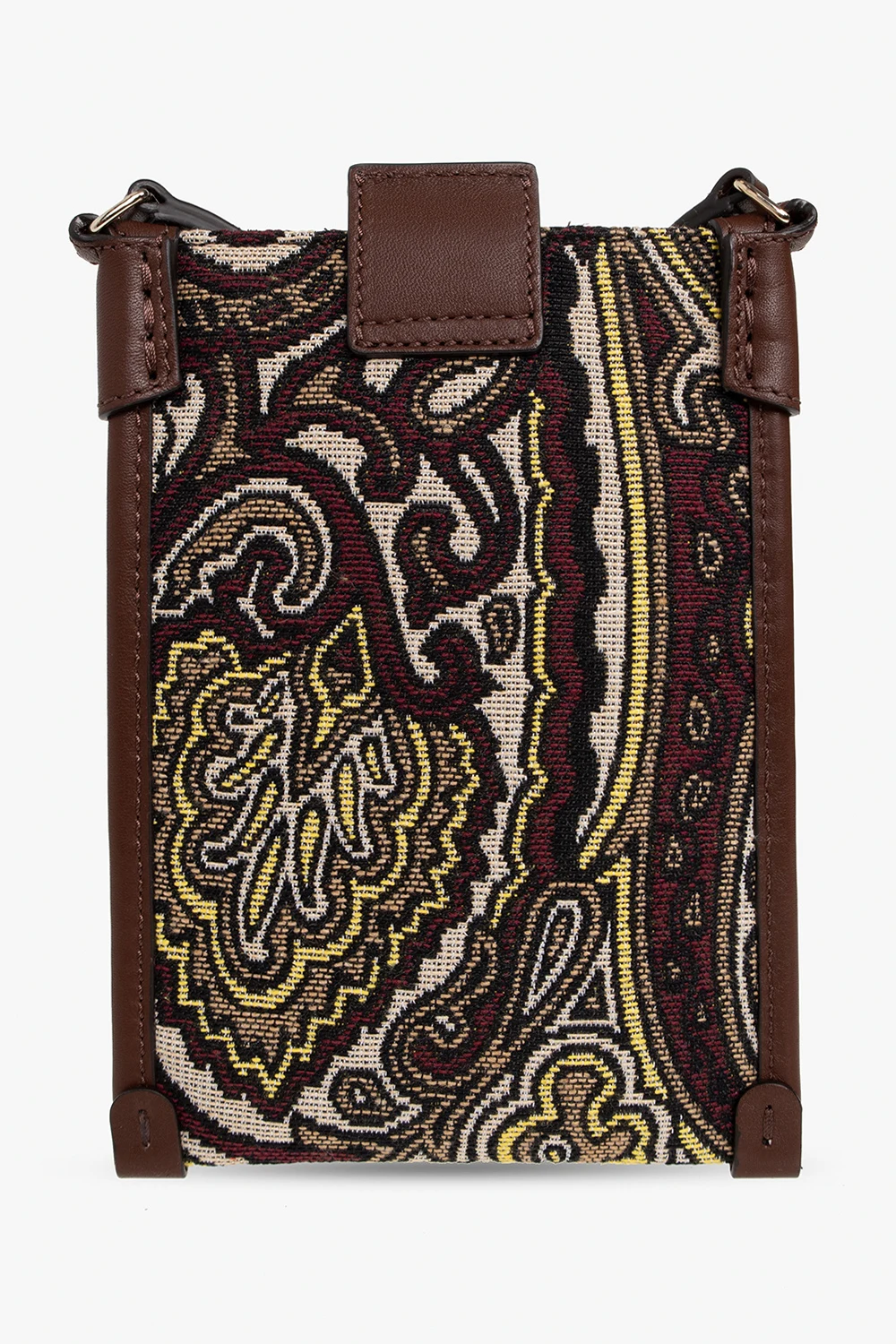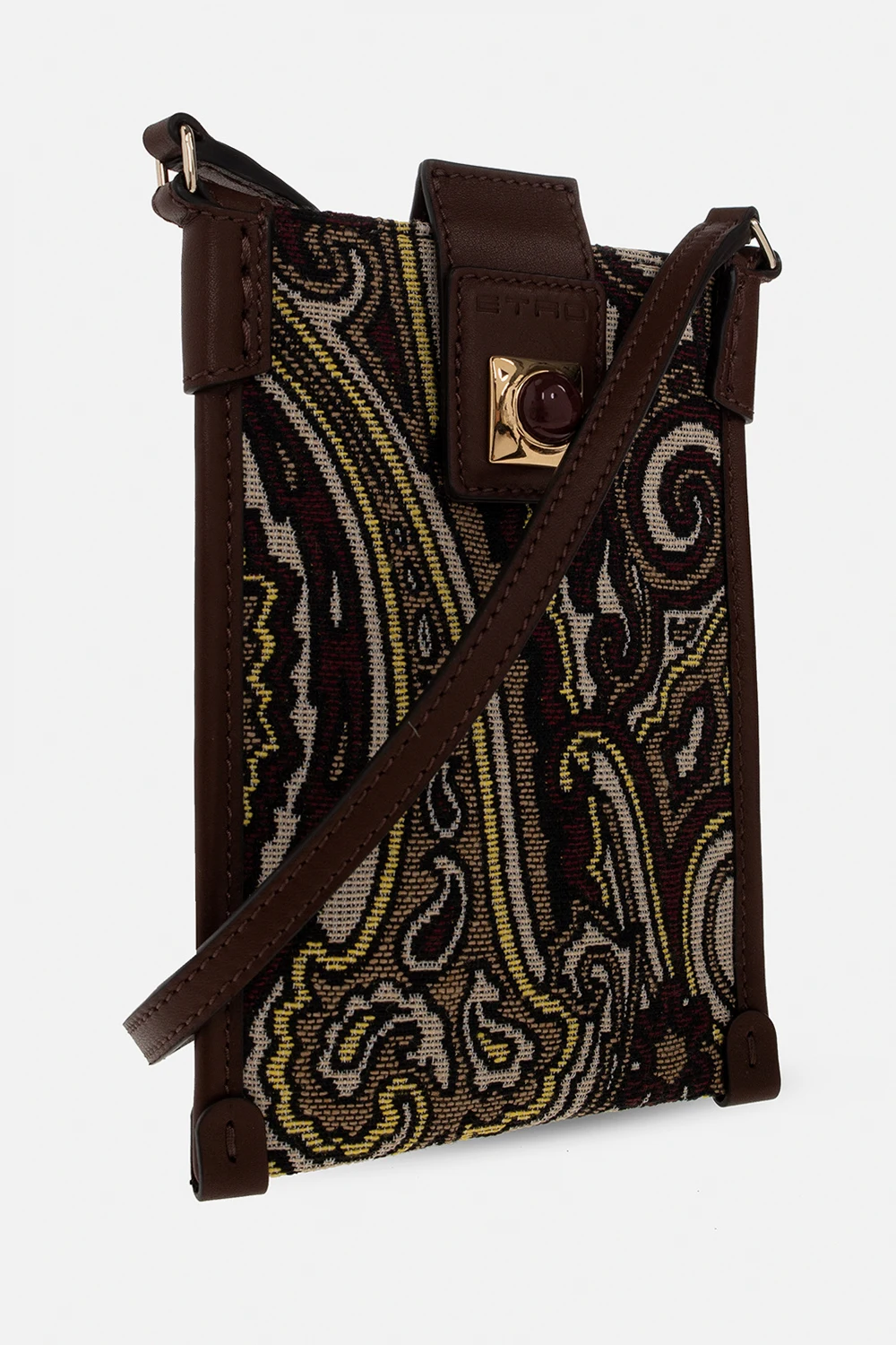 Kolorowe etui na telefon Etro. Wykonane z materiału ozdobionego żakardowym wzorem z motywem ‘paisley’ oraz wykończona skórą cielęcą. Zamykane na zatrzask ozdobiony wytłoczonym logo i metalową aplikacją wykończoną bordowym kamieniem. Regulowany pas na ramię. Wewnątrz komora. Metalowe wykończenie w kolorze złotym.