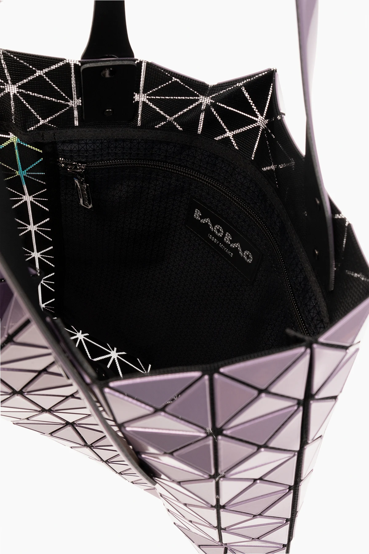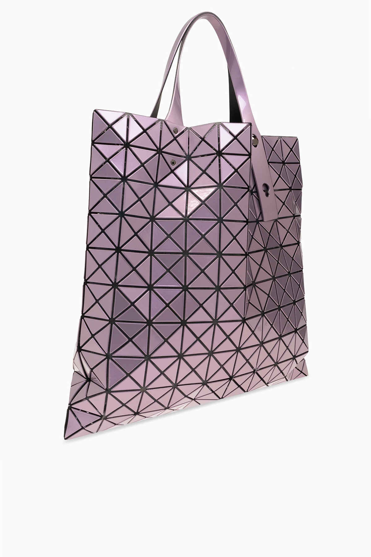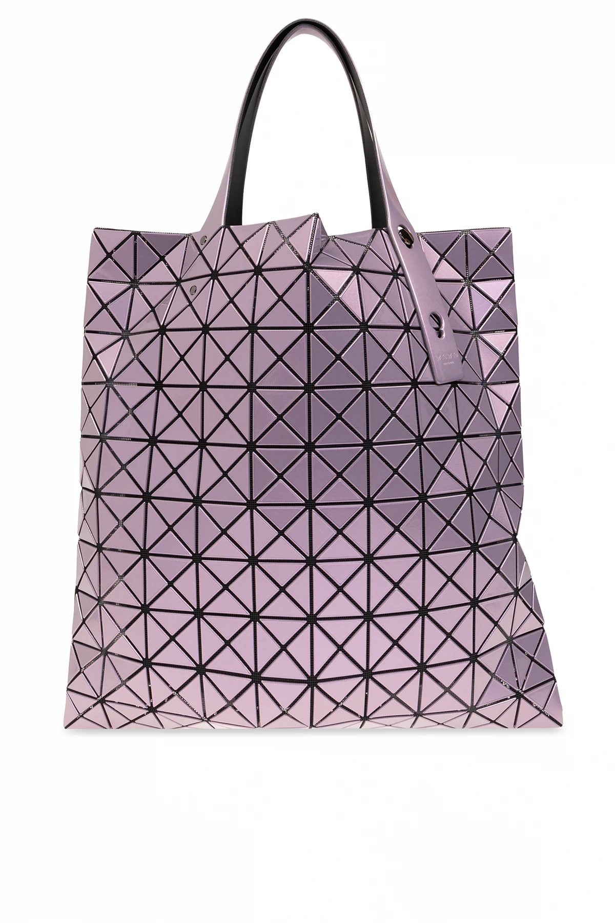 Fioletowa torba o metalicznym wykończeniu typu ‘shopper’ Bao Bao Issey Miyake. Ozdobiona geometrycznym wzorem i logo. Dwie półokrągłe, regulowane rączki. Wewnątrz komora i kieszeń zamykana na zamek.