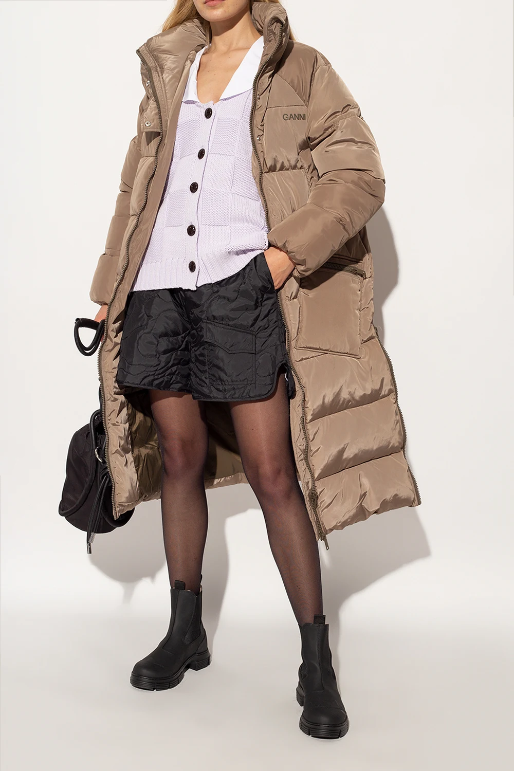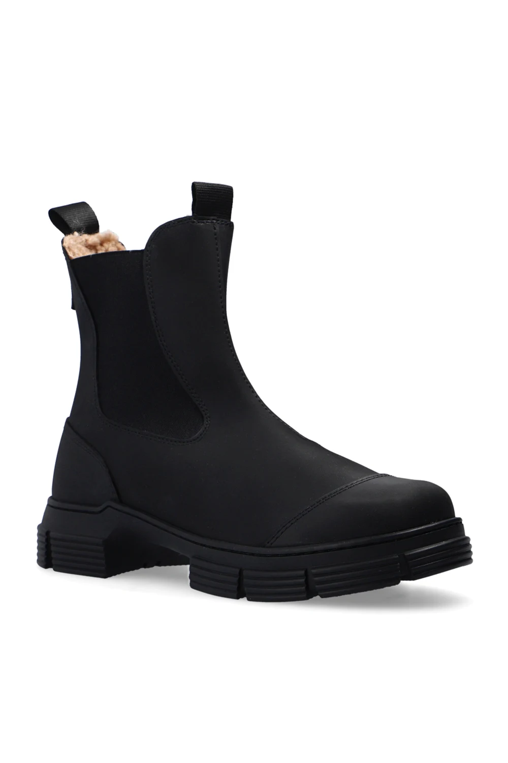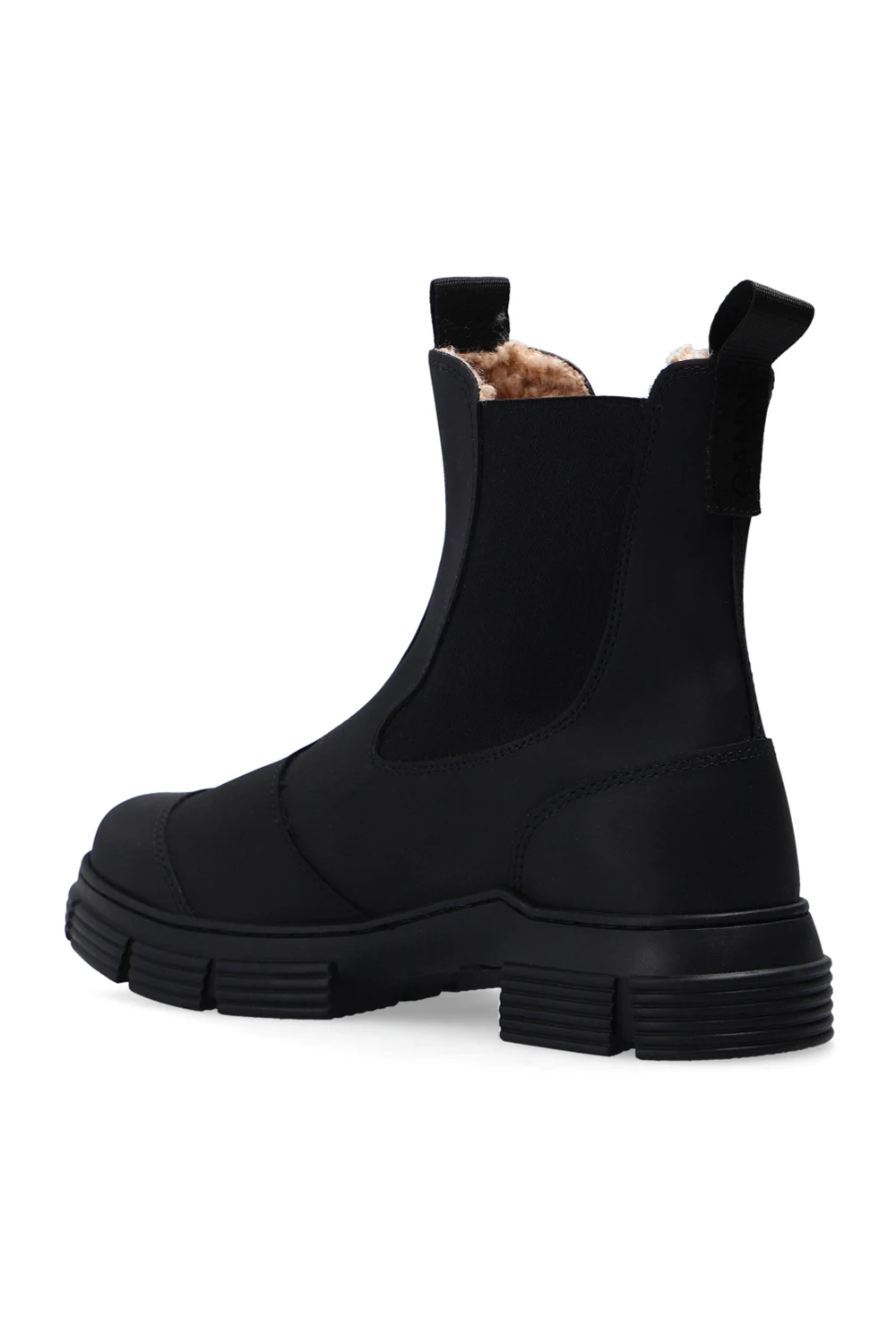 Czarne, gumowe buty za kostkę typu ‘Chelsea’ Ganni. Po bokach taśma elastyczna. Dekoracyjne przeszycie. Czarna, gumowa podeszwa.