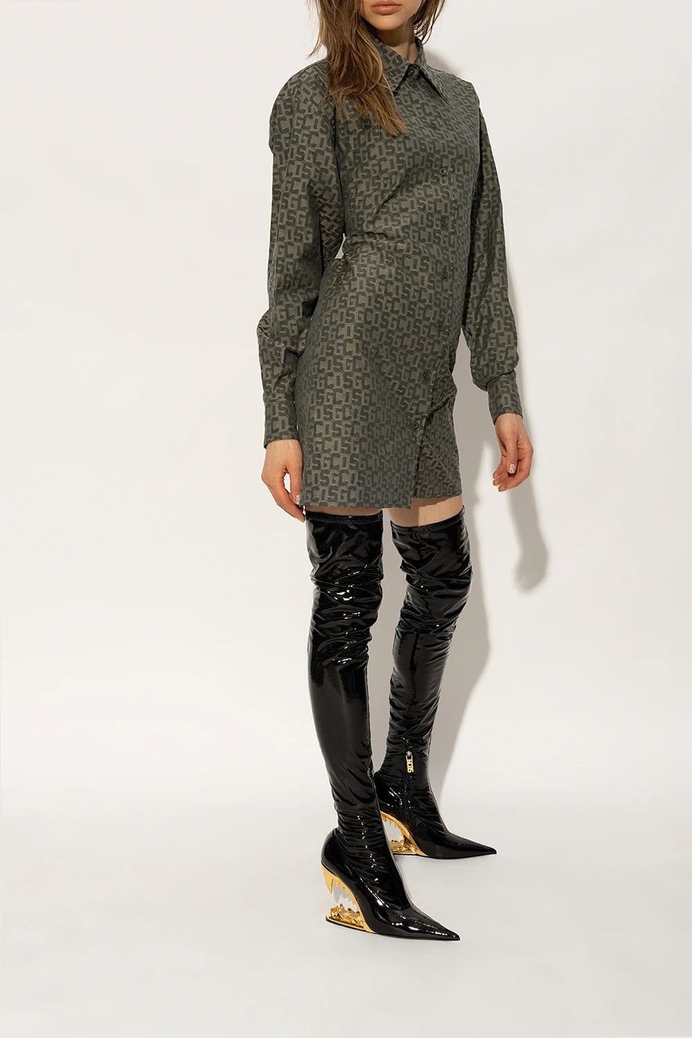 Czarne kozaki na koturnie GCDS. Wykonane z lakierowanego materiału imitującego skórę. Nosek w szpic. Dekoracyjny koturn w kolorze złotym. Czarna, skórzana podeszwa.