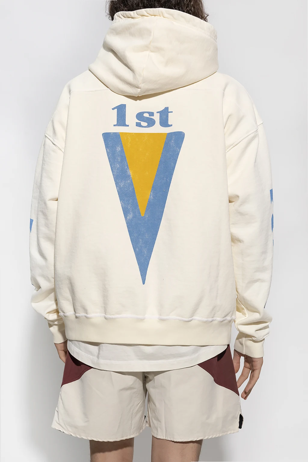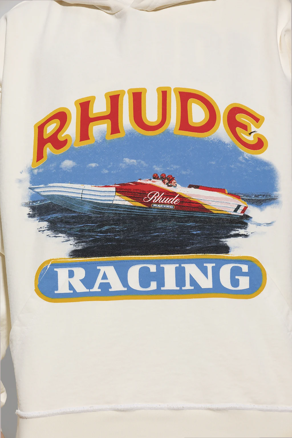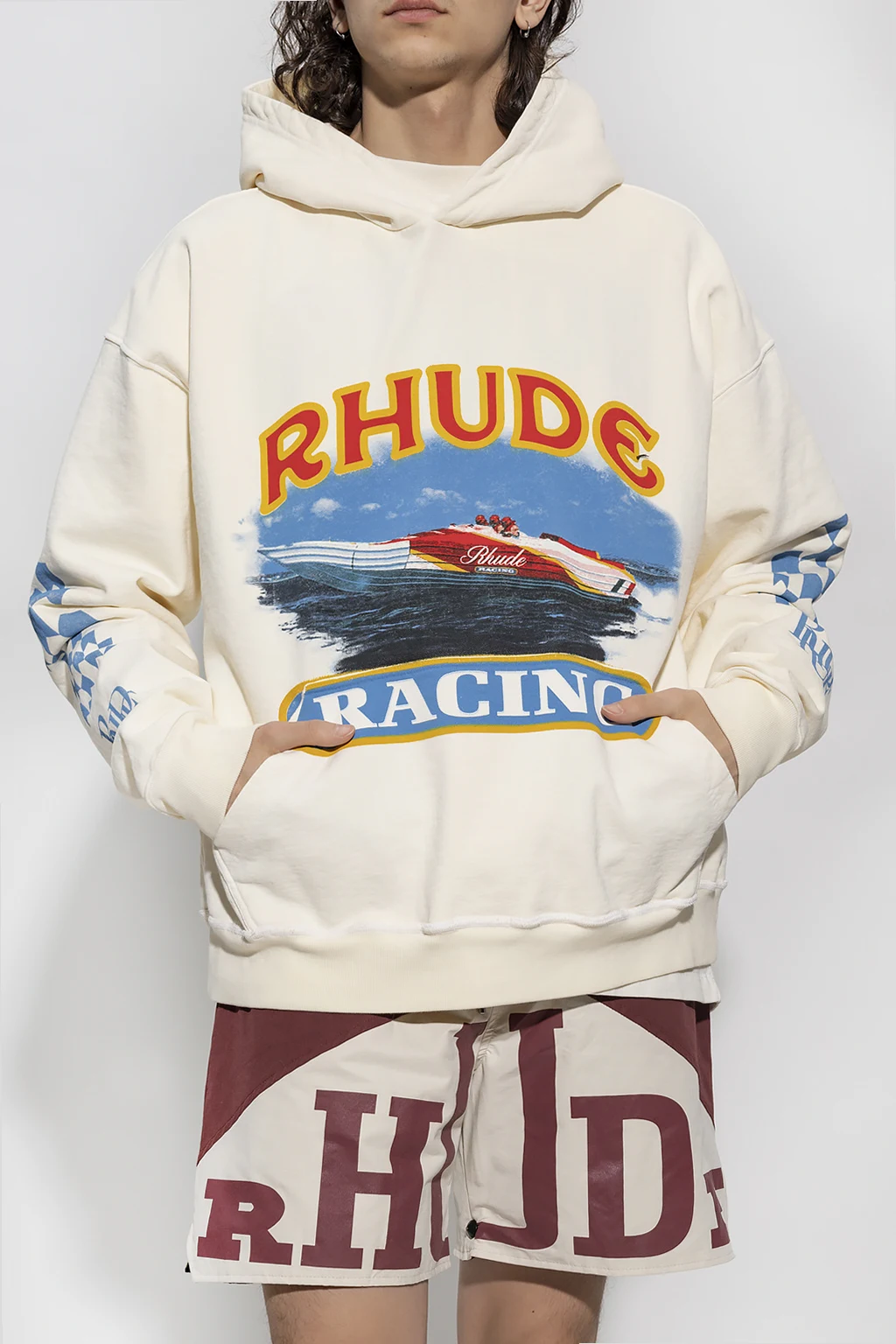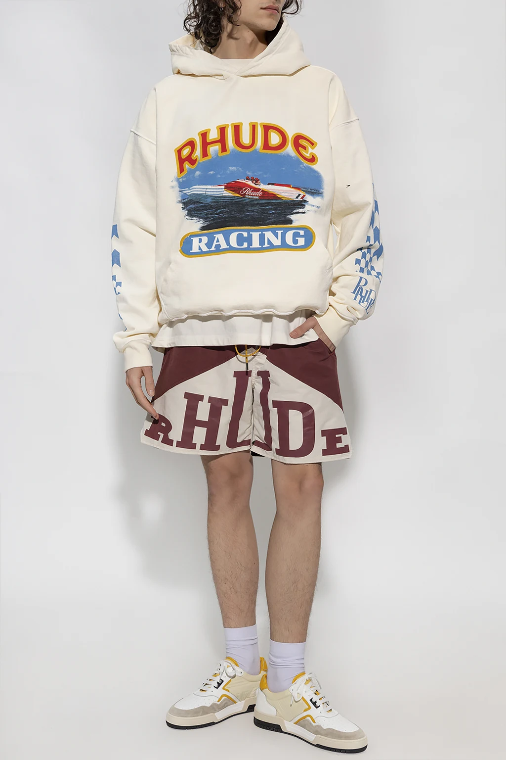 Kremowa, bawełniana bluza z kapturem Rhude. Ozdobiona kolorowym nadrukiem i logo. Długie rękawy i dół bluzy zakończone ściągaczem.