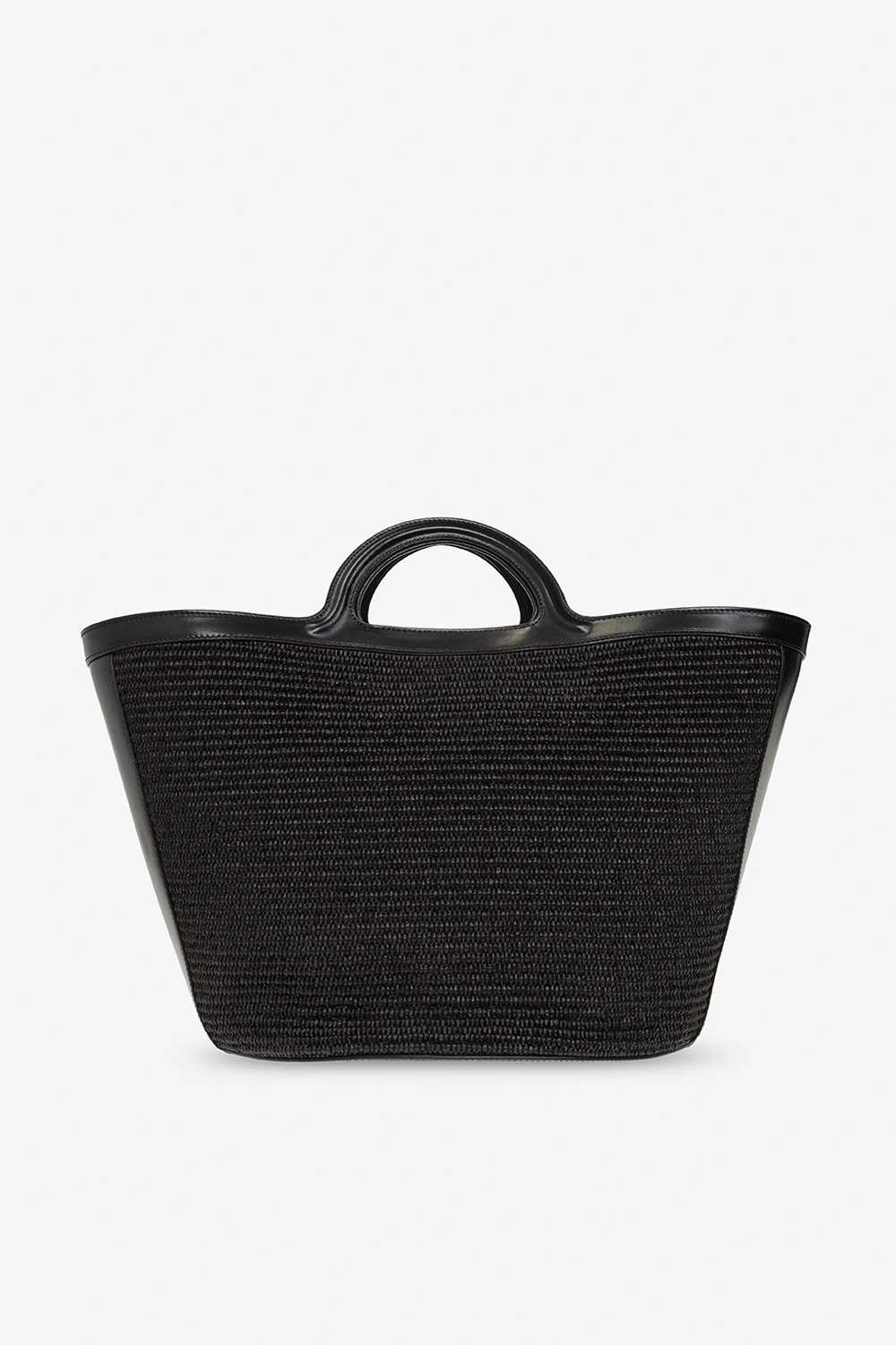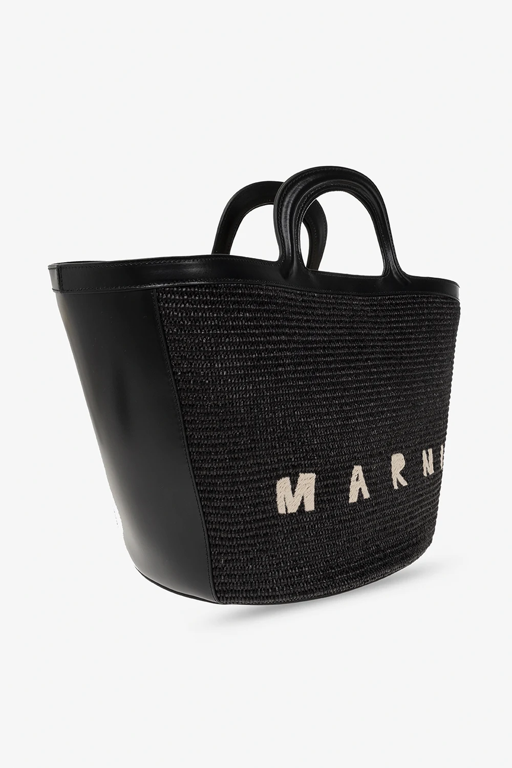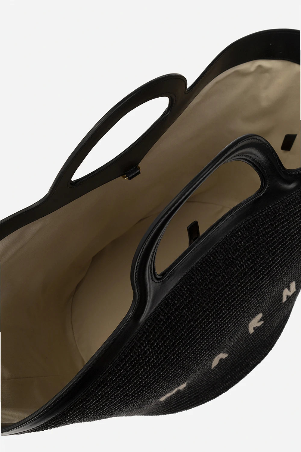 Czarna torba typu ‘shopper’, model 'Tropicalia Large' Marni. Wykonana z materiału oraz skóry cielęcej. Zapięcie na zatrzask. Ozdobiona wyszytym wzorem z logo w kolorze beżowym. Dwie półokrągłe rączki. Wewnątrz komora oraz kieszeń zamykana na zamek. Metalowe wykończenie w kolorze złotym.