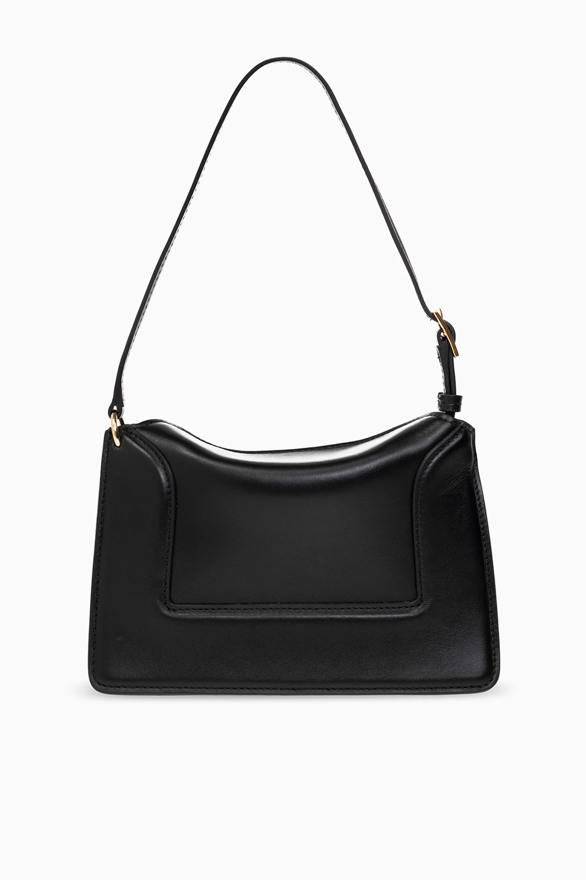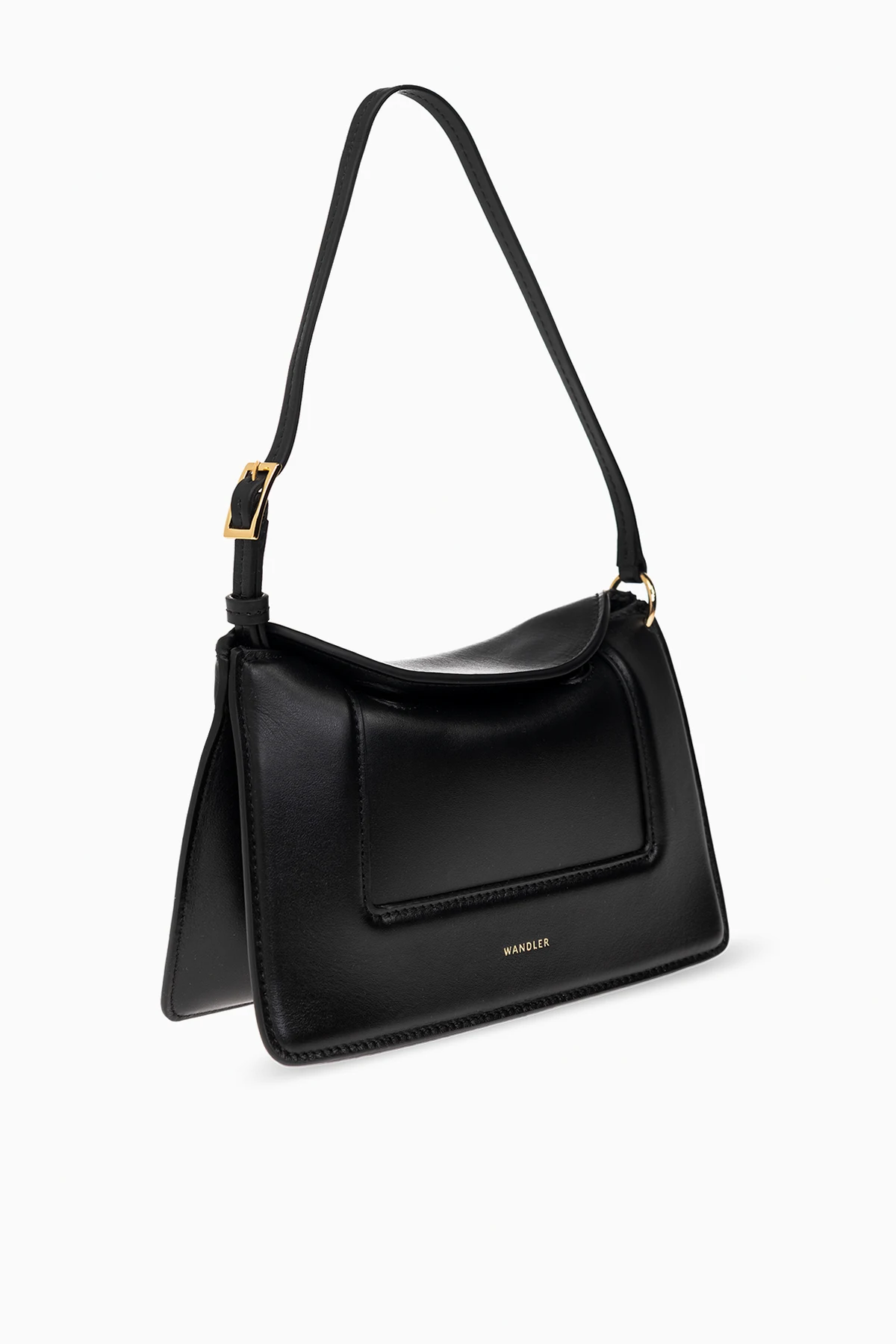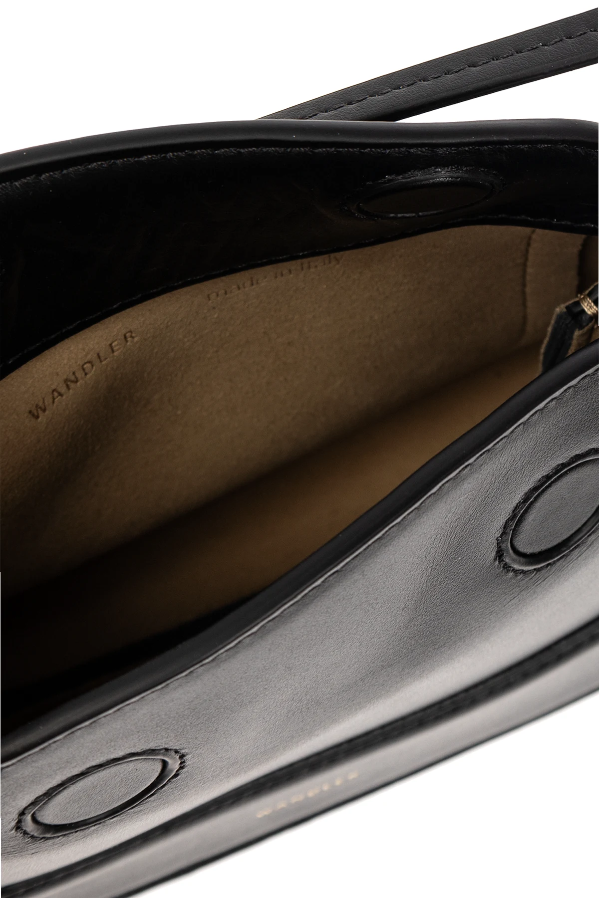 Czarna torba na ramię, model ‘Penelope Micro’ Wandler. Wykonana ze skóry cielęcej. Zamykana na magnetyczne zapięcie. Z przodu ozdobiona nadrukowanym logo. Półokrągła rączka. Pas na ramię z możliwością regulacji długości. Wewnątrz komora. Metalowe wykończenie w kolorze złotym.