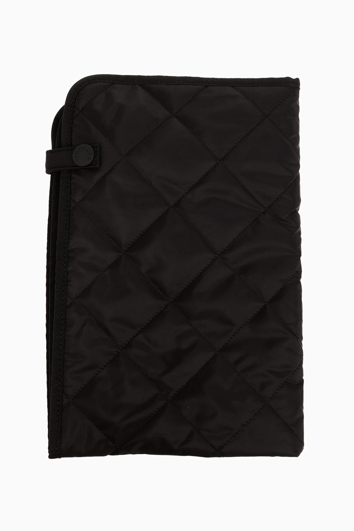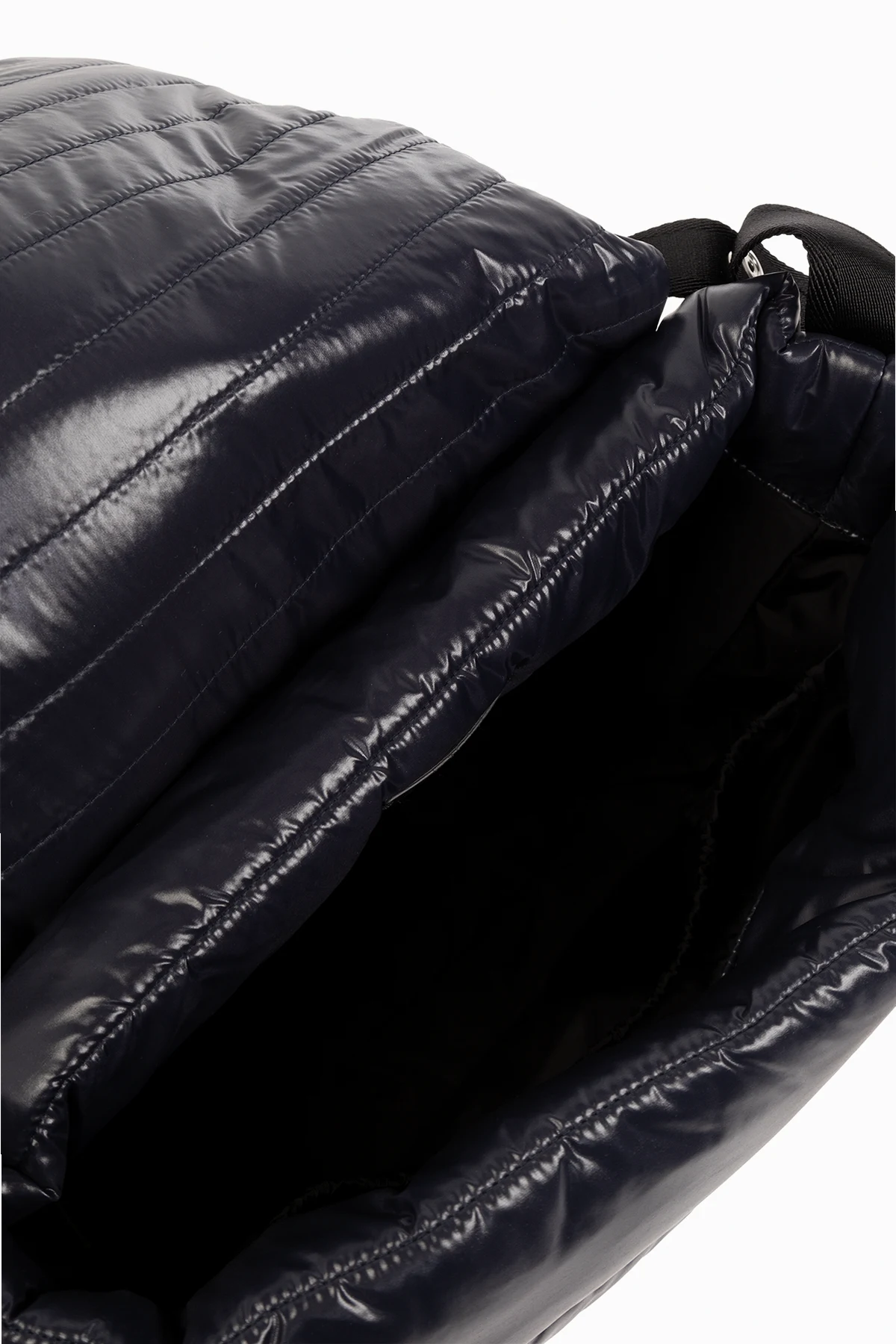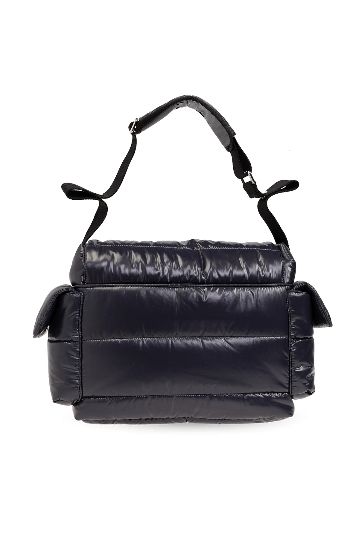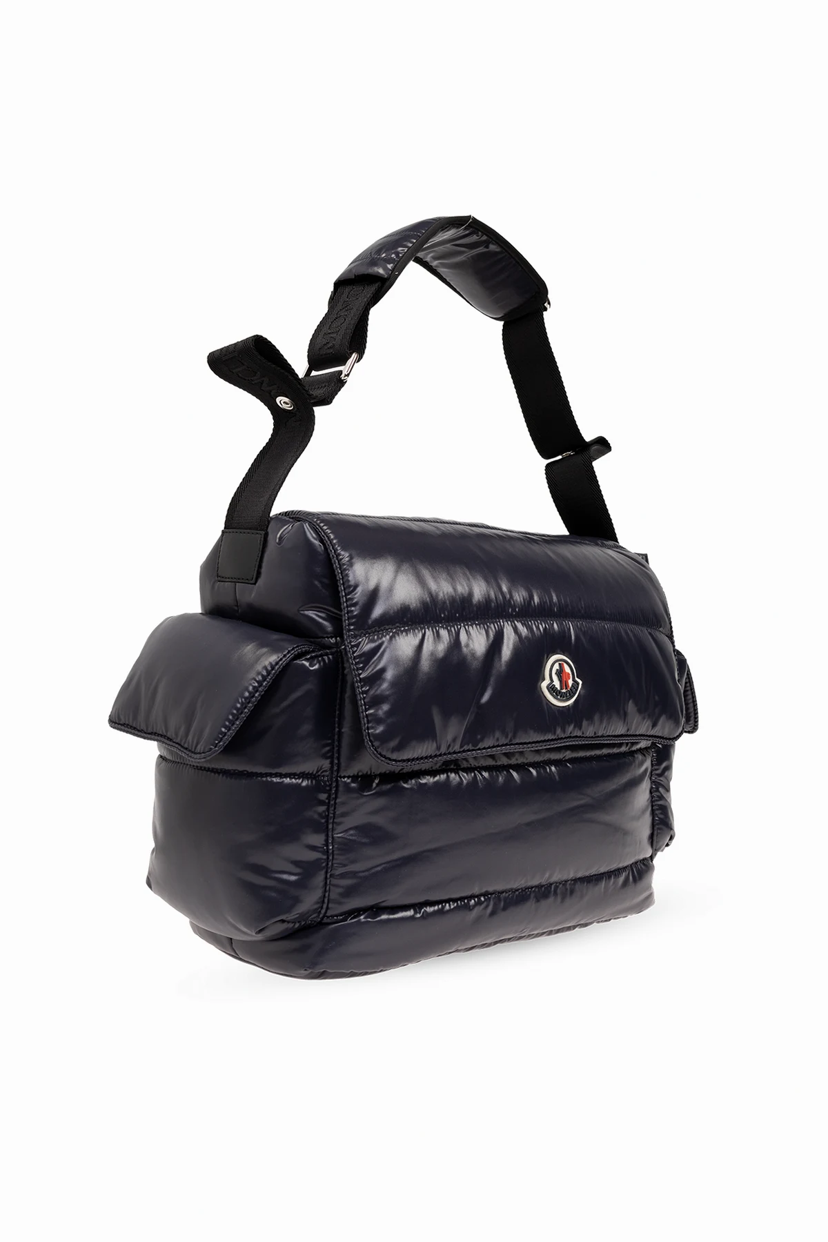 Granatowa, pikowana torba dla mam Moncler Enfant. Wykonana z materiału. Zamykana na magnetyczny zatrzask. Z przodu kolorowa naszywka z logo. Po bokach kieszeń z patką zapinaną na magnetyczny zatrzask. Z tyłu kieszeń zamykana na magnetyczny zatrzask. Długi, regulowany pasek z możliwością przypięcia do wózka. Wewnątrz komora i trzy wsuwane kieszenie. Dołączona mata do przewijania.