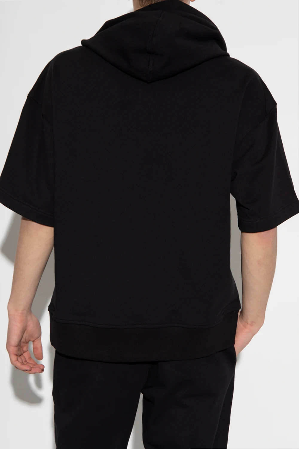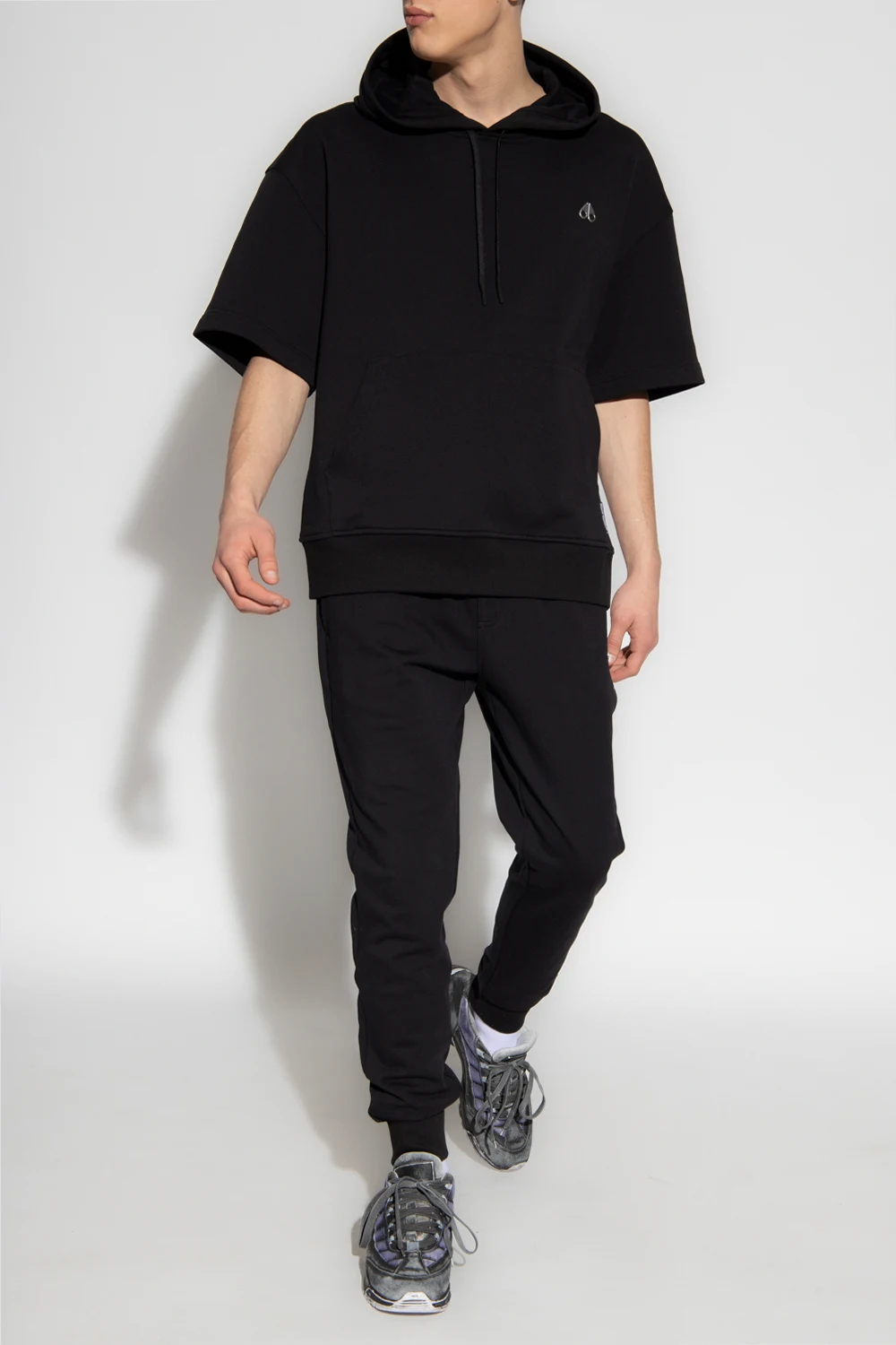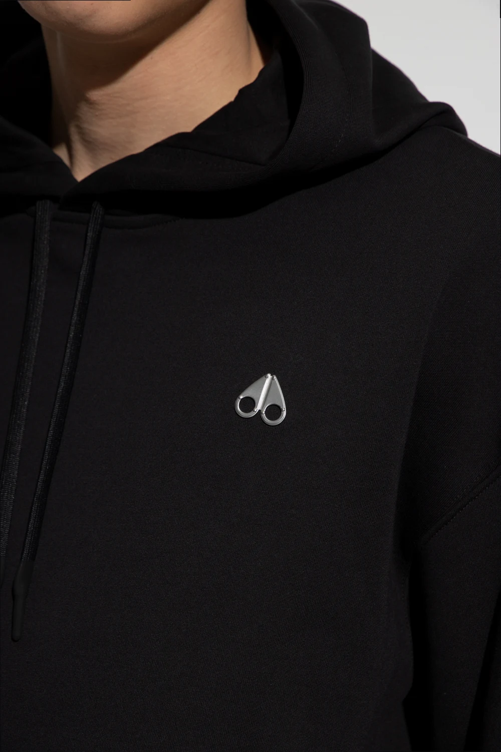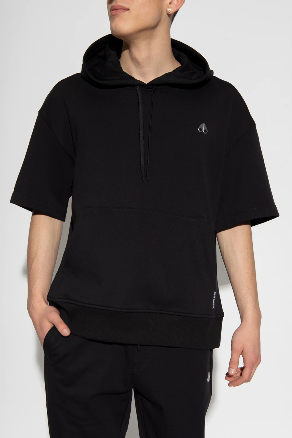 Czarna bluza Moose Knuckles. Wykonana z bawełny. Kaptur ściągany trokami. Aplikacja w kształcie logo w kolorze srebrnym. Z przodu dwie wsuwane kieszenie. Krótkie rękawy.