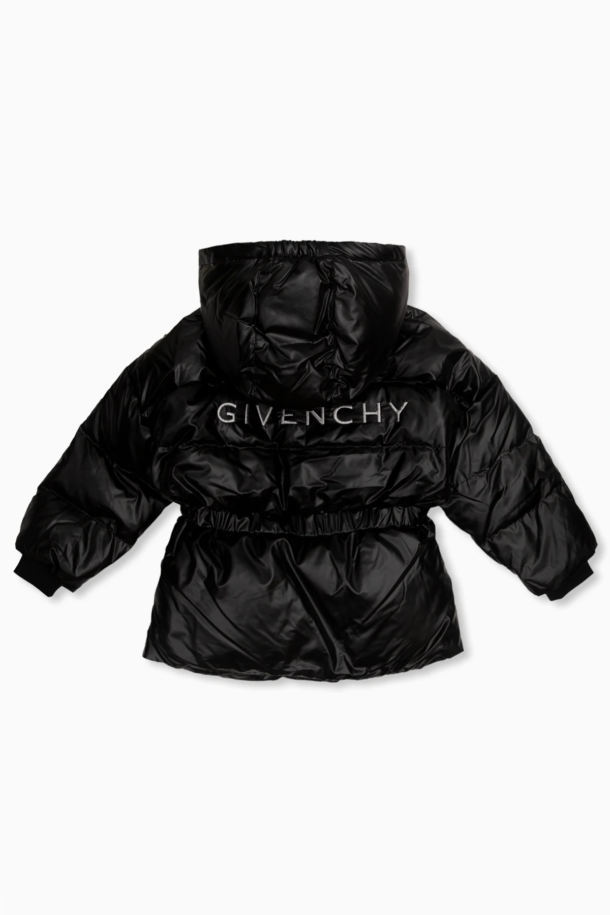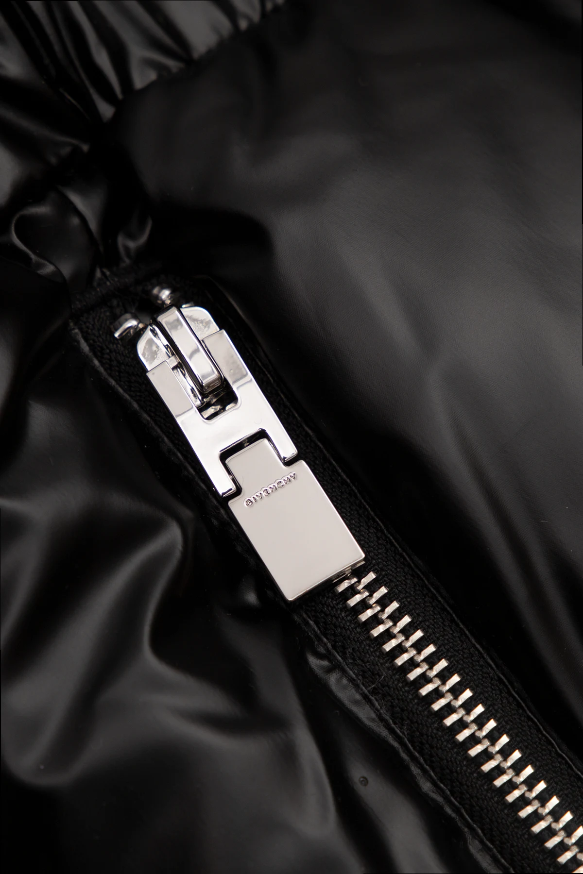 Czarna, puchowa kurtka Givenchy Kids. Zapinana na zamek oraz zatrzaski. Odpinany kaptur. Z tyłu wyszyty wzór z logo w kolorze czerwonym. Dwie kieszenie z zapięciem na zamek. Długie rękawy wykończone ściągaczem.