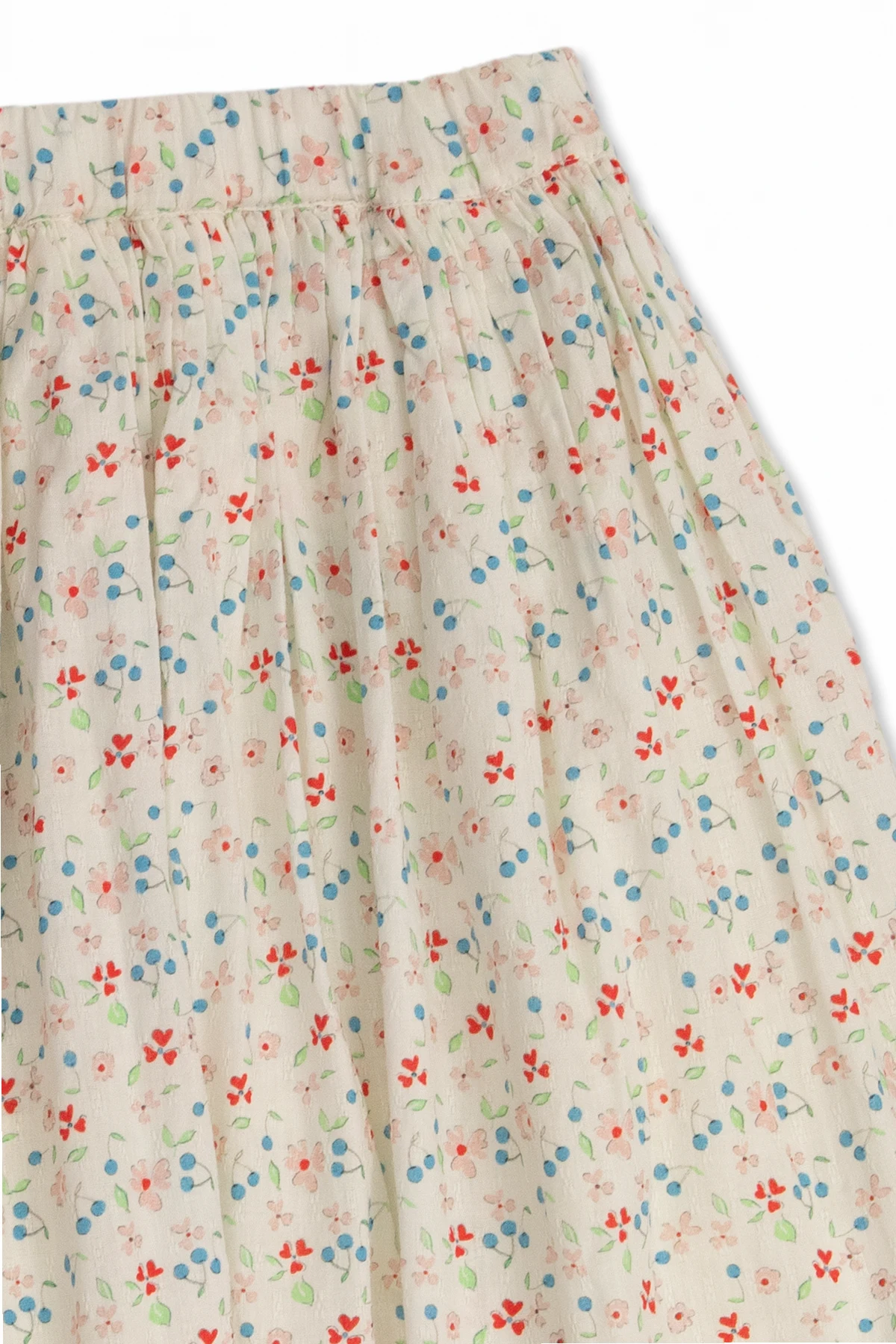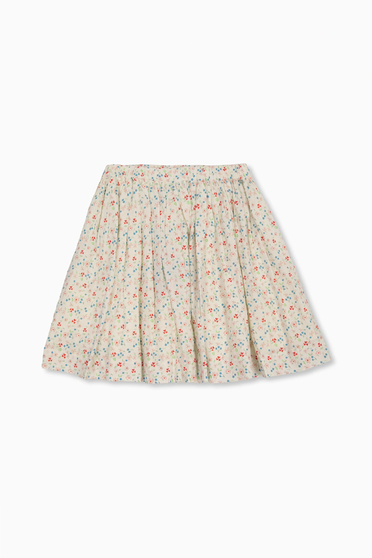 Jasnobeżowa spódnica, model ‘Suzon’ Bonpoint. Wykonana z bawełny. W pasie wszyta guma. Ozdobiona kolorowym wzorem z motywem kwiatów oraz owoców.