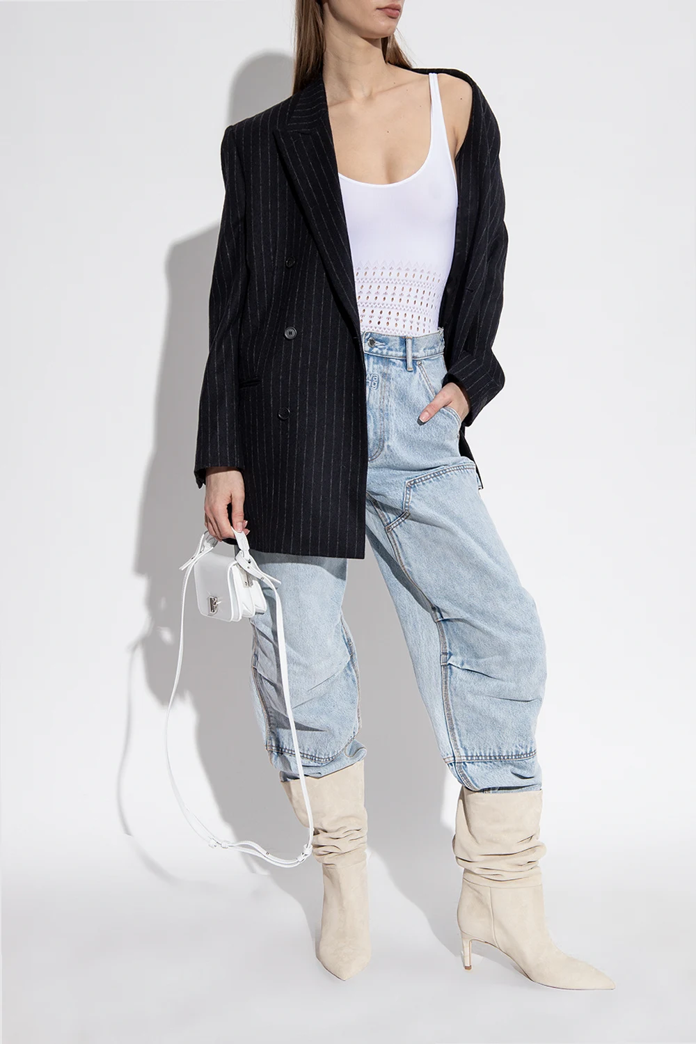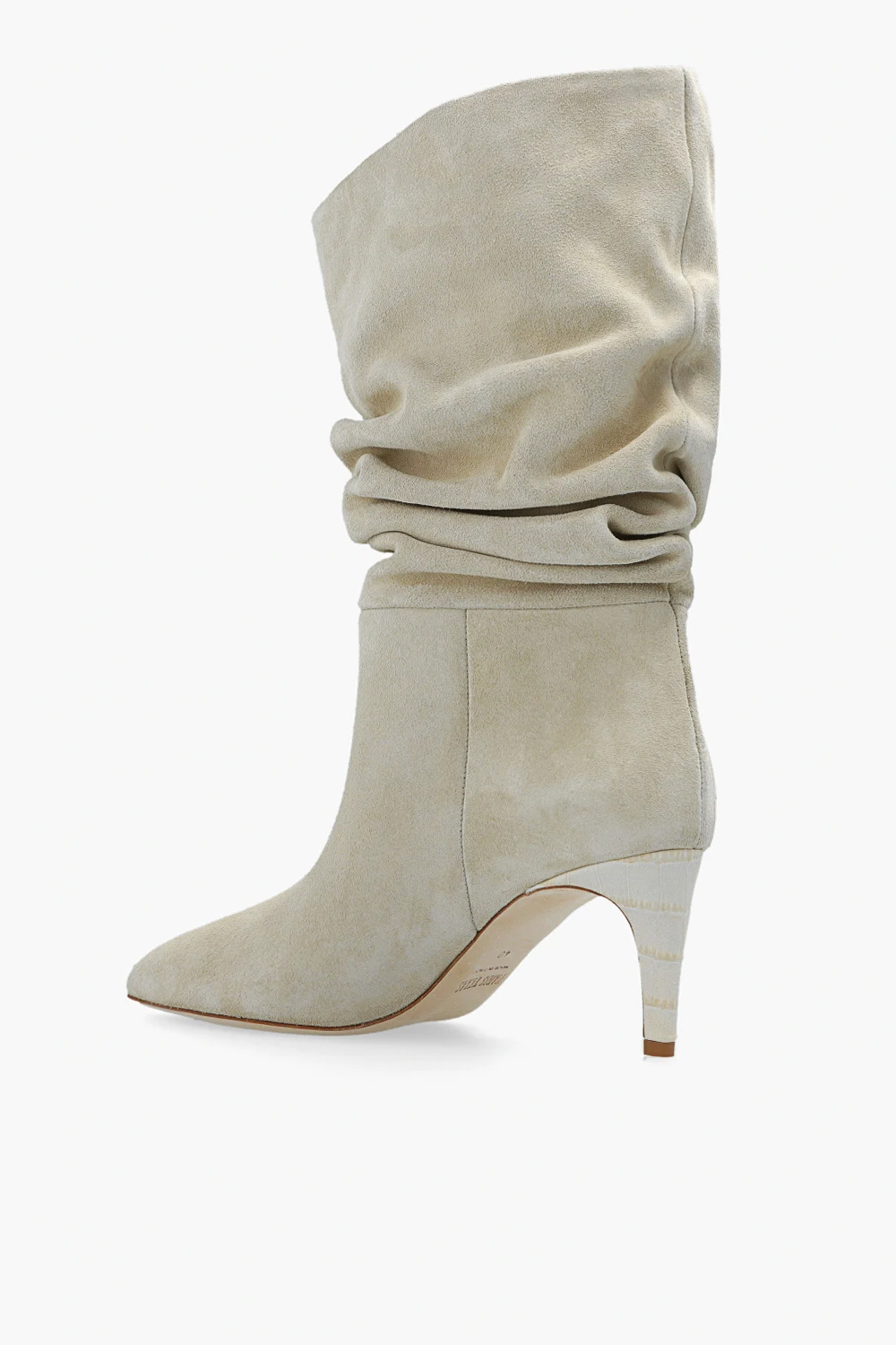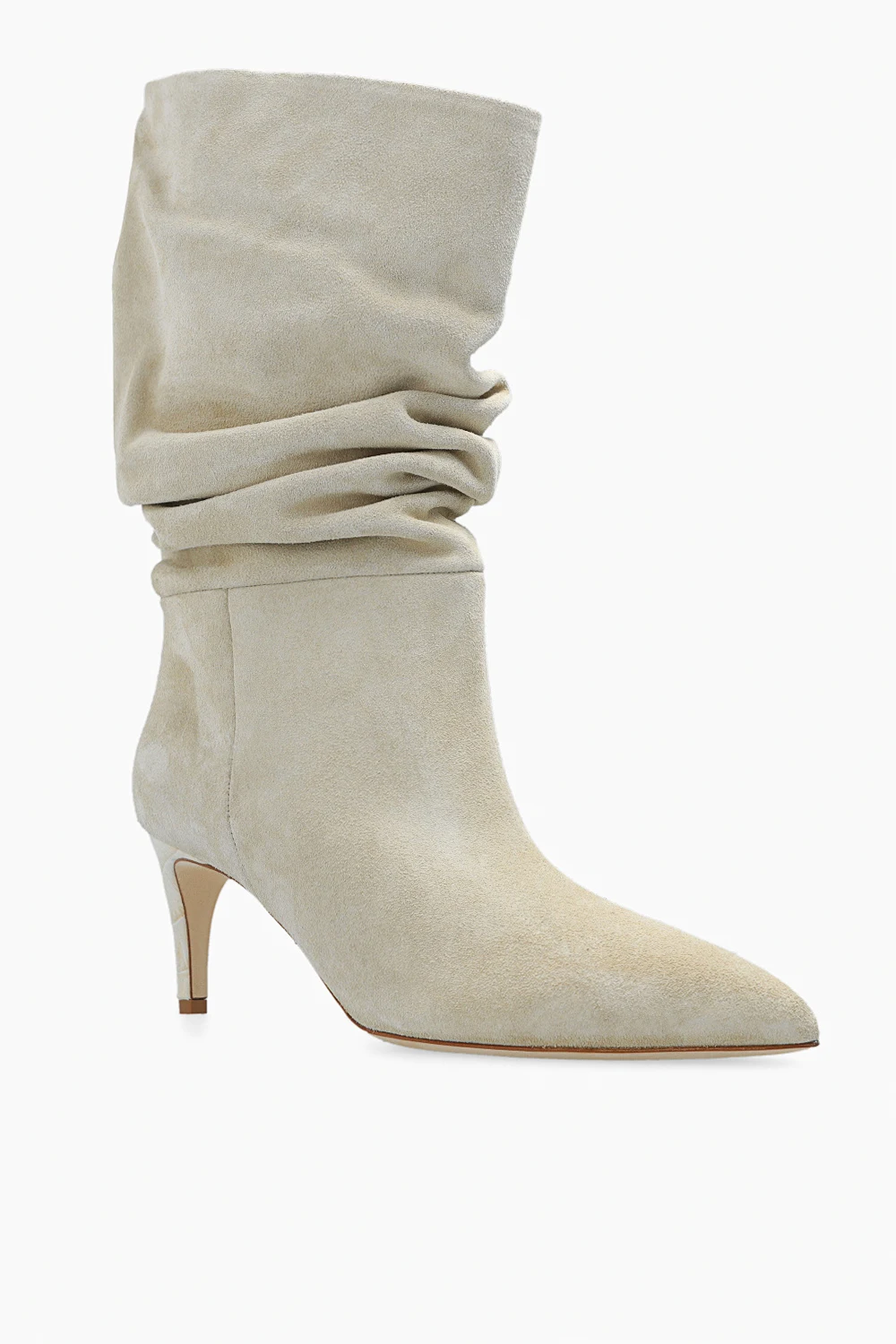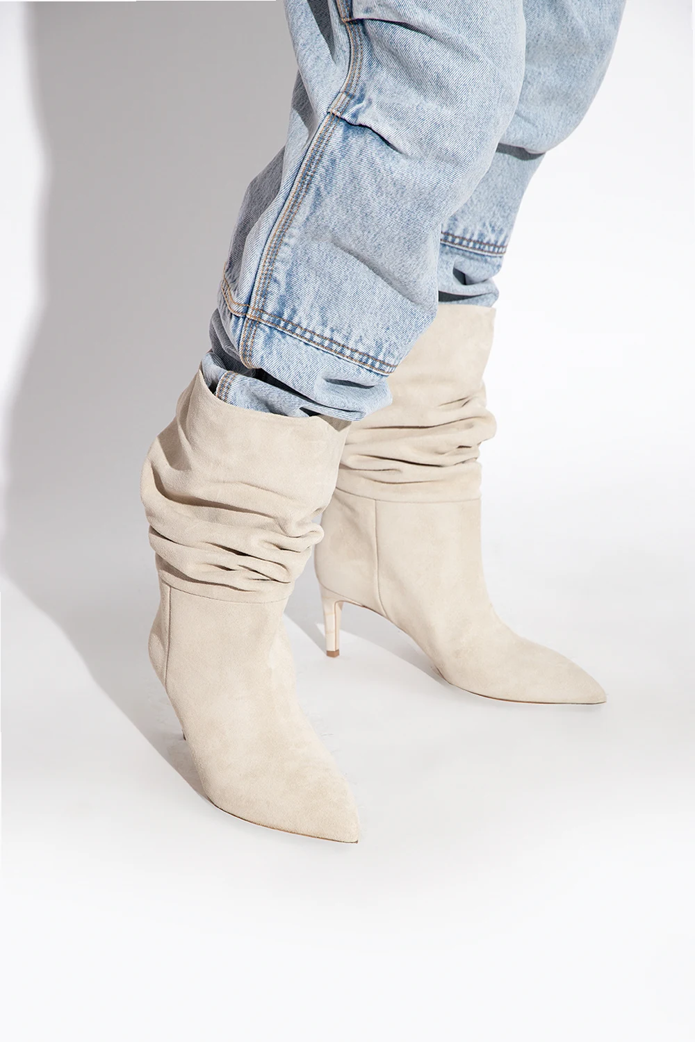 Kremowe, wsuwane botki na obcasie Paris Texas. Wykonane z zamszu. Dekoracyjnie marszczona góra. Nosek w szpic. Kremowa, skórzana podeszwa.