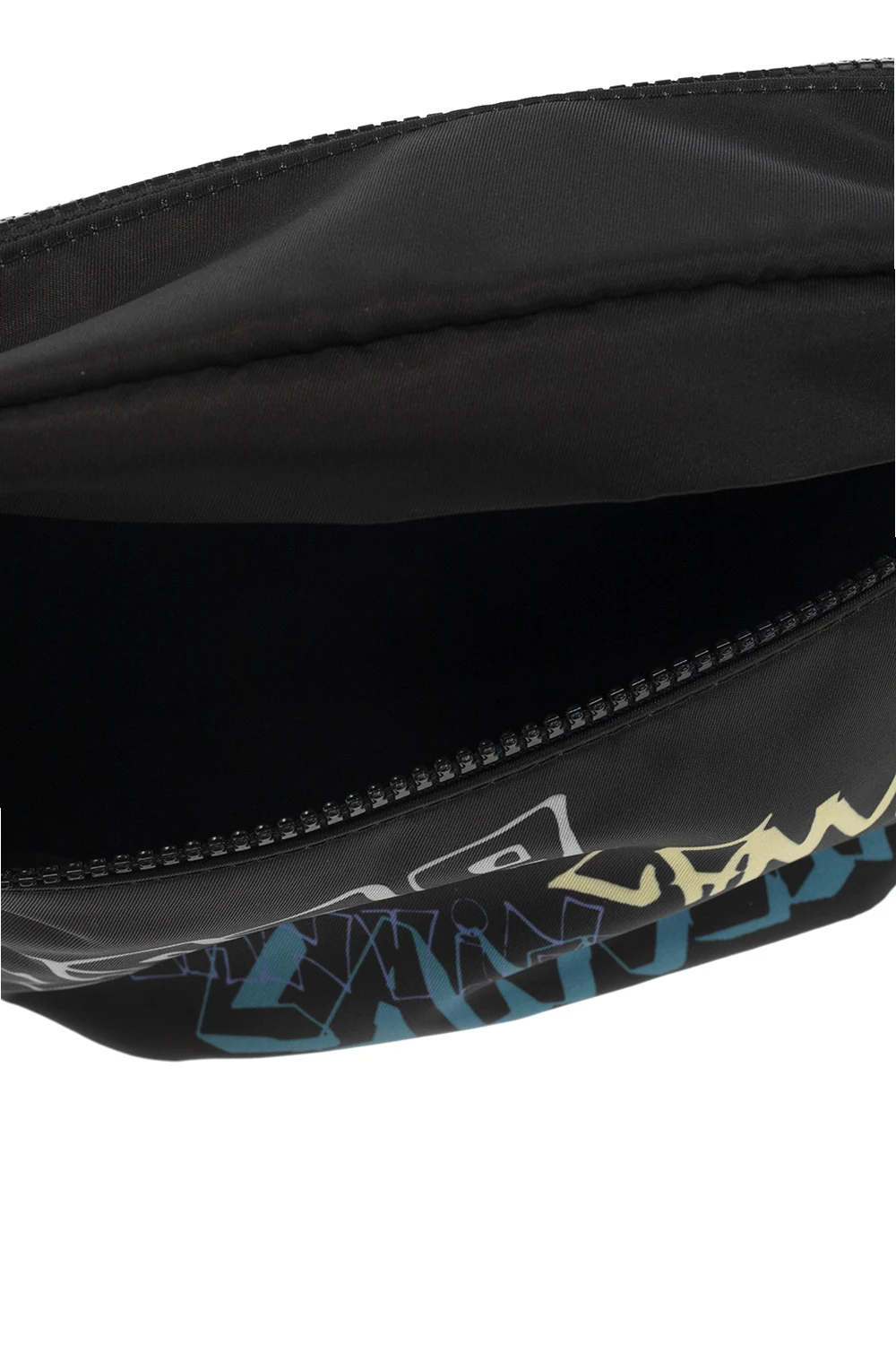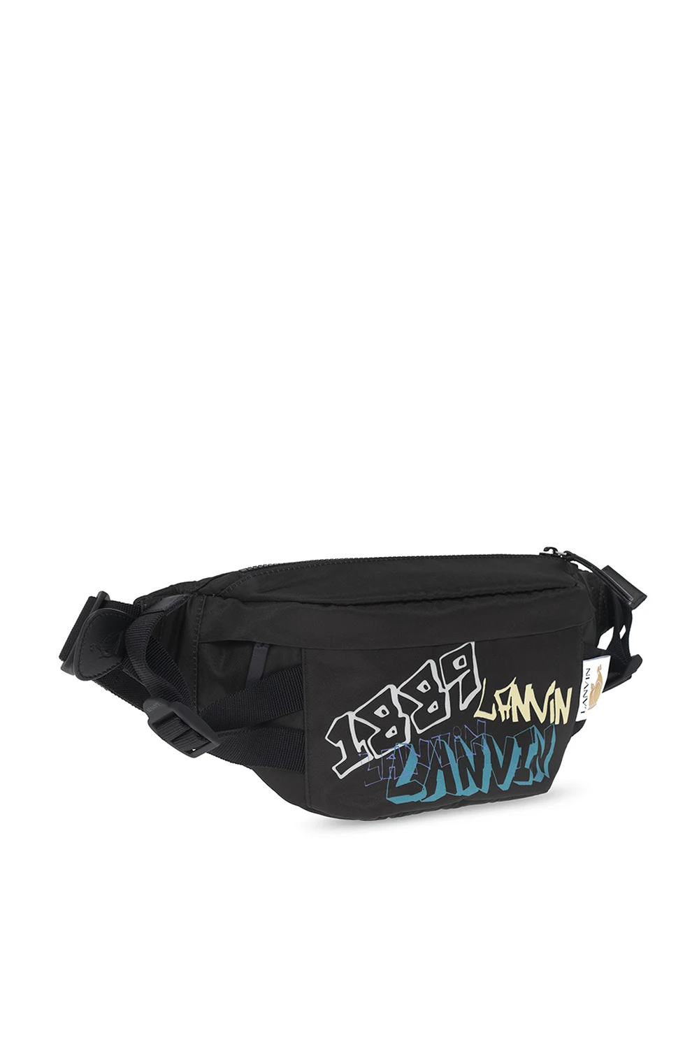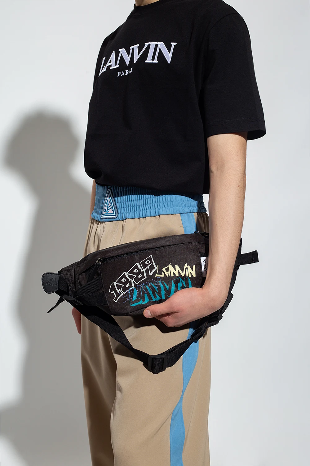 Czarna torba na pas Lanvin. Zamykana na zamek. Ozdobiona kolorowym wzorem oraz naszywką z logo. Z tyłu kieszeń zamykana na zamek. Pas biodrowy z możliwością regulacji długości. Wewnątrz komora oraz wsuwana kieszeń. Skórzane wykończenie.