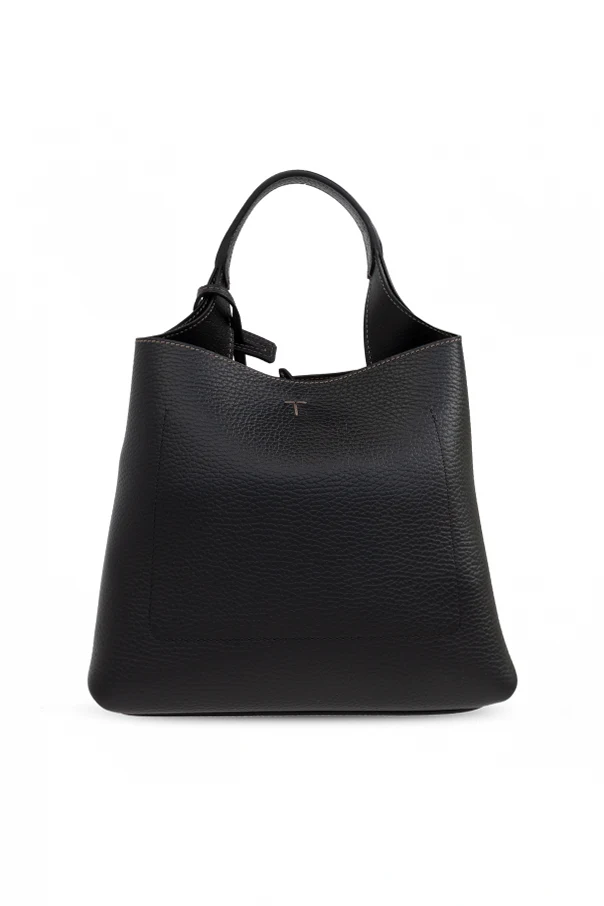 Jej trapezowy kształt z zaokrąglonymi krawędziami emanuje subtelną nowoczesnością, podczas gdy ozdobny metalowy element w kształcie litery „T” dyskretnie podkreśla markę. Torba posiada solidny uchwyt do noszenia w ręku, wykończony kontrastowym przeszyciem, oraz zamknięcie na zamek błyskawiczny, które zapewnia bezpieczeństwo przechowywanych przedmiotów.
