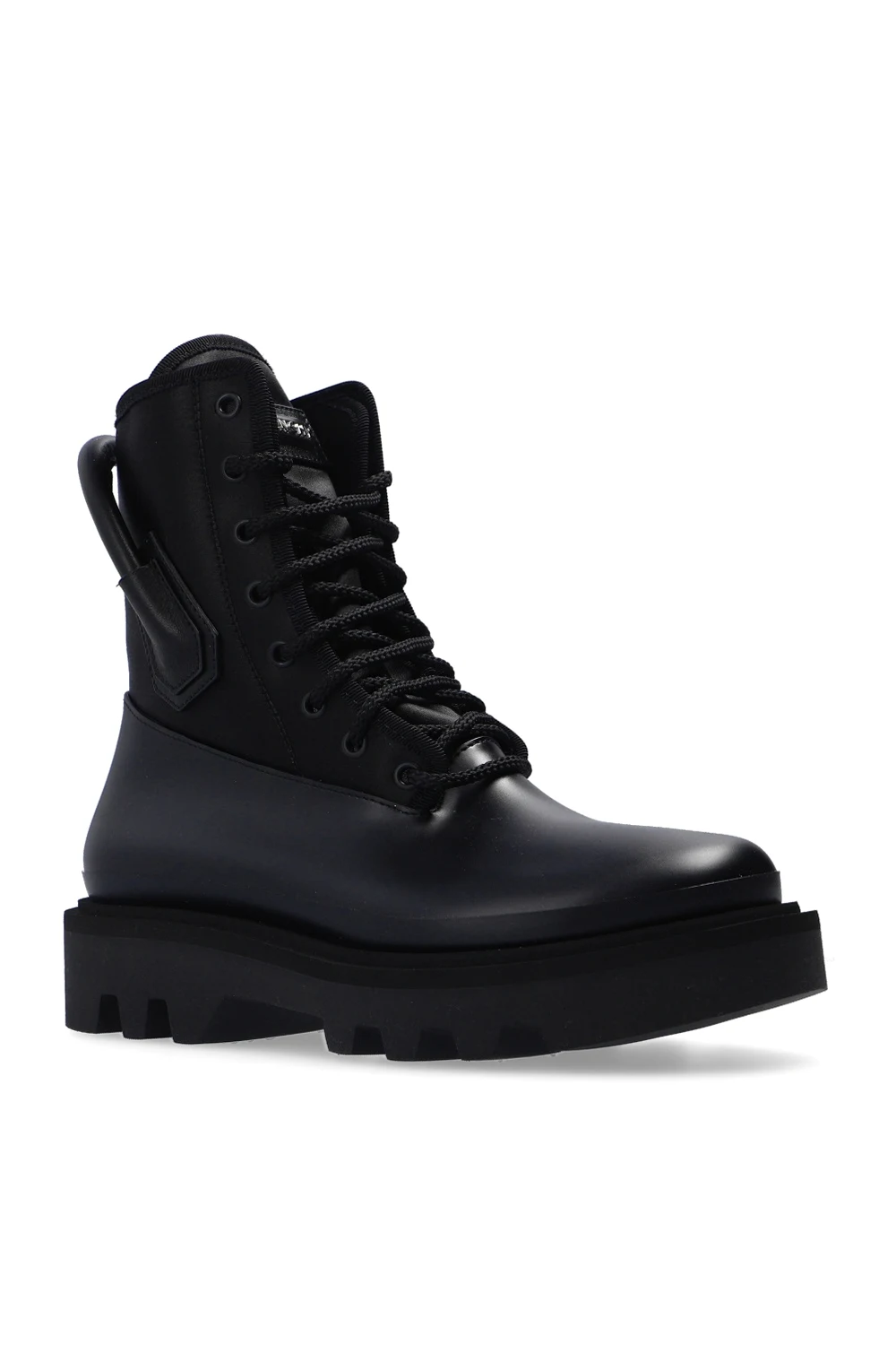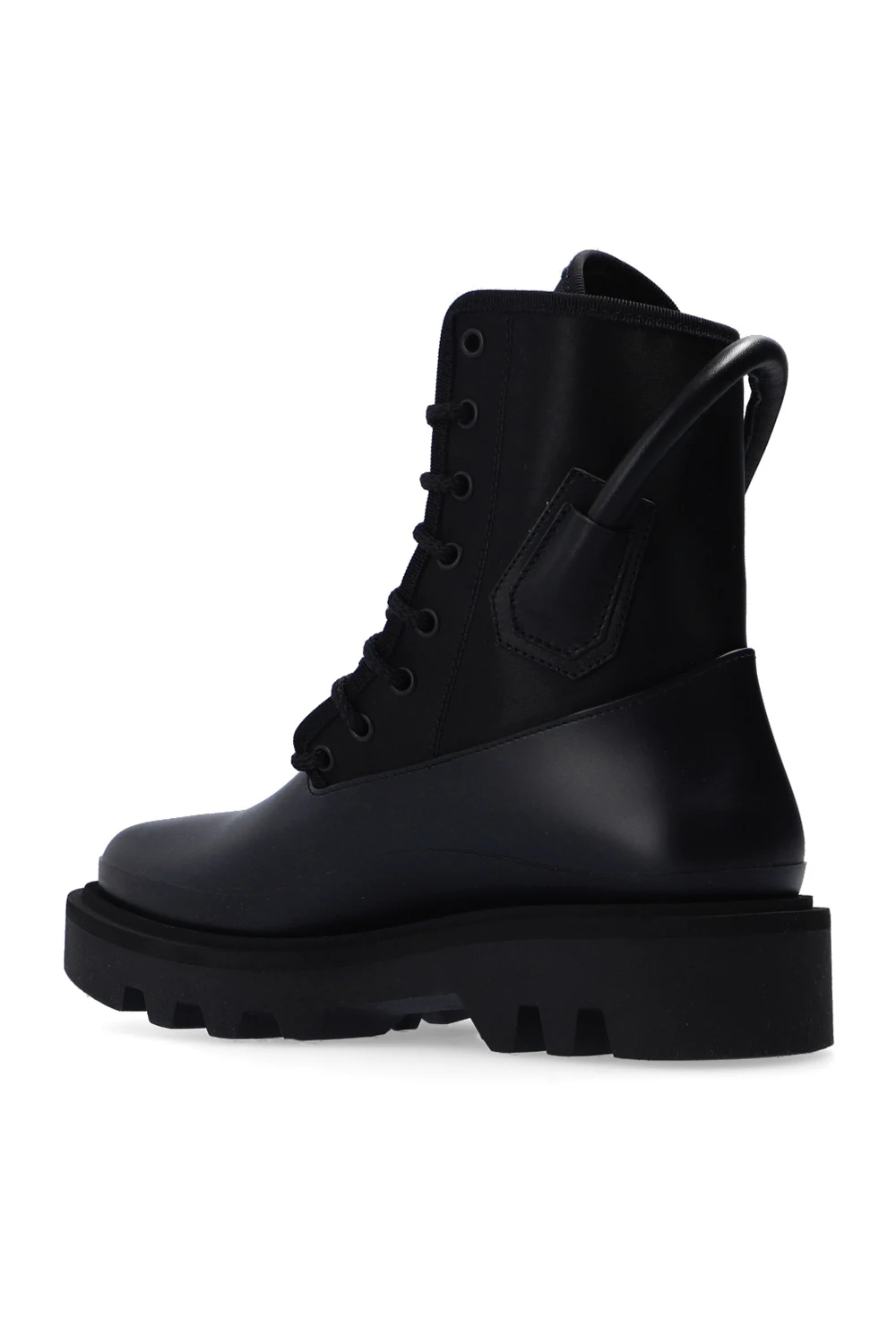 Czarne, sznurowane botki, model ‘Combat’ Givenchy. Wykończone skórą oraz jedwabiem. Metalowa aplikacja z logo w kolorze srebrnym. Czarna, gumowa podeszwa.