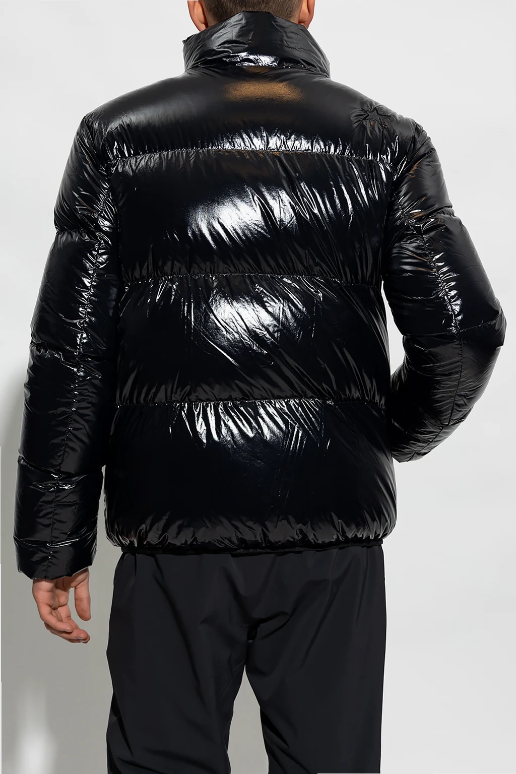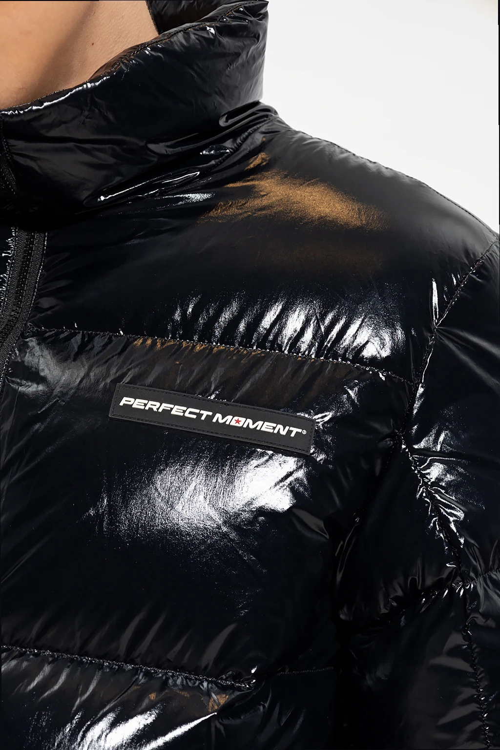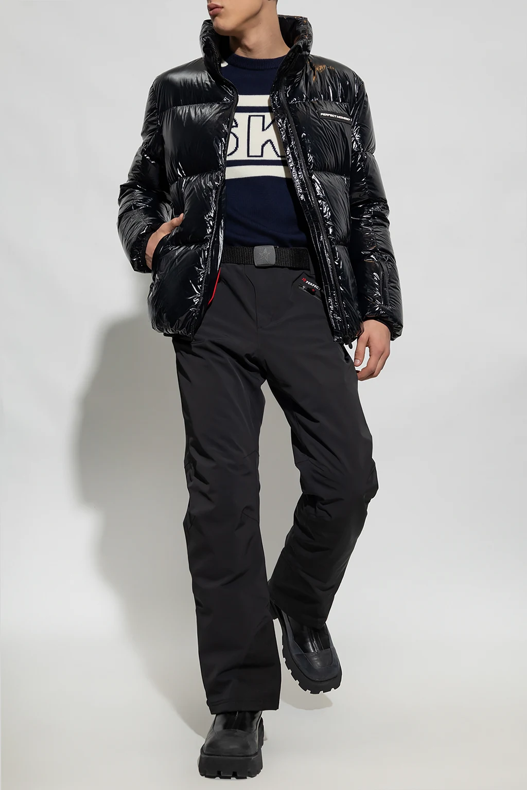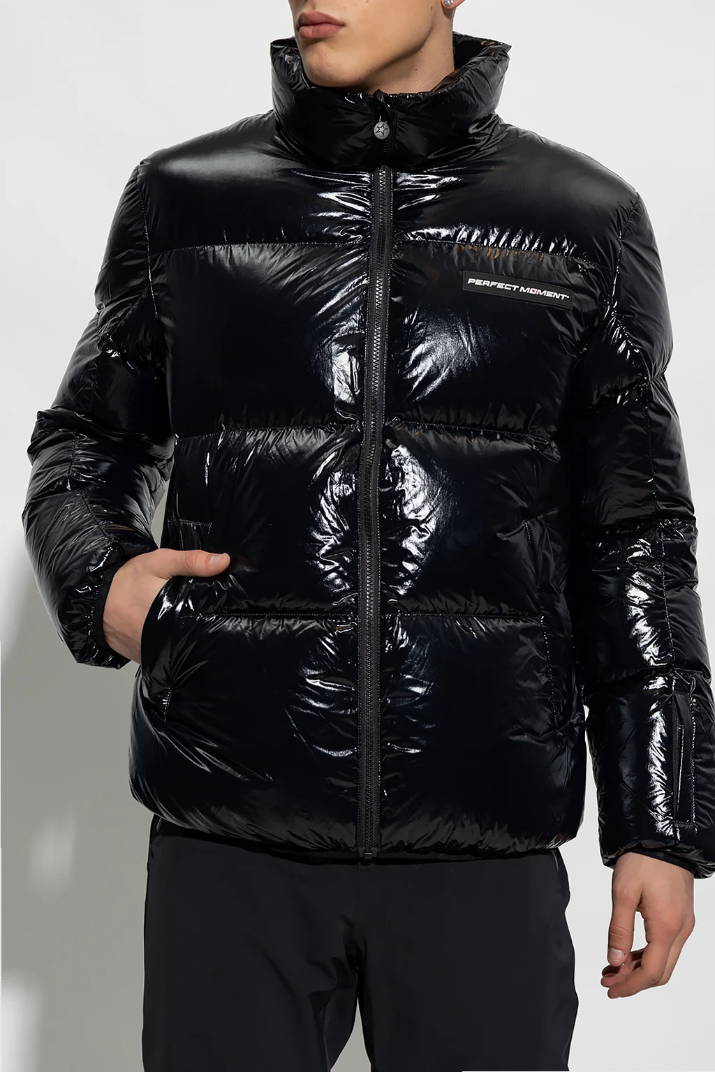 Czarna kurtka narciarska, model ‘Samson’ Perfect Moment. Wykonana z połyskującego materiału. Wypełniona puchem pozyskiwanym w zrównoważony sposób. Zapinana na zamek. Ozdobiona naszywką z logo w kolorze czarno-białym. Dwie kieszenie zapinane na zamek. Długie rękawy i dół zakończone ściągaczem.