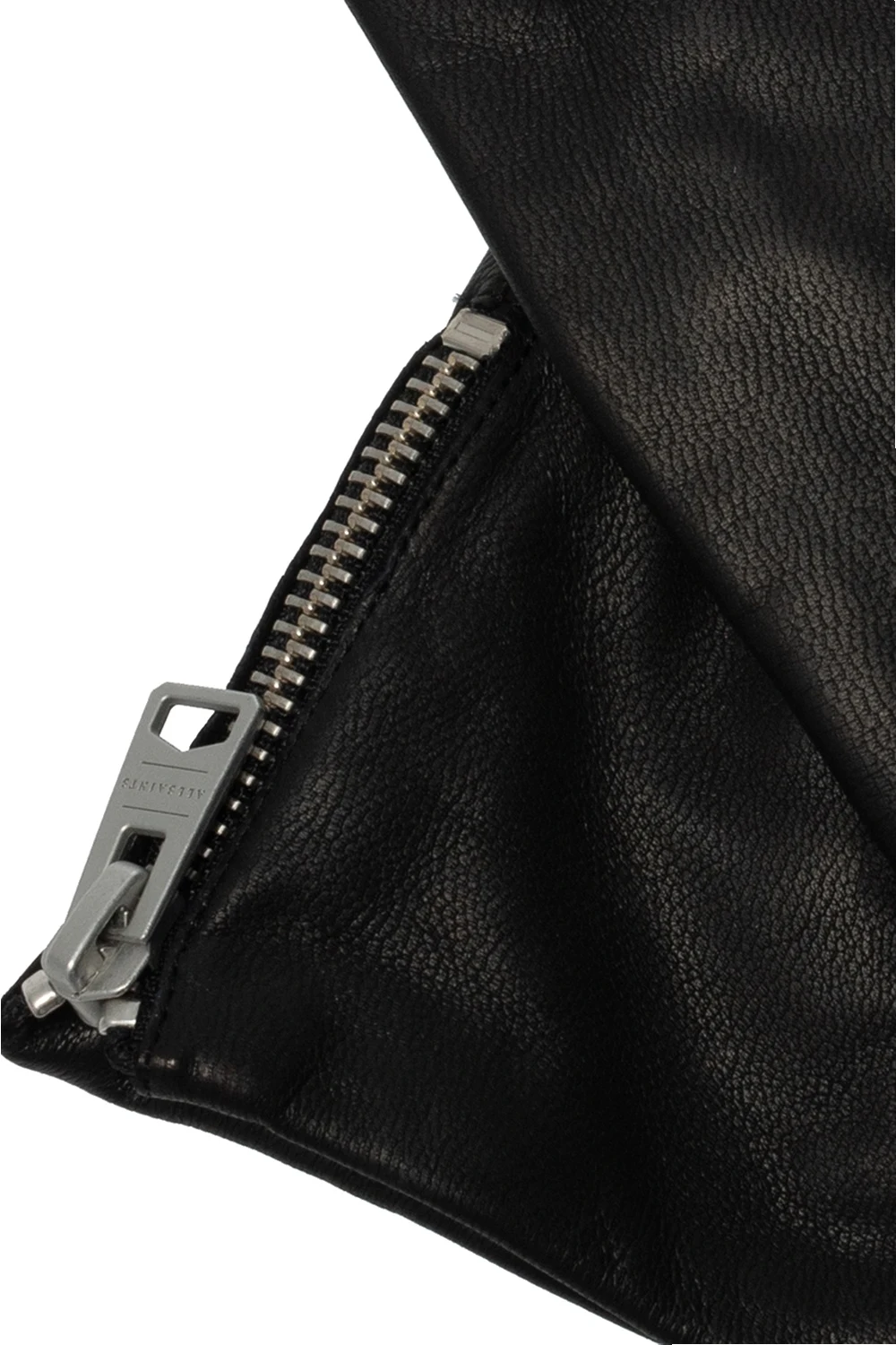 Czarne rękawiczki, model ‘Zipper’ AllSaints. Wykonane z koźlęcej skóry. Z przodu wszyty zamek z logo.