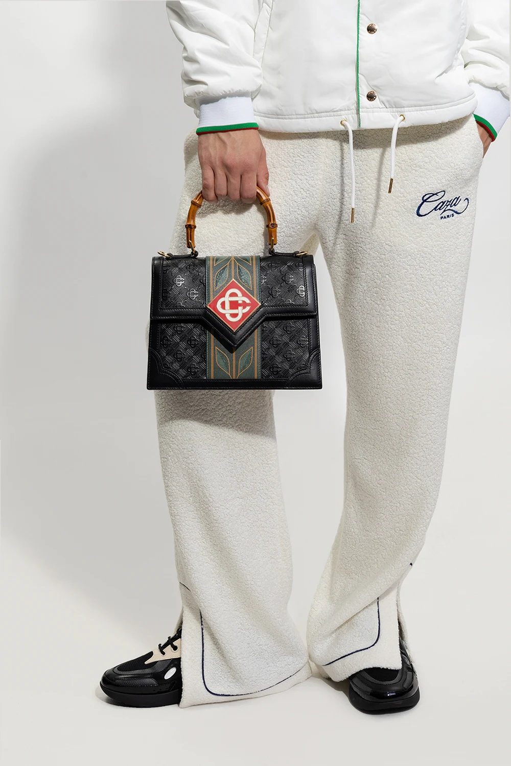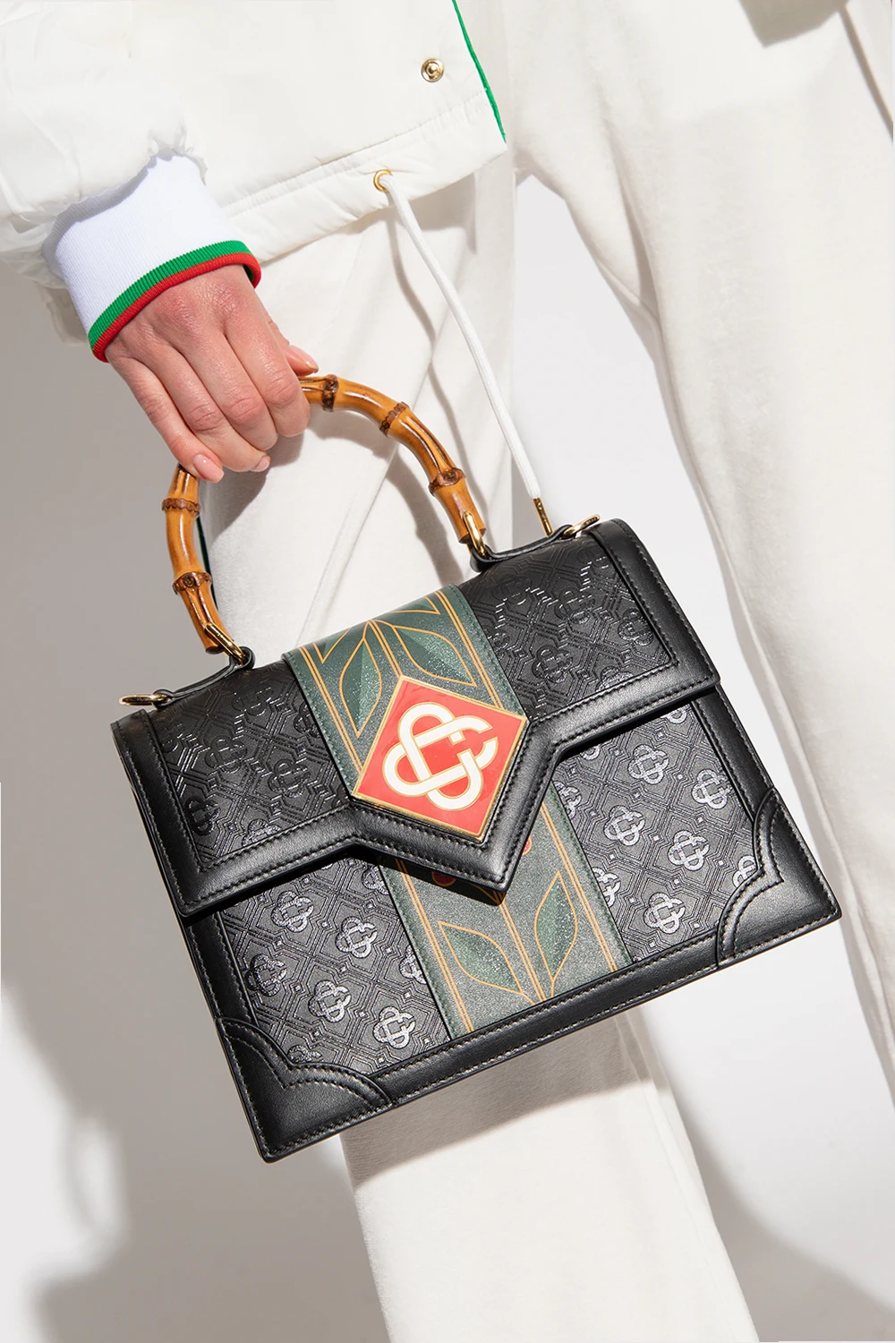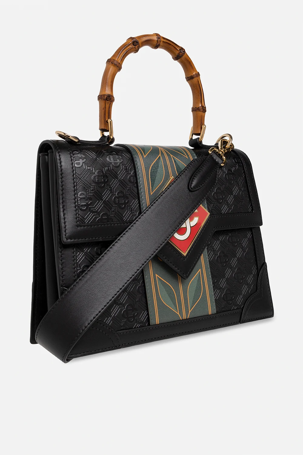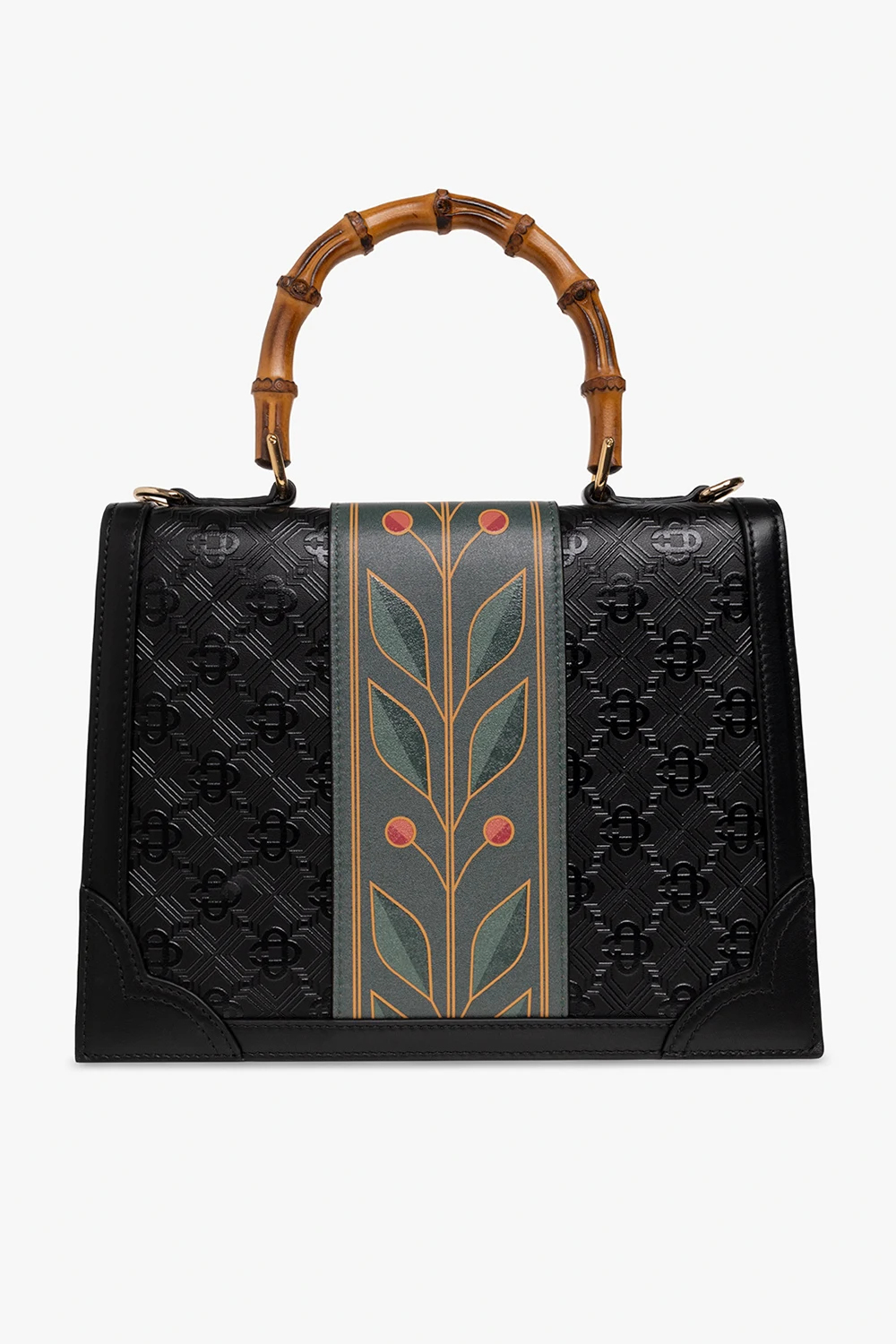 Czarna, skórzana torba na ramię, model ‘Jeannie’ Casablanca. Dekoracyjne zamknięcie ozdobione metalową aplikacją z logo w kolorze czerwono-biało-złotym. Ozdobiona wytłoczonym wzorem z monogramem. Dekoracyjny pas biegnący przez środek torby, ozdobiony motywem roślinnym w kolorze zielono-żółtym. Krótka, bambusowa rączka oraz odpinany pas na ramię. Wewnątrz dwie oddzielne komory oraz dwie wsuwane kieszenie. Metalowe wykończenie w kolorze złotym.