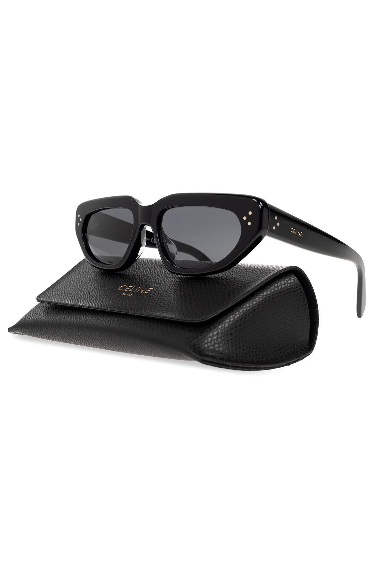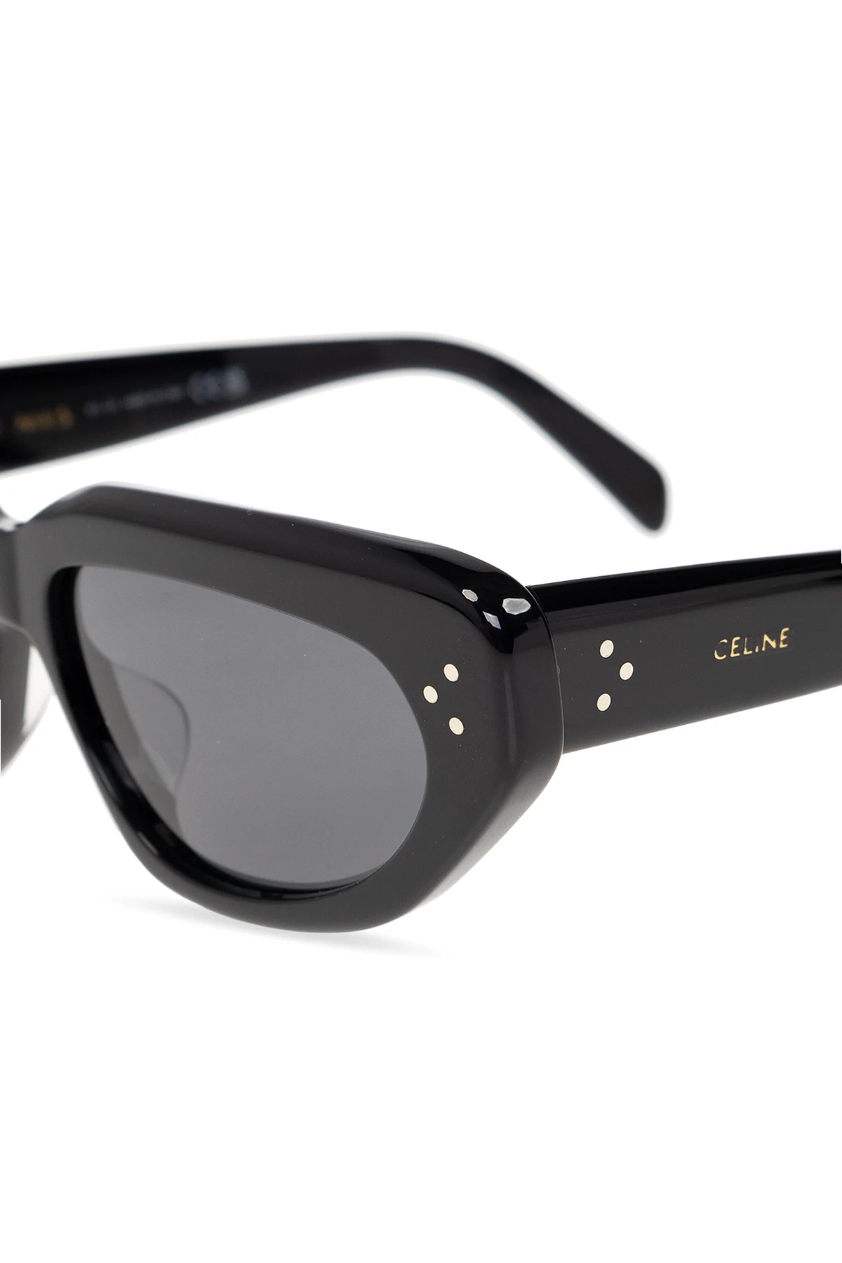 Czarne okulary przeciwsłoneczne Celine. Oprawki w kształcie kocich oczu. Zauszniki ozdobione logo w kolorze złotym i metalowymi aplikacjami w kolorze srebrnym. Szare soczewki ze 100% ochroną przed promieniowaniem UV.
