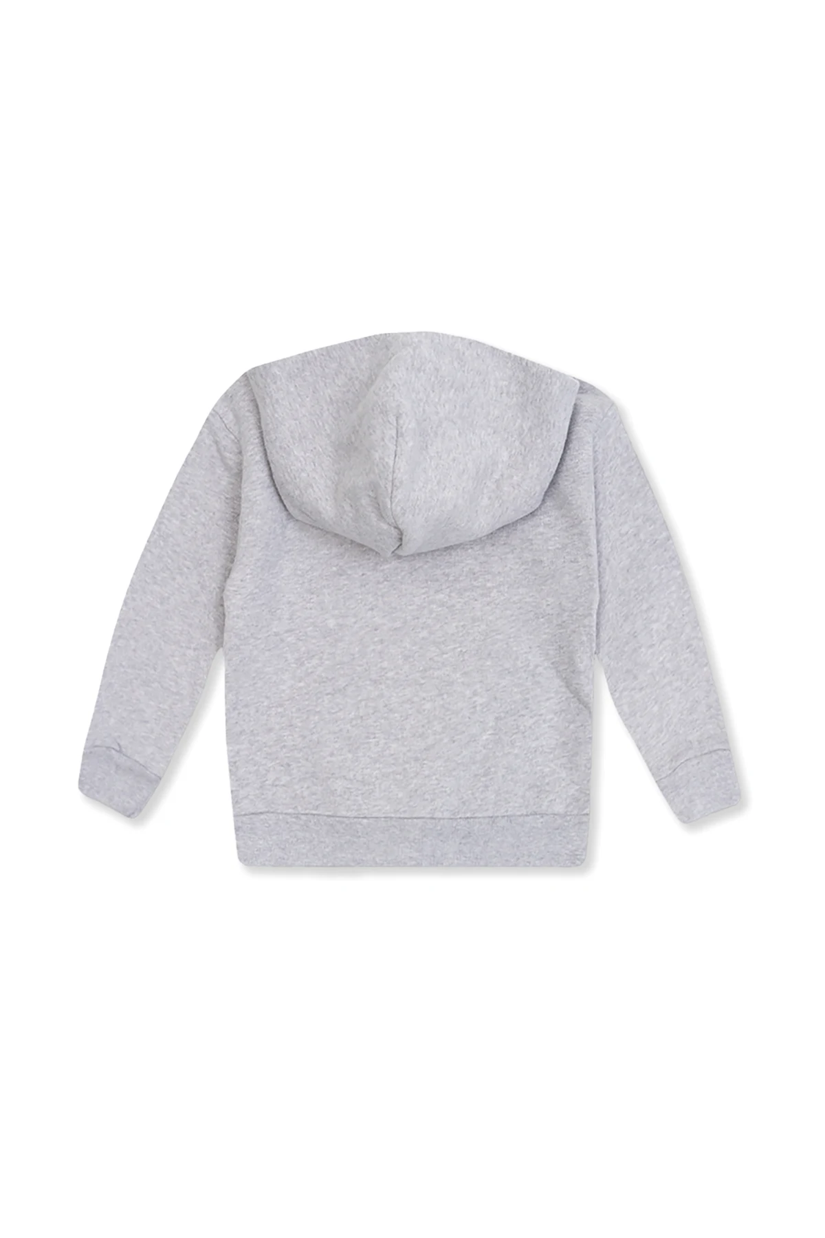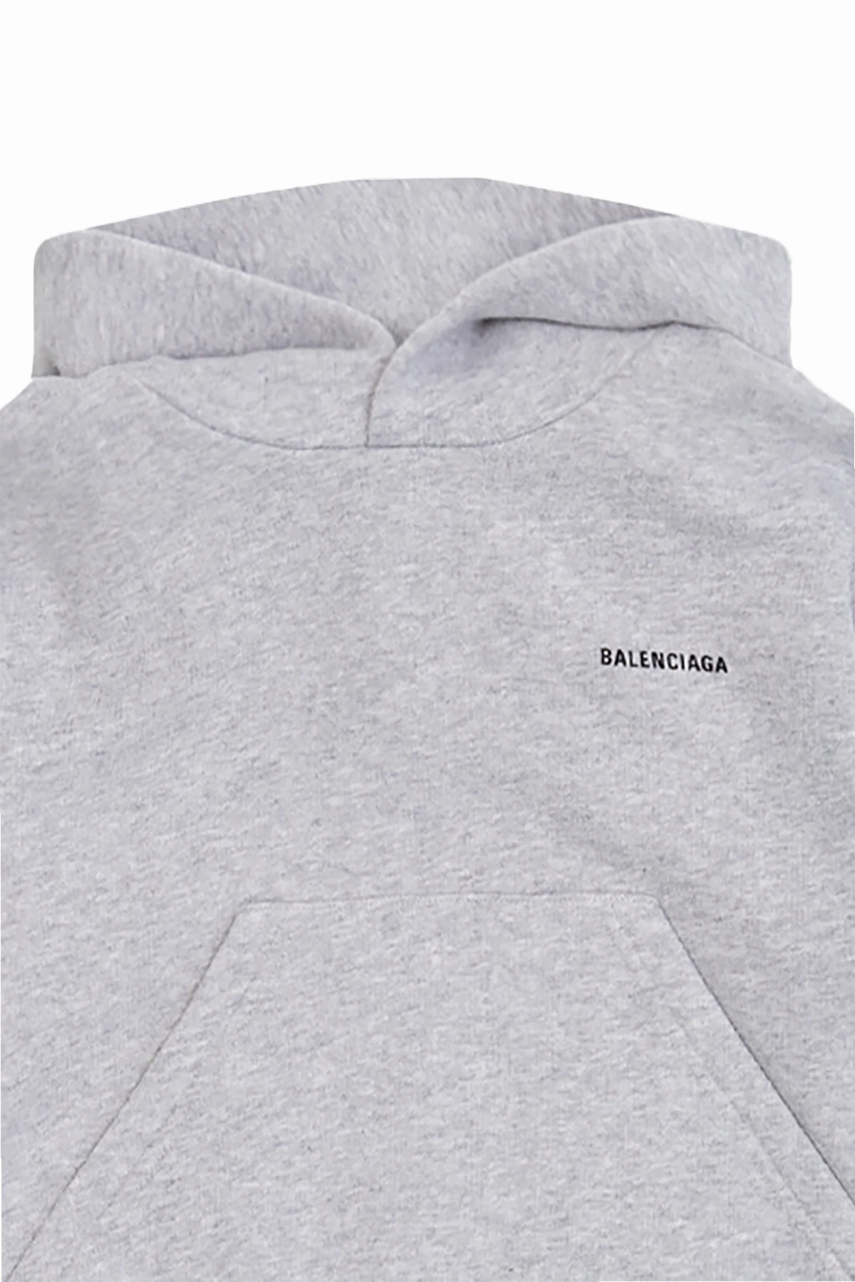Szara bluza z kapturem Balenciaga Kids. Wykonana z bawełny. Ozdobiona nadrukiem z logo w kolorze czarnym. Wsuwana kieszeń. Dół i długie rękawy wykończone ściągaczem.