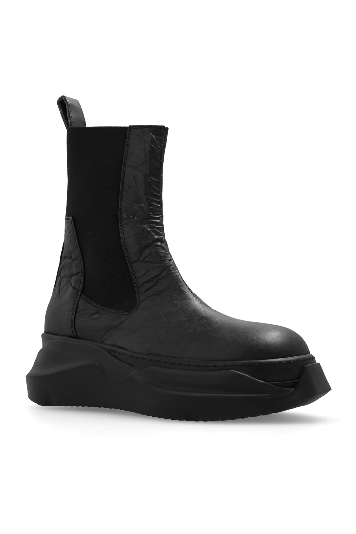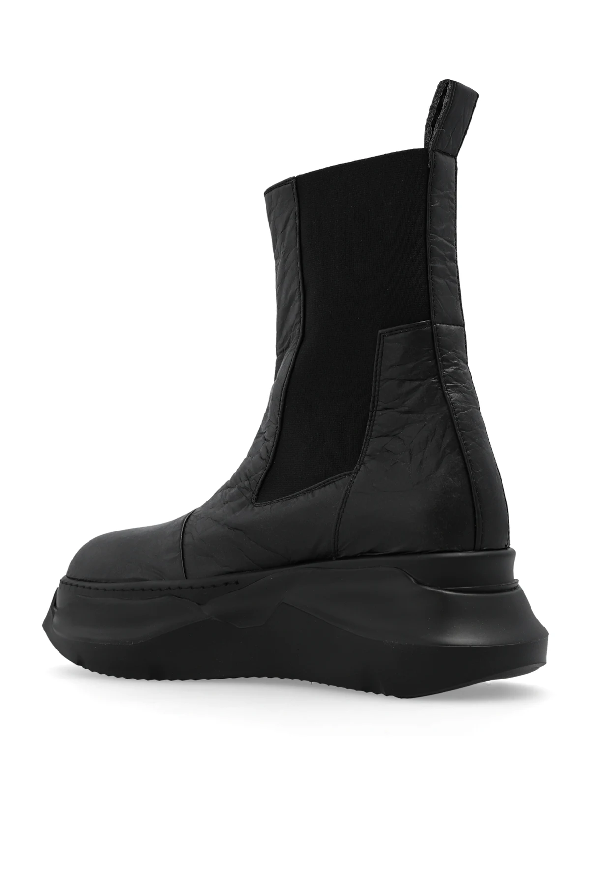 Czarne buty za kostkę, model ‘Beatle Abstract’ Rick Owens DRKSHDW. Wykonane z materiału imitującego papier. Po bokach wszyta taśma elastyczna. Czarna, gumowa podeszwa o geometrycznym kształcie.