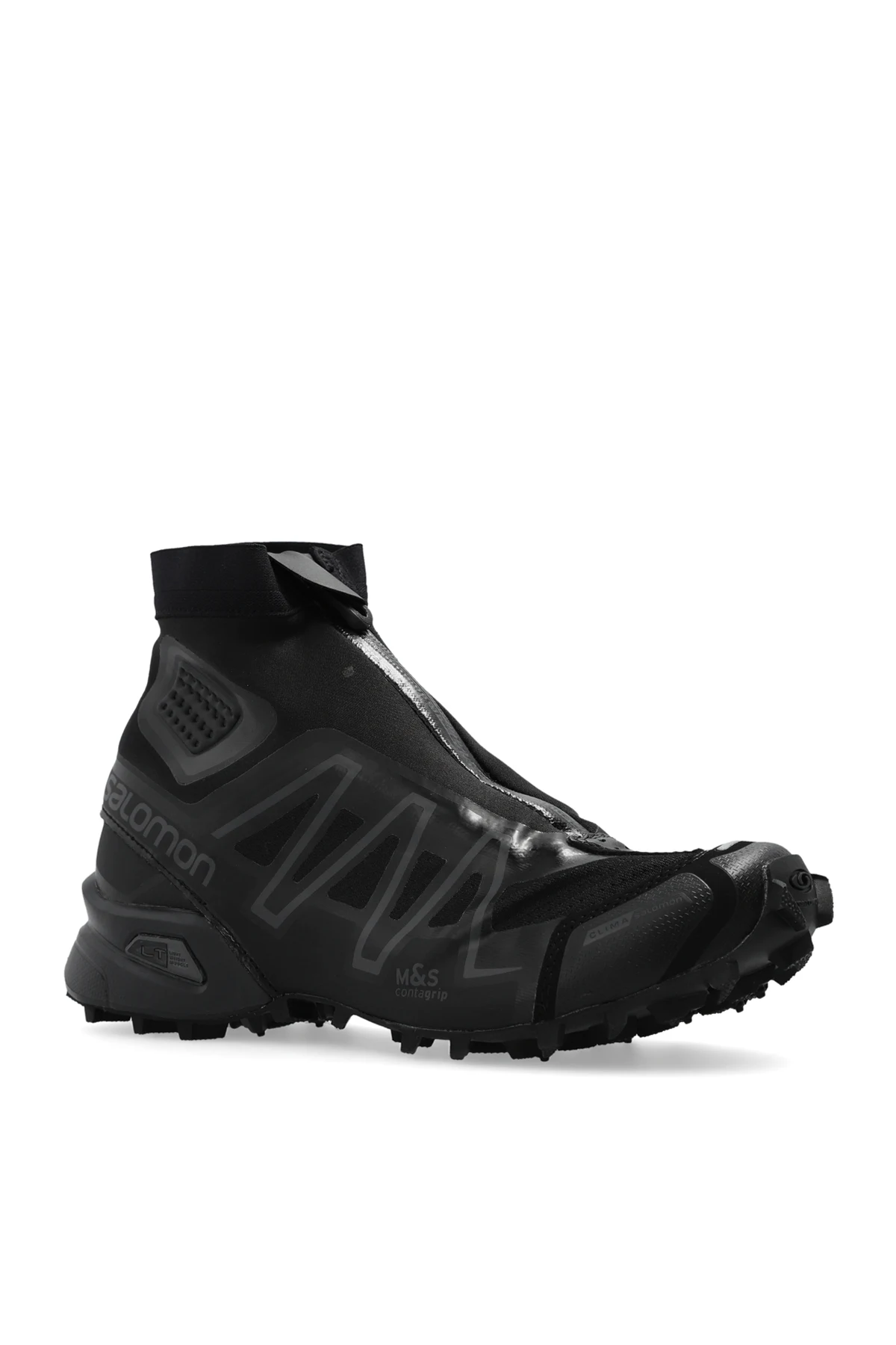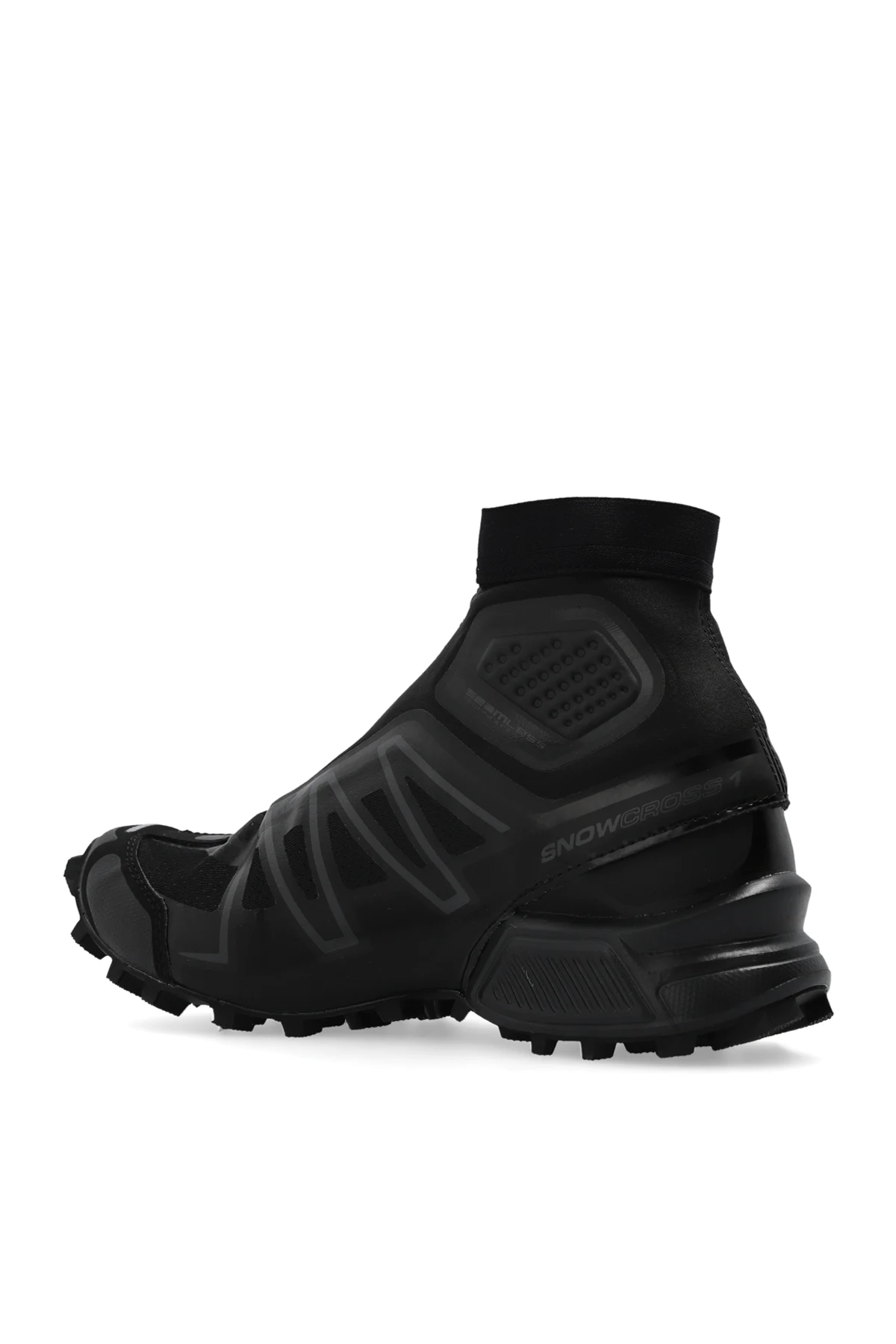 Czarne, wsuwane buty sportowe za kostkę, model ‘SNOWCROSS’ Salomon. Wykonane z materiału i tworzywa sztucznego. Ozdobione logo oraz wzorem imitującym przeszycia klatki usztywniającej cholewkę. Czarna, gumowa podeszwa z systemem ‘Contagrip®’, zapewniającym świetną przyczepność.