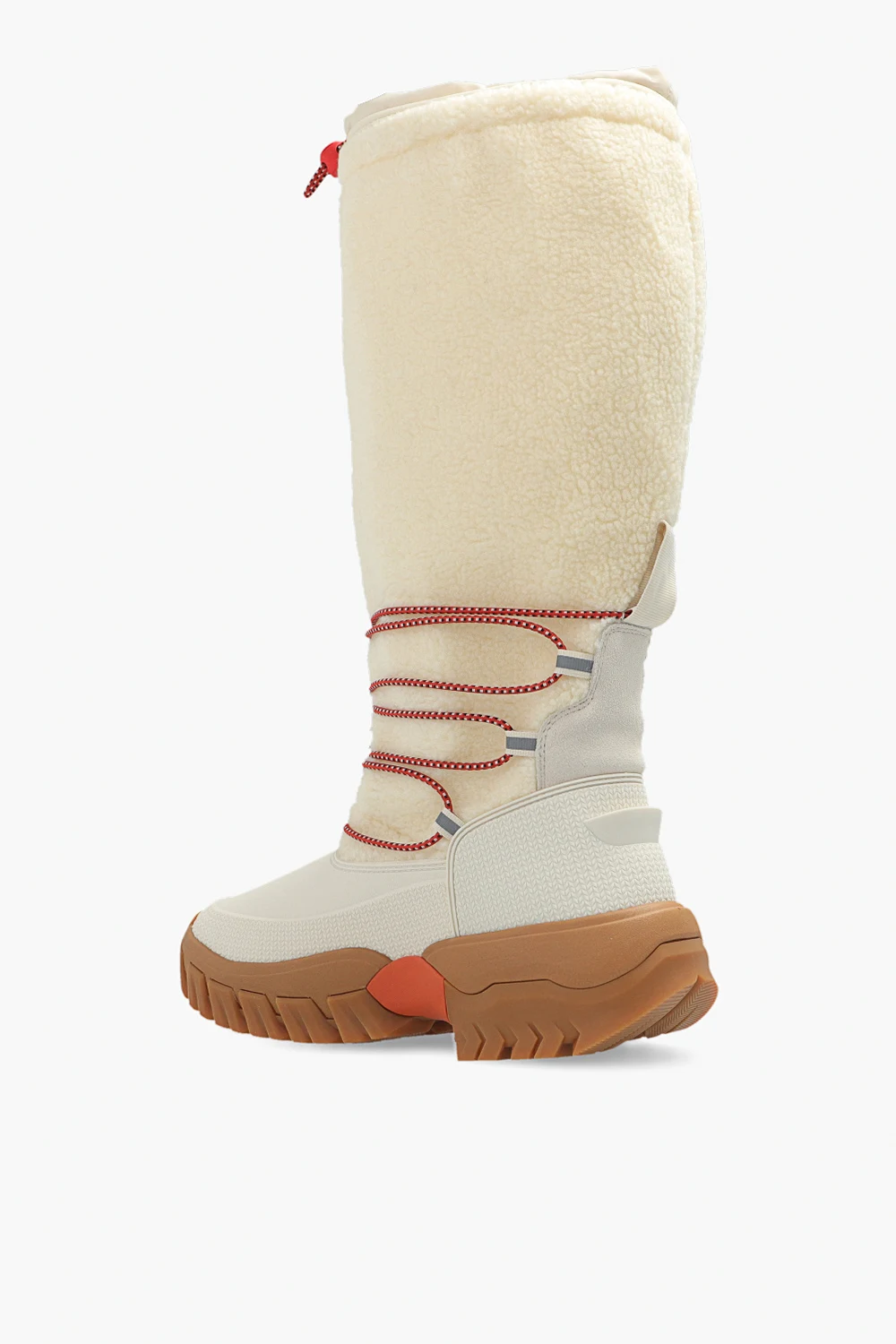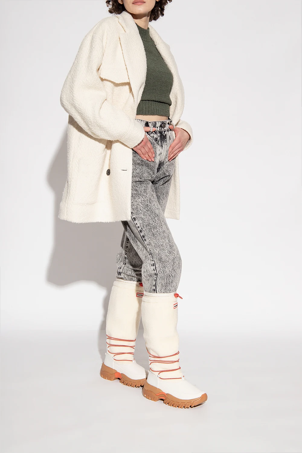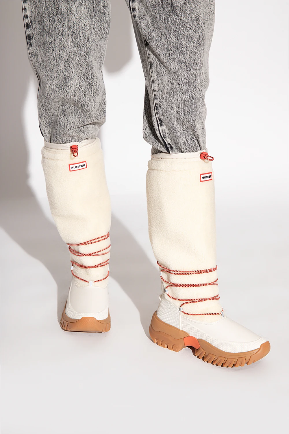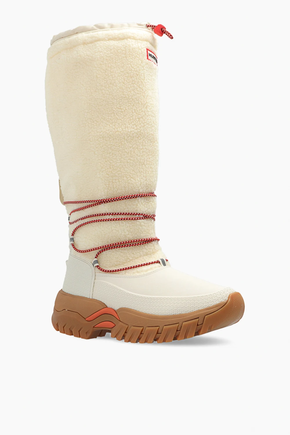 Kremowo-białe śniegowce, model ‘Wanderer’ Hunter. Ręcznie wykonane z naturalnego kauczuku pochodzącego z lasów niezależnie kontrolowanych zgodnie ze standardami ‘Forest Stewardship Council®’. Wygodna, wegańska cholewka z owczej skóry i podszewka z polaru z recyklingu, jest odporna na temperatury do -25°C (-13°F). Elastyczny sznurek i zapięcie wzdłuż górnej linii utrzymują ciepło, a przyczepne gumowe podeszwy i wspierające wkładki ‘OrthoLite®’ oznaczają, że możesz wędrować przez zimne klimaty z pewnością i komfortem.