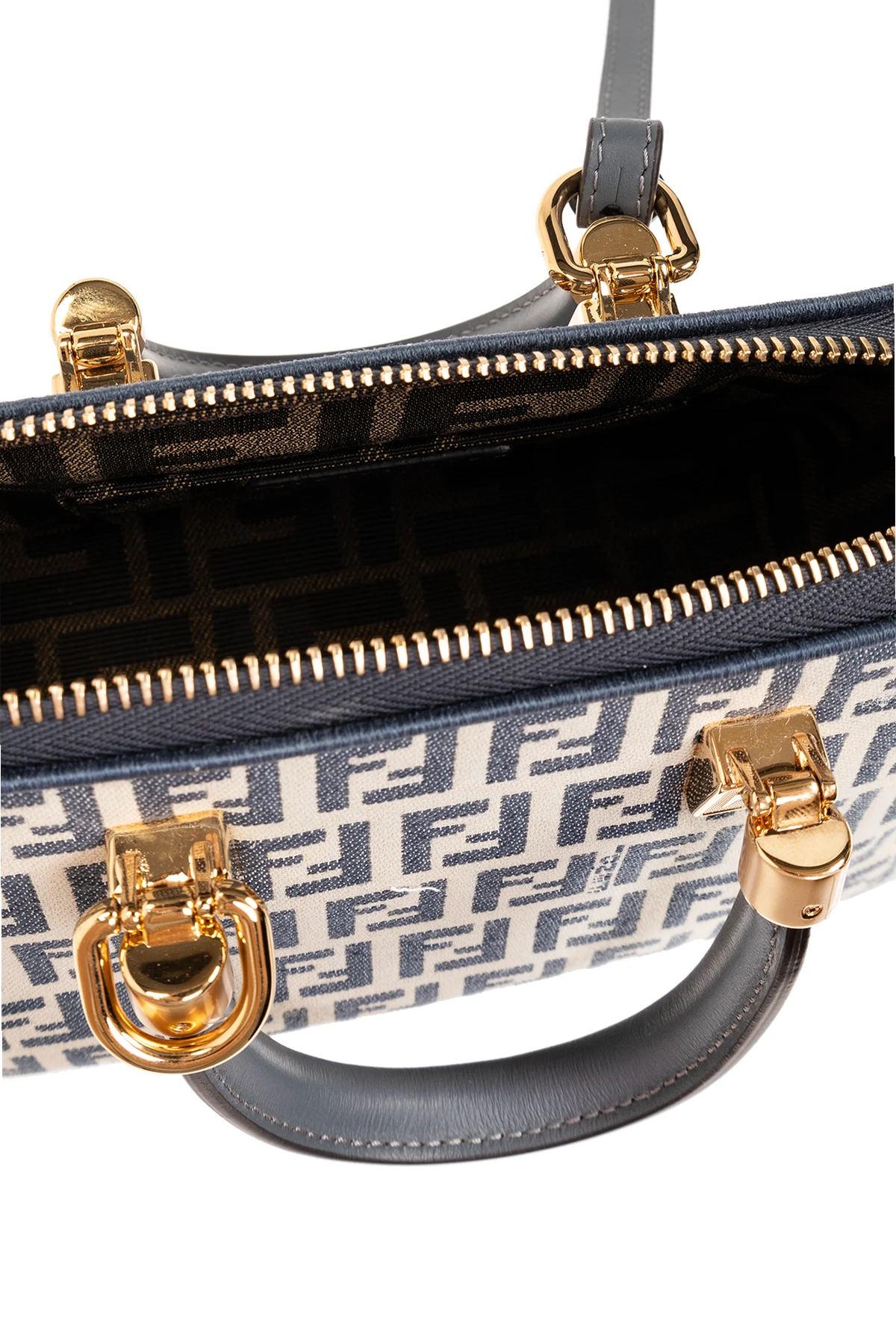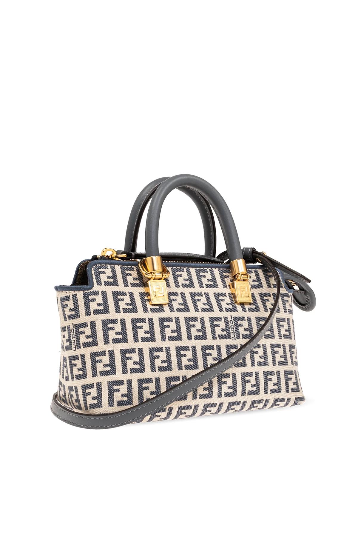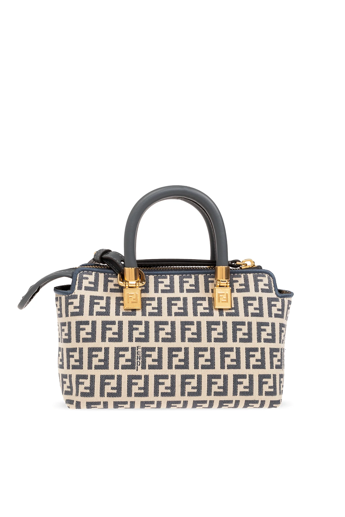 Niebieskoszaro-kremowa torba na ramię, model ‘By The Way Mini’ Fendi. Zamykana na zamek. Wykonana z płótna ozdobionego monogramem. Dwie półokrągłe rączki. Odpinany, regulowany pas. Wewnątrz komora z miejscem na kartę. Metalowe elementy w kolorze złotym.