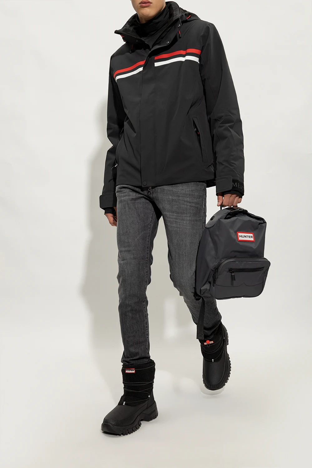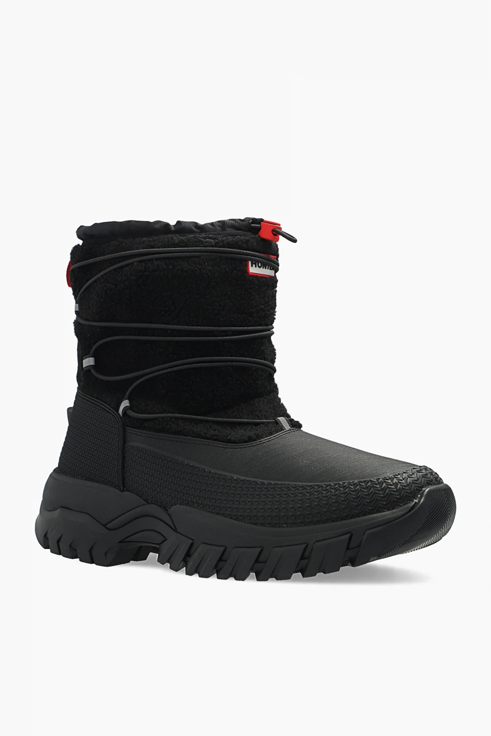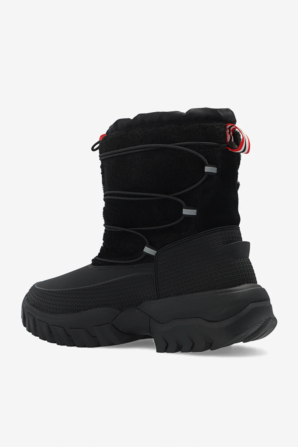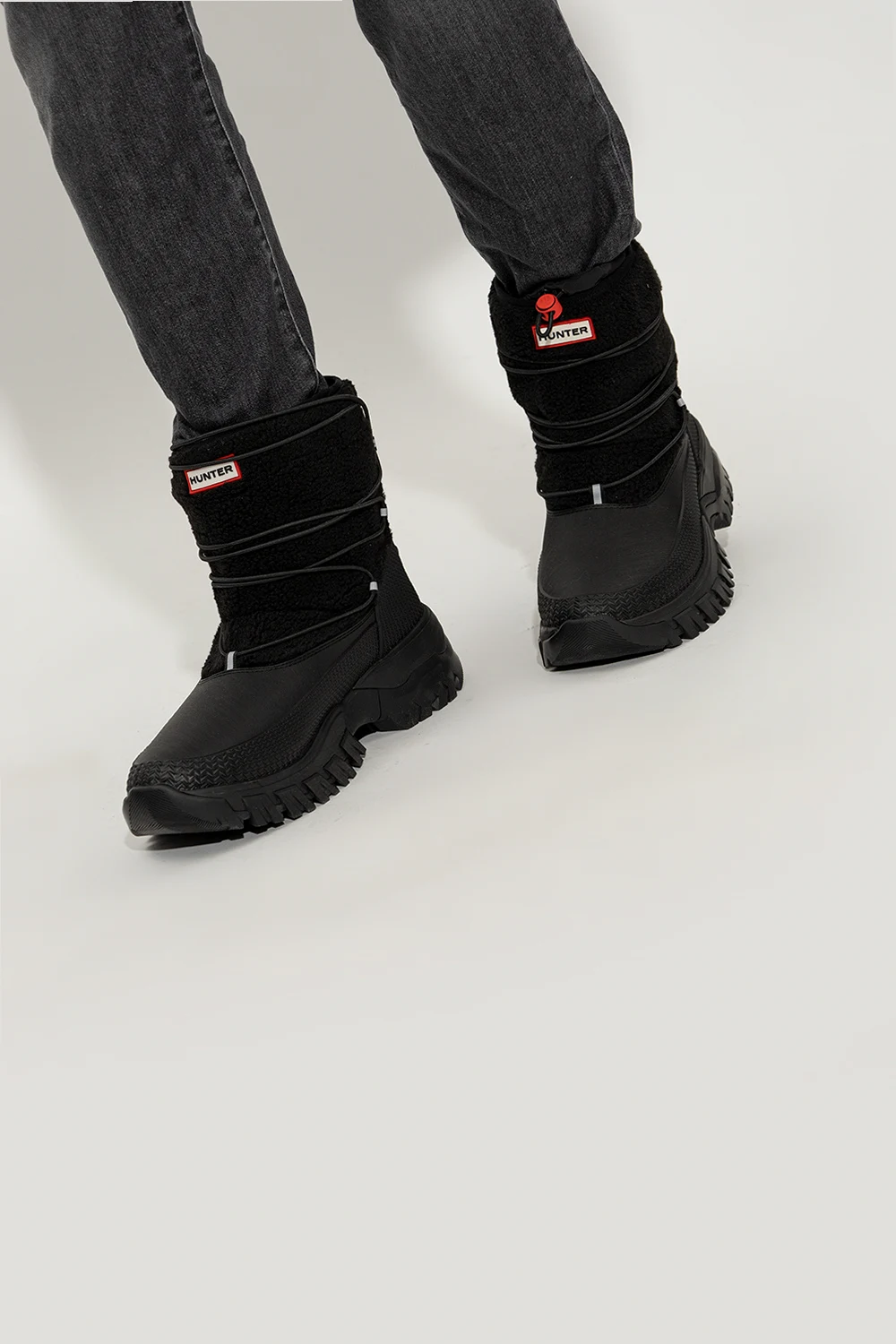 Czarne, wodoodporne śniegowce, model ‘Wanderer’ Hunter. Wykonane ręcznie z przytulną, wegańską cholewką z owczej skóry i podszewką z polaru z recyklingu. Ozdobione wzorem z logo w kolorze biało-czarno-czerwonym. Są odporne na temperaturę do -25°C (-13°F). Elastyczny sznurek i zapięcie wzdłuż górnej linii utrzymują ciepło. Posiadają przyczepne, gumowe podeszwy i wspierające wkładki ‘OrthoLite®’.
