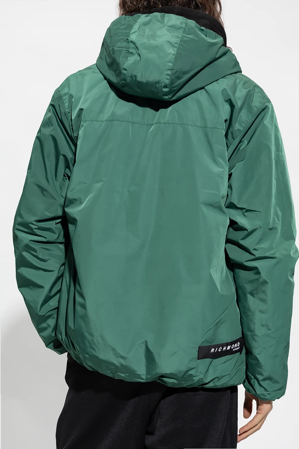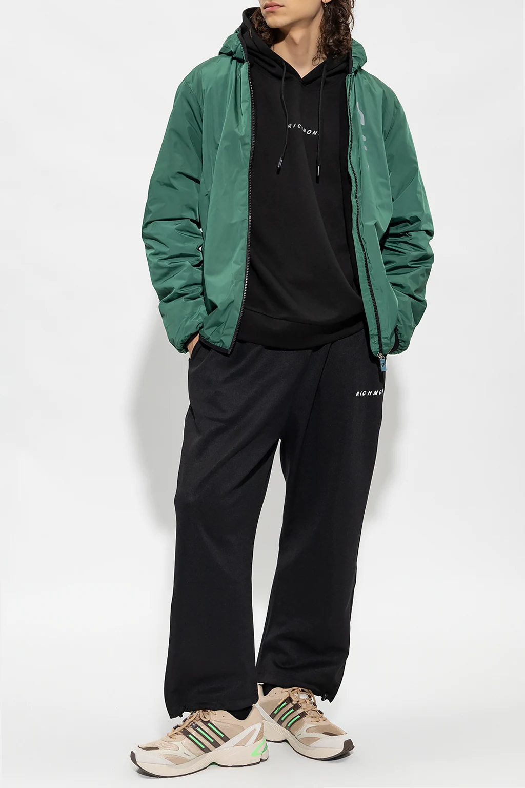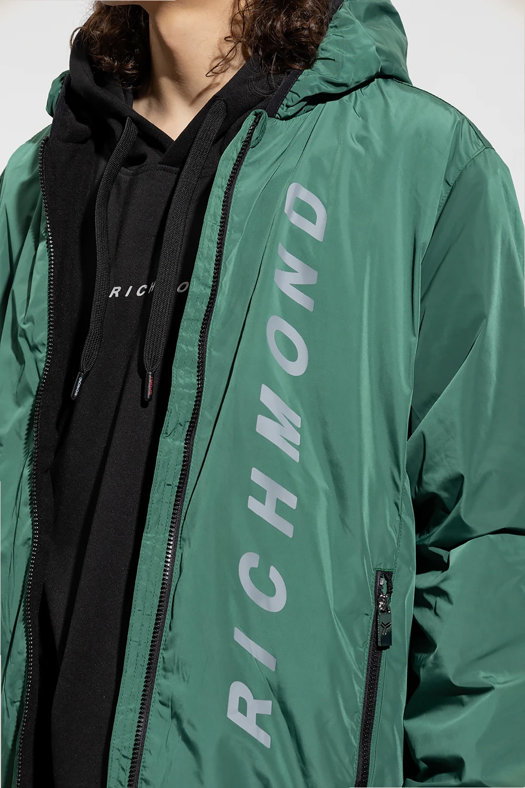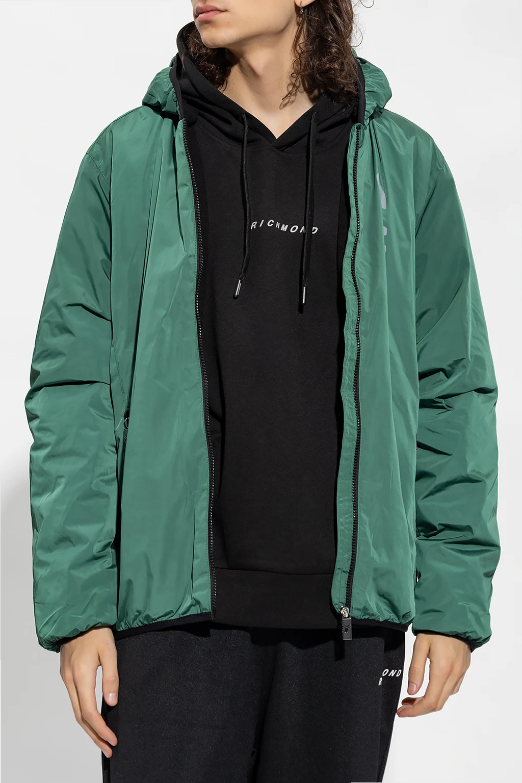 Zielona, cienka kurtka z kapturem John Richmond. Zapinana na zamek. Z przodu ozdobiona nadrukowanym logo w kolorze szarym. Dwie kieszenie zapinane na zamek. Długie rękawy oraz dół wykończone ściągaczem. Warstwa wewnętrzna ocieplana polarem.