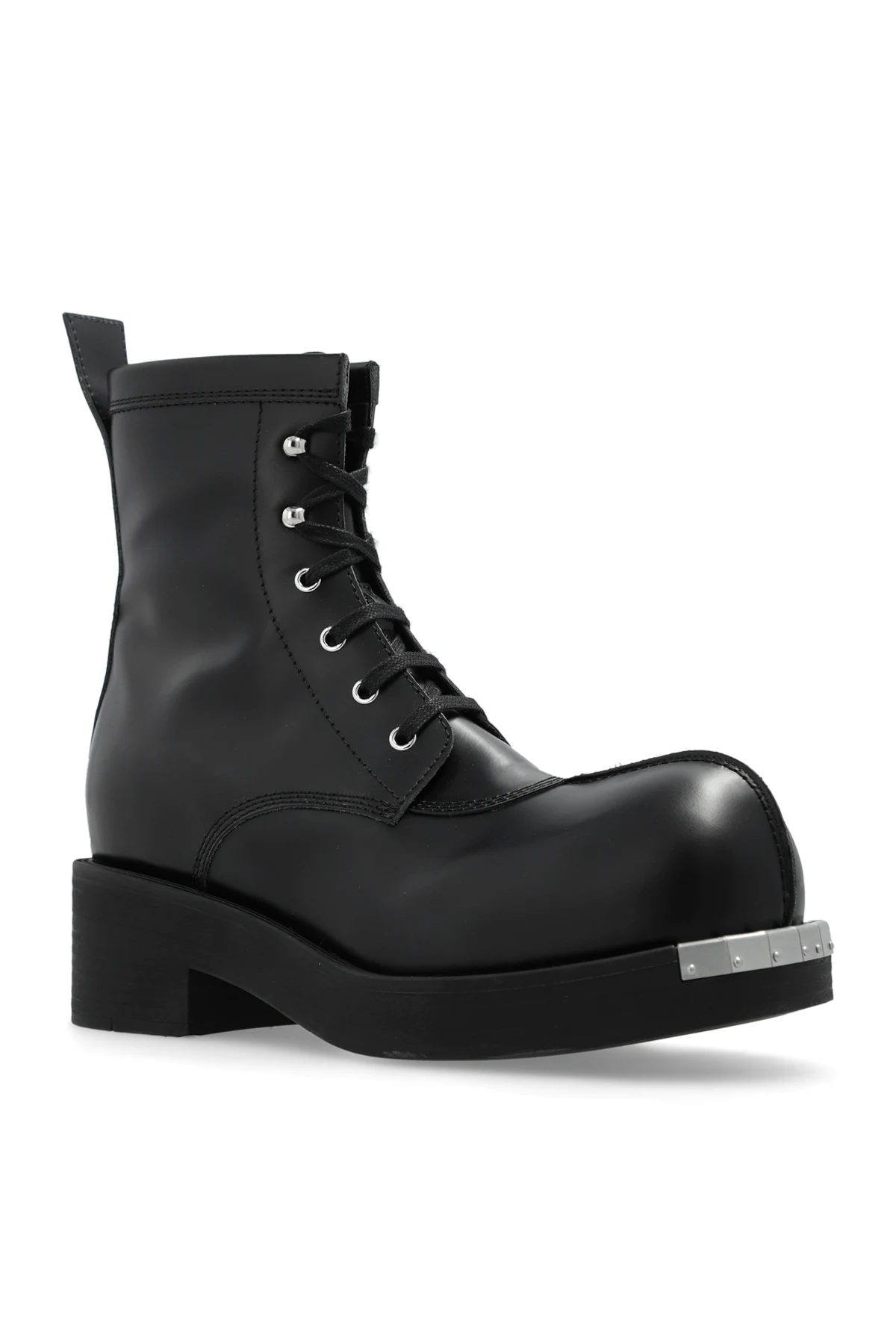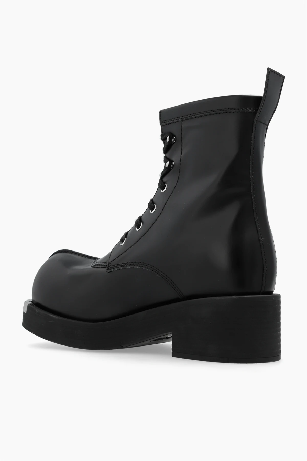 Czarne, sznurowane buty za kostkę MM6 Maison Margiela. Wykonane ze skóry. Na nosku dekoracyjny szew i metalowe aplikacje w kolorze srebrnym. Czarna, gumowa podeszwa.