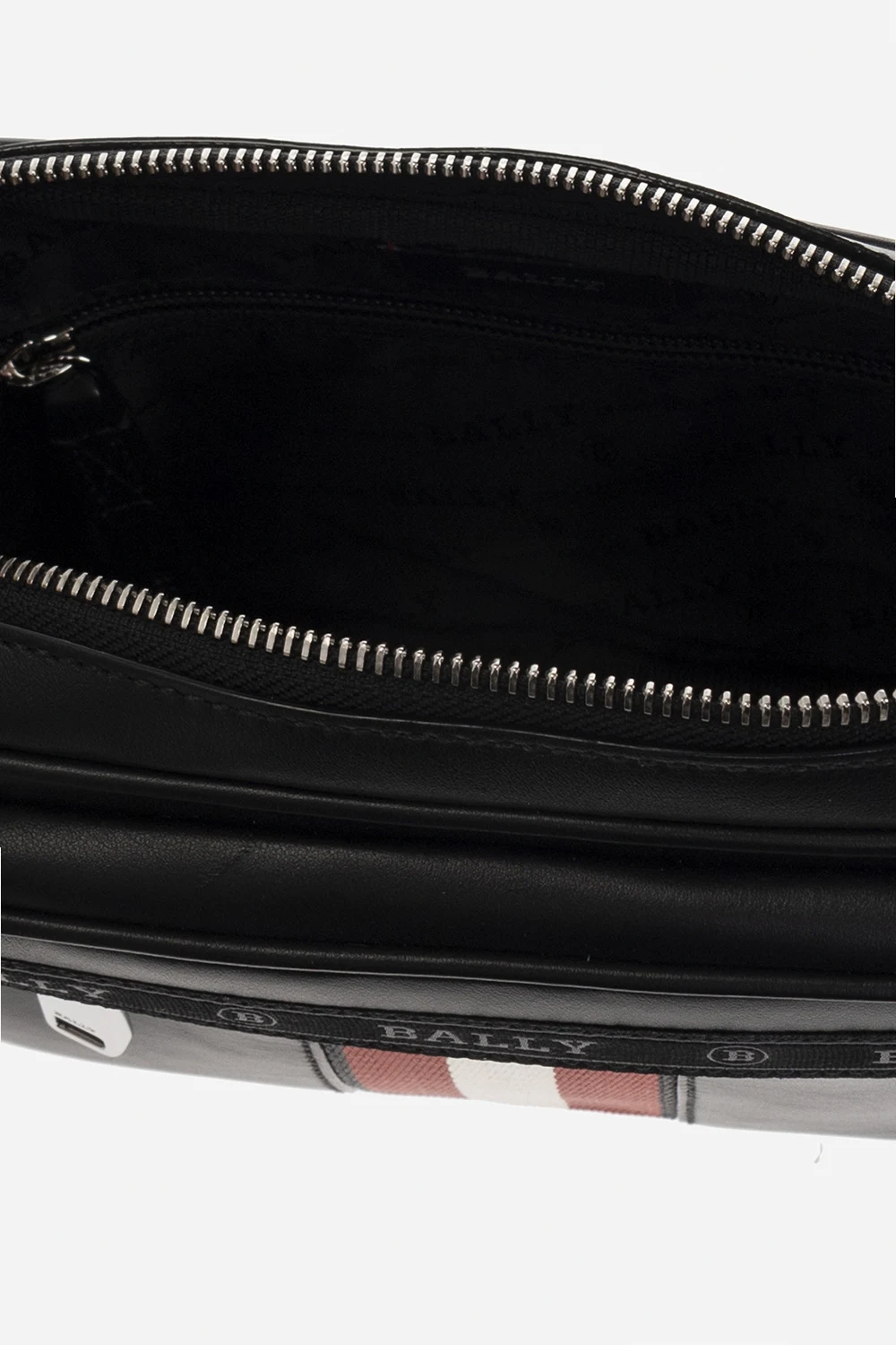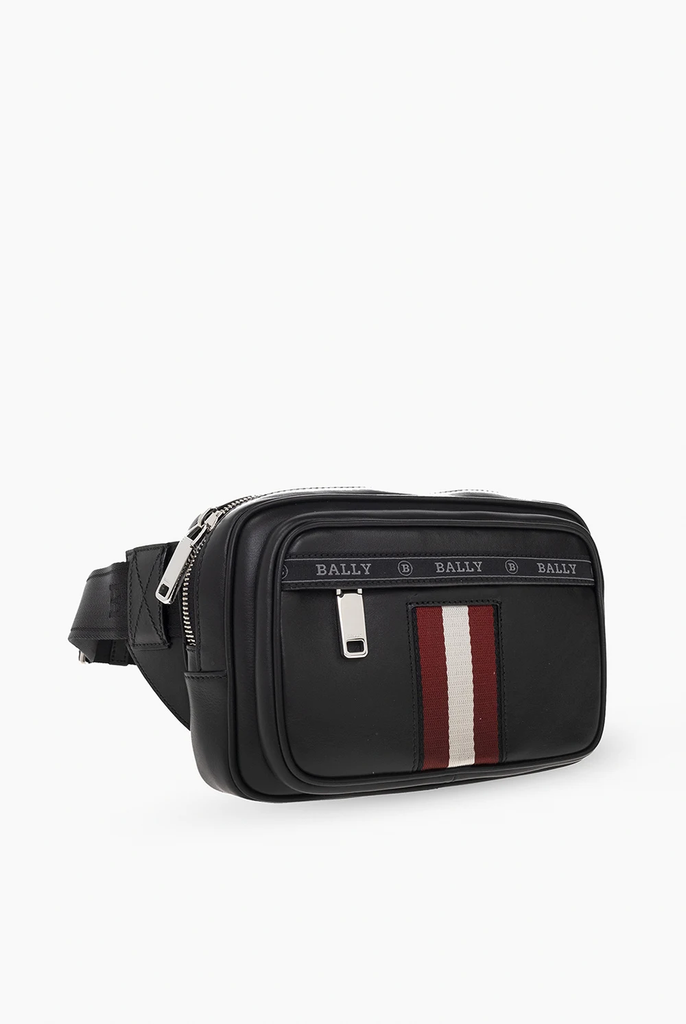 Czarna torba na pas, model ‘Hilbert’ Bally. Wykonana ze skóry. Zamykana na zamek. Z przodu charakterystyczny dla marki pasek w kolorze czerwono-biało-czerwonym oraz taśma z logo. Z przodu i z tyłu kieszenie z zamknięciem na zamek. Regulowany pas z zapięciem na klamrę. Wewnątrz komora z dwiema kieszeniami: wsuwaną oraz zamykaną na zamek i dwoma miejscami na kartę. Metalowe wykończenie w kolorze srebrnym.