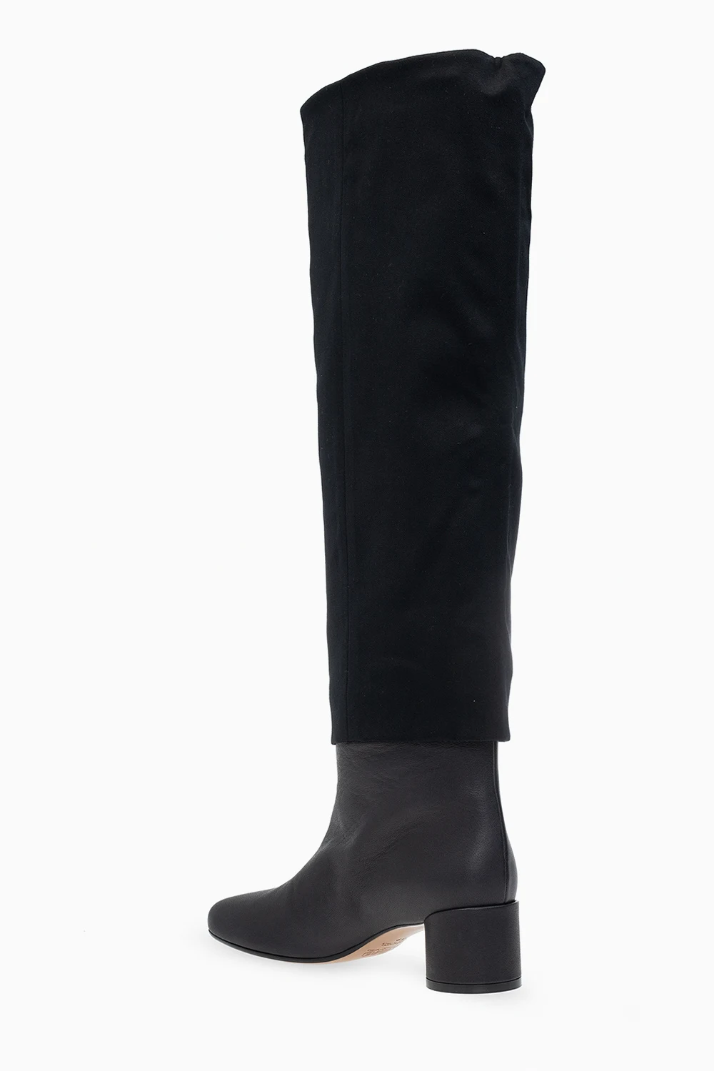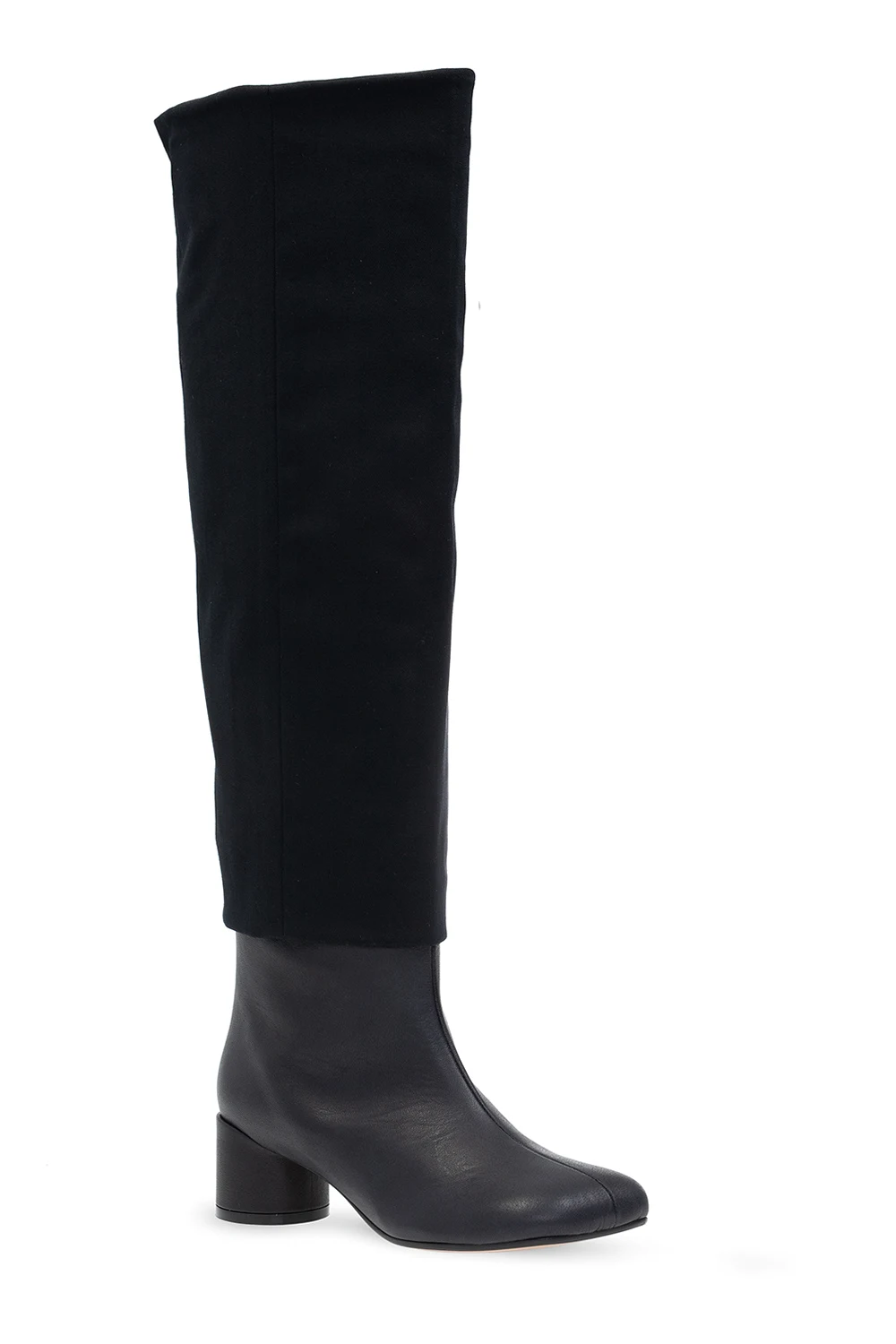 Czarne kozaki MM6 Maison Margiela. Wykonane ze skóry i materiału. Asymetryczny, kwadratowy nosek. Słupkowy obcas. Beżowa, skórzana podeszwa.