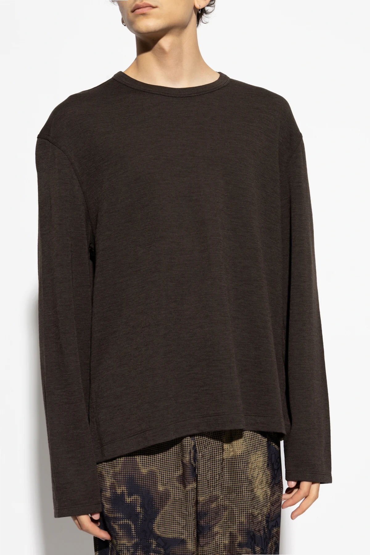 Ten ciemnobrązowy T-shirt charakteryzuje się klasycznym prostym krojem oraz długimi rękawami, co czyni go idealnym wyborem na chłodniejsze dni. Okrągły dekolt typu crew neck dodaje mu klasycznego uroku. Materiał, z którego został wykonany, jest niezwykle miękki i przyjemny w dotyku, co zapewnia komfort noszenia.