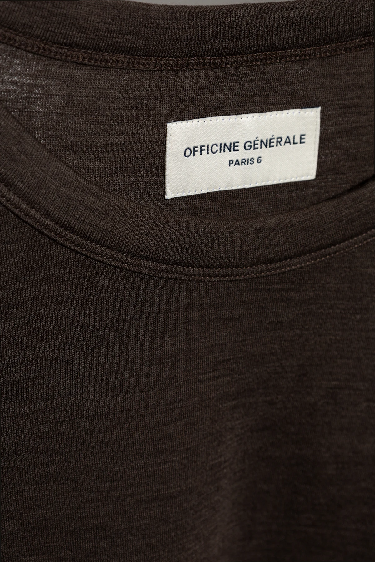 T-shirt "Benny" jest jednolity, bez widocznych wzorów, co podkreśla jego elegancki i minimalistyczny charakter. Drobny detal, jakim jest metka z napisem "OFFICINE GÉNÉRALE PARIS 6", dyskretnie umieszczona na zbliżeniu, potwierdza ekskluzywność tego produktu.