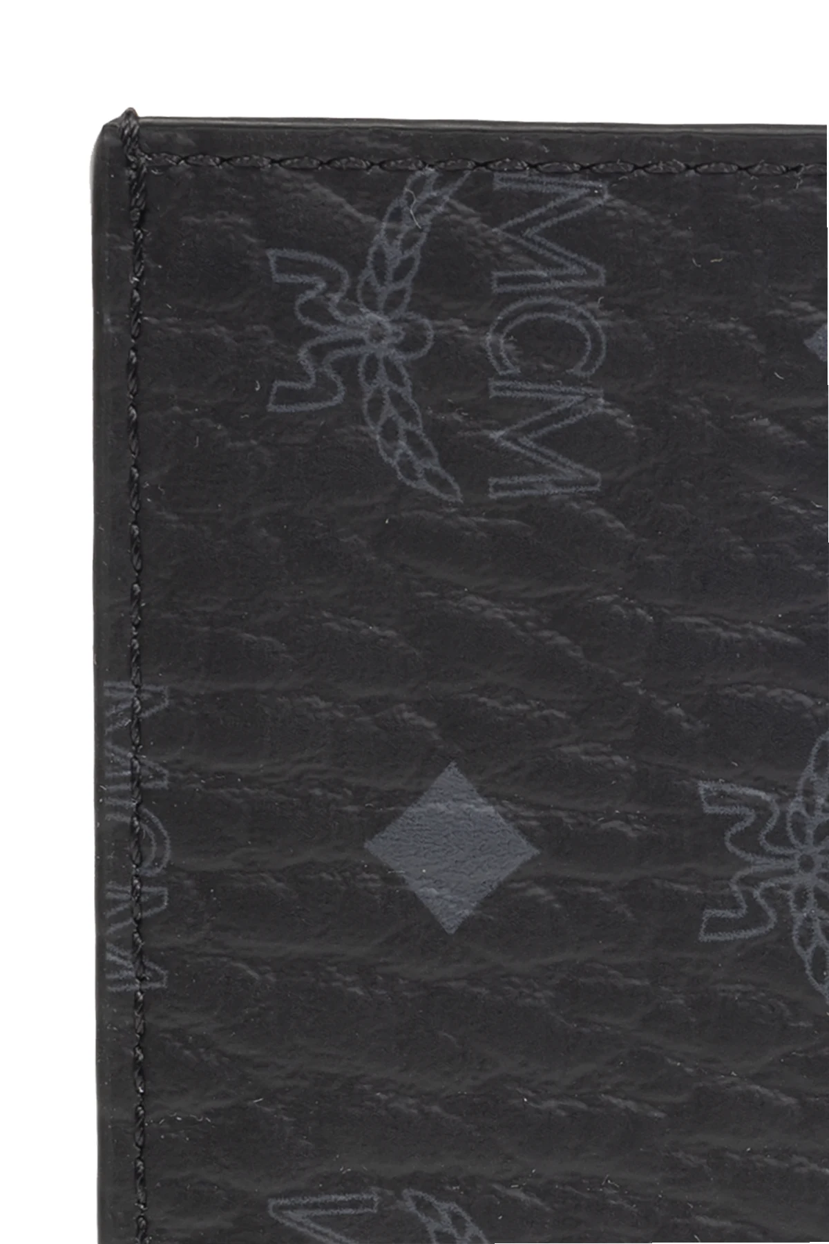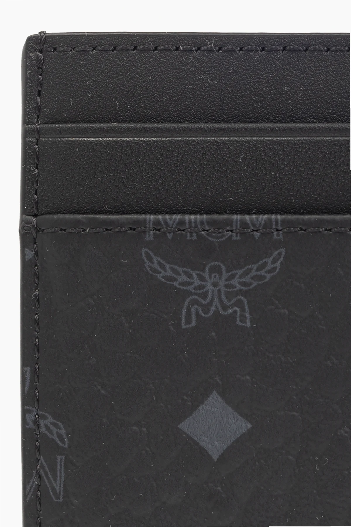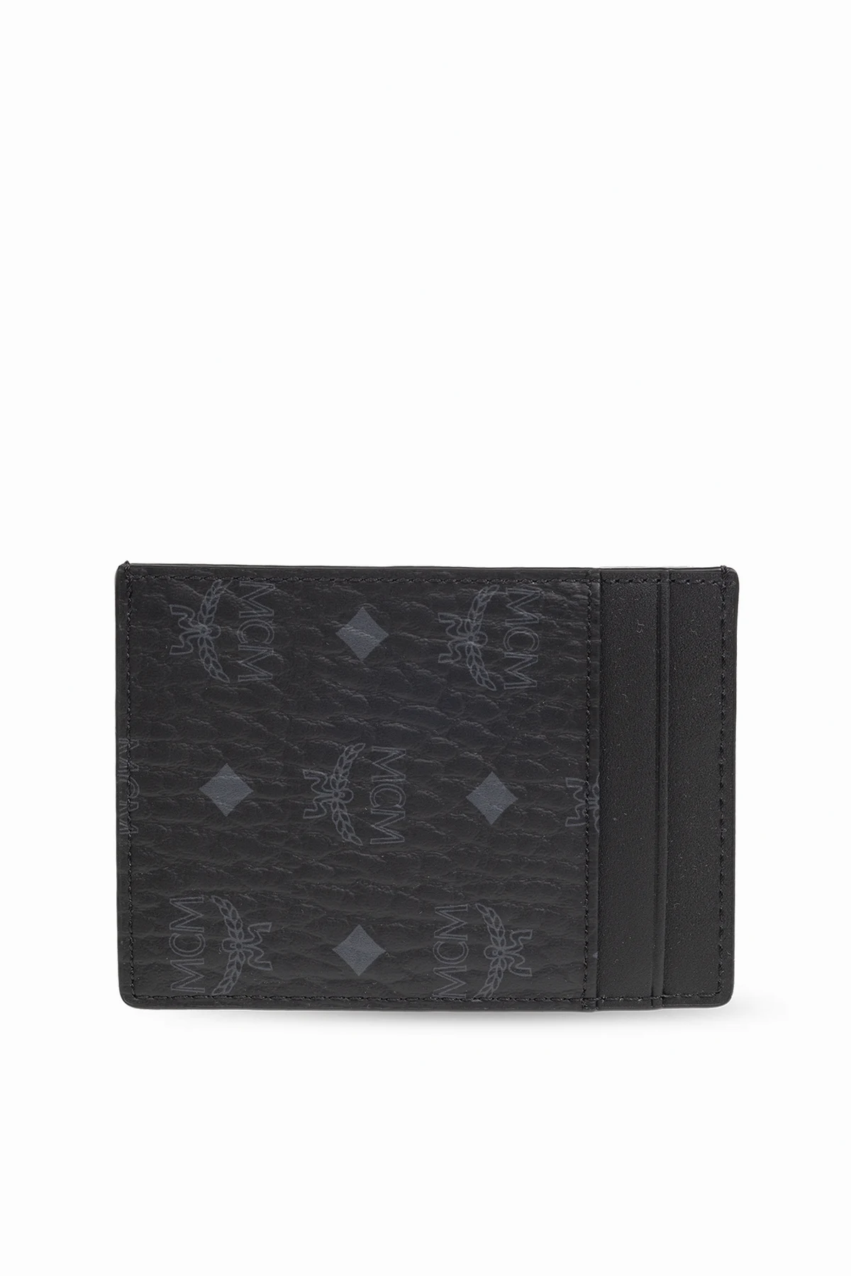 Czarne etui na karty MCM. Wykonane z płótna imitującego skórę. Ozdobione szarym wzorem z logo. Cztery miejsca na karty. Wewnątrz komora.