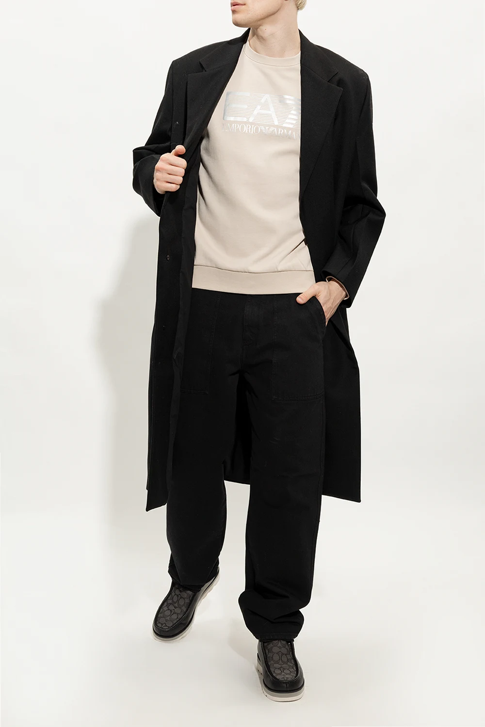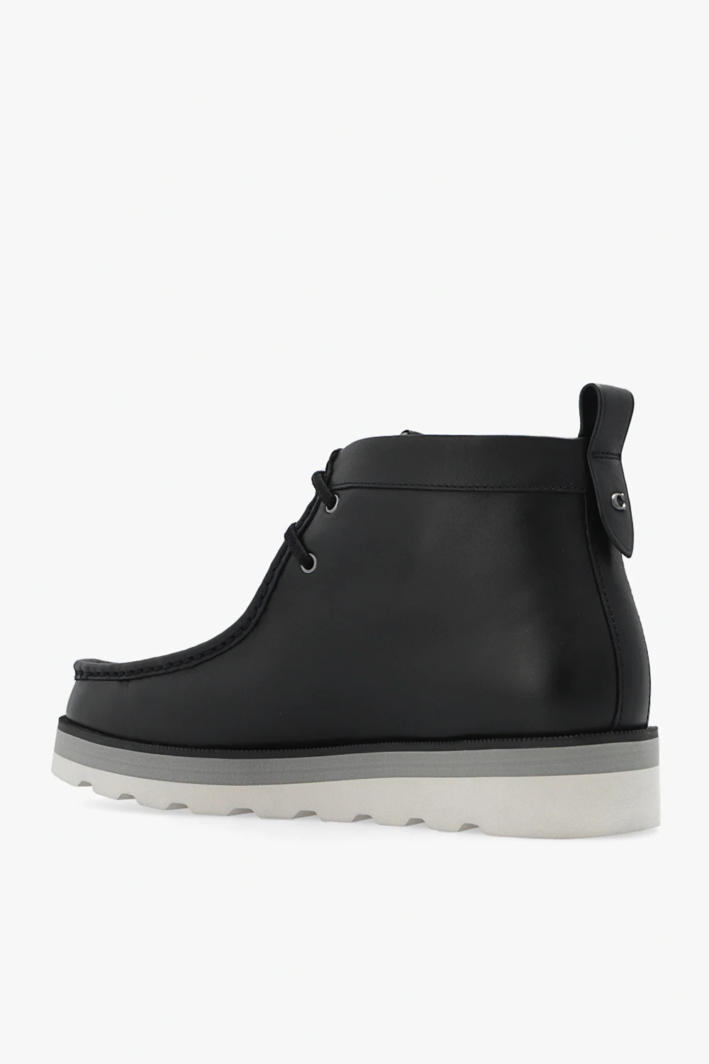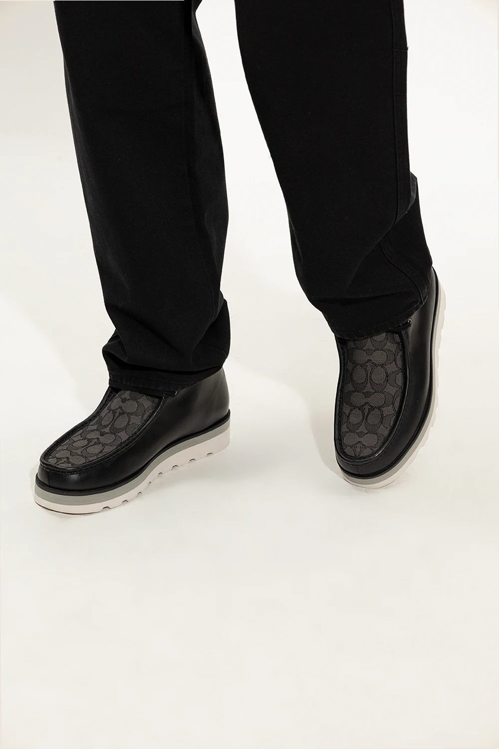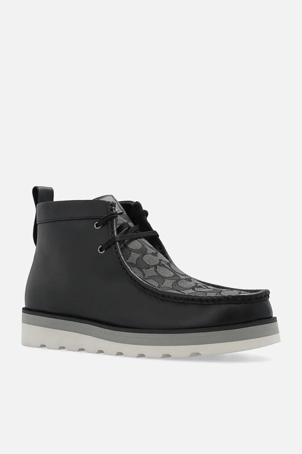 Czarno-szare, sznurowane buty za kostkę, model ‘Sig’ Coach. Wykonane ze skóry oraz wykończone materiałem ozdobionym monogramem. Z przodu oraz z tyłu ozdobione logo. Biało-szara, gumowa podeszwa.