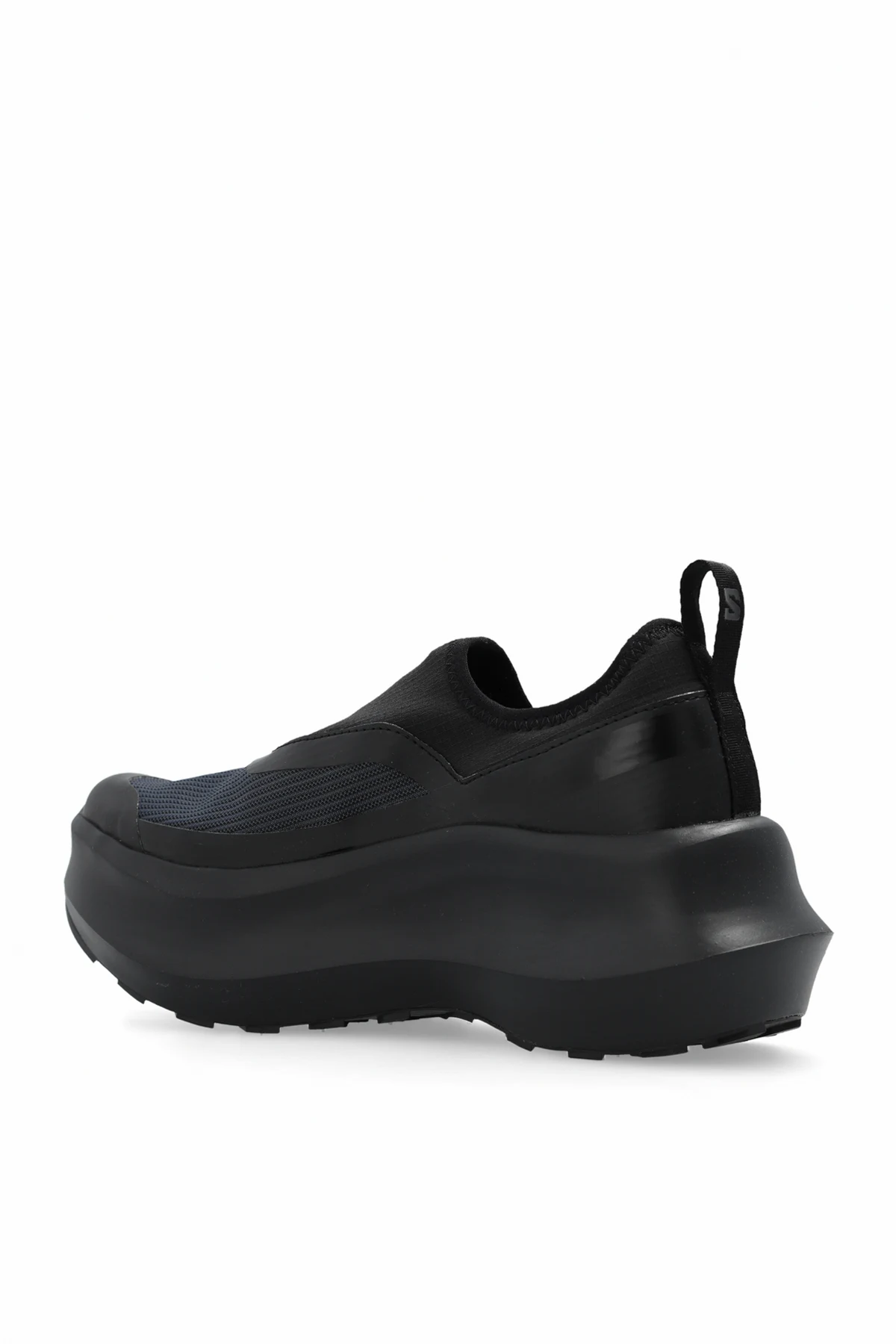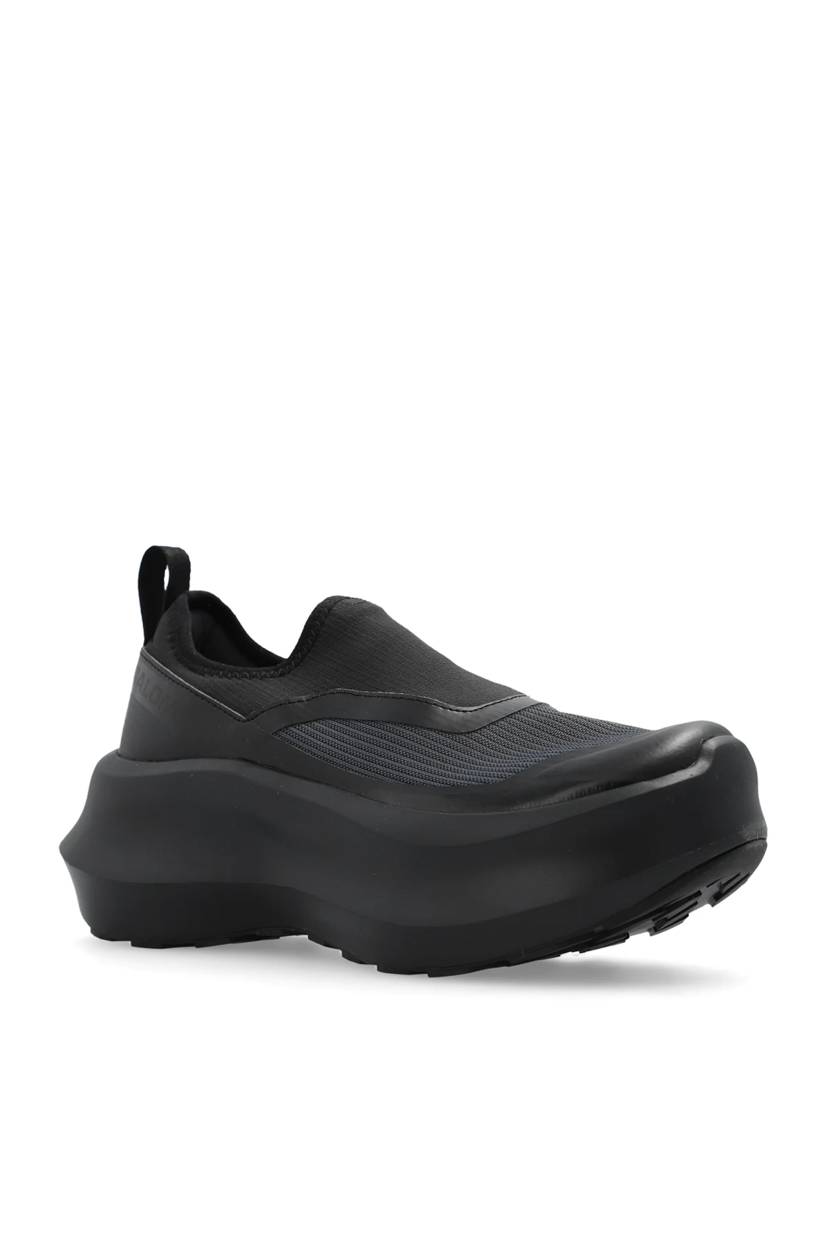 Czarne, wsuwane buty sportowe na platformie Comme des Garcons x Salomon. Wykonane z syntetycznego materiału i paneli z TPU. Z boku ozdobione logo. Czarna, gumowa podeszwa CONTAGRIP®.