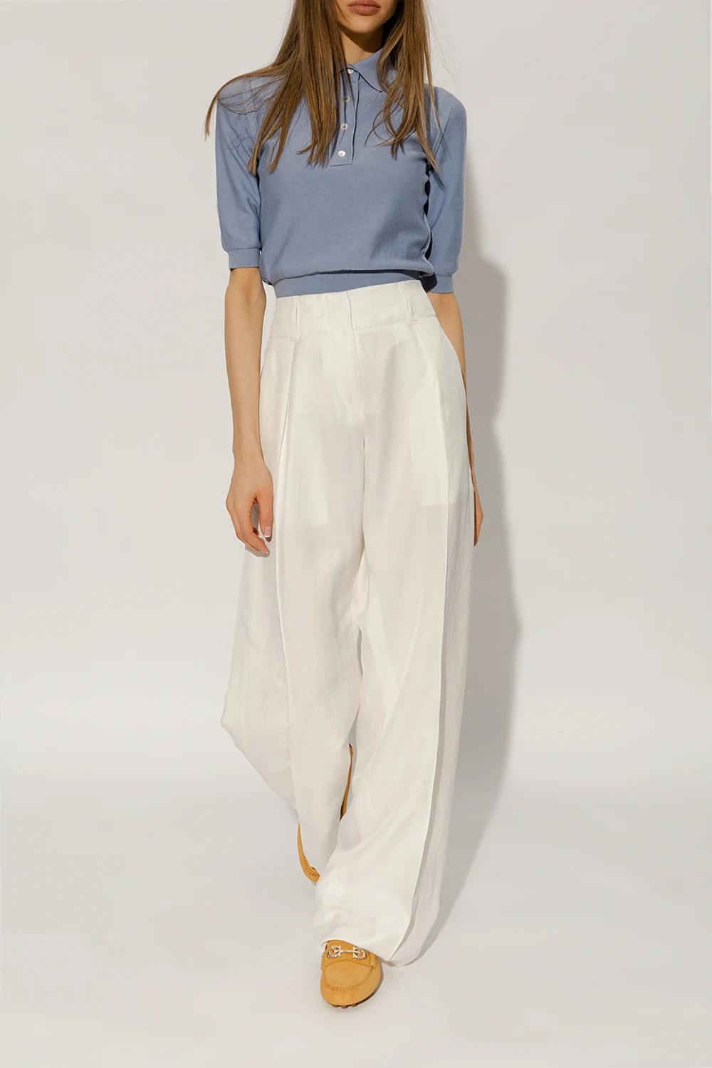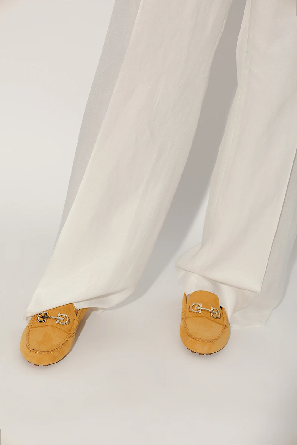 Żółte mokasyny, model ‘Odilia’ FERRAGAMO. Wykonane ze skóry. Z przodu ozdobione metalową aplikacją w kształcie logo w kolorze jasnego złota. Beżowa, gumowa podeszwa.