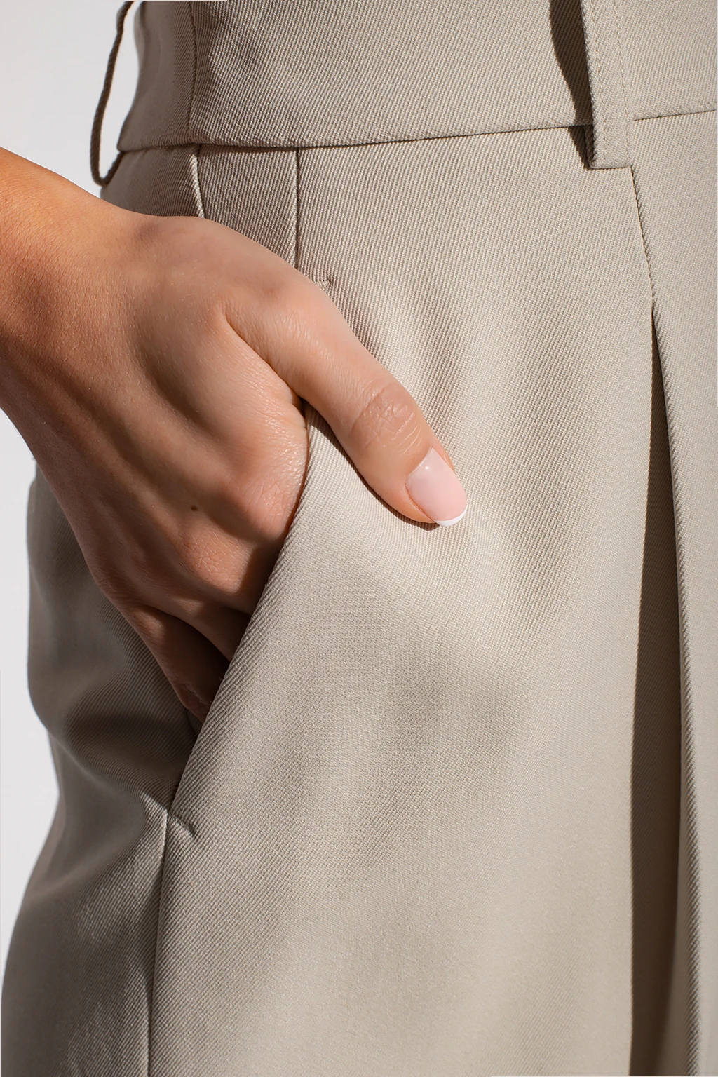 Jasnobeżowe, wełniane szorty w kant Michael Kors. Zapinane na zaczepy, guzik oraz zamek. Cztery kieszenie: dwie wsuwane z przodu oraz dwie zapinane na guziki z tyłu. Krótkie. Podwijane nogawki.